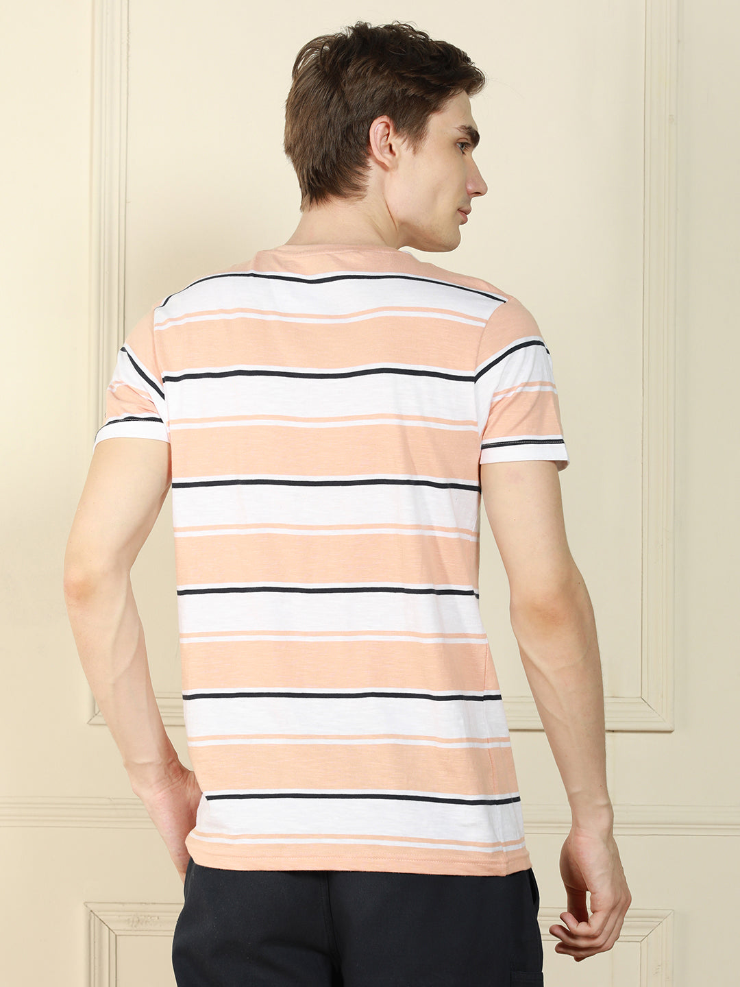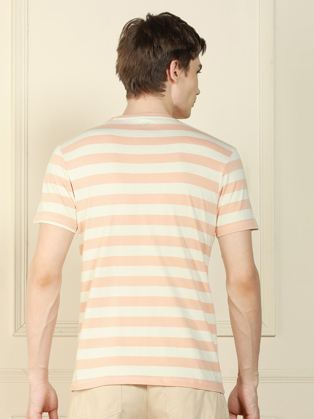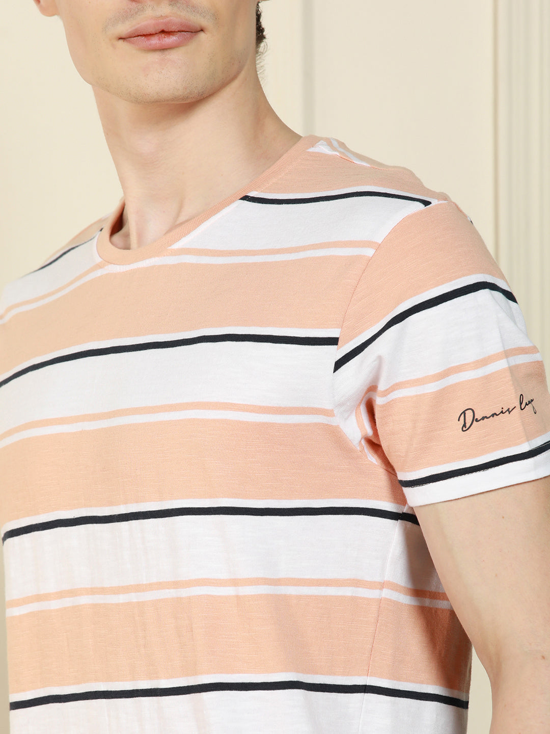Men's Peach Crew Neck Striped Cotton T-Shirt