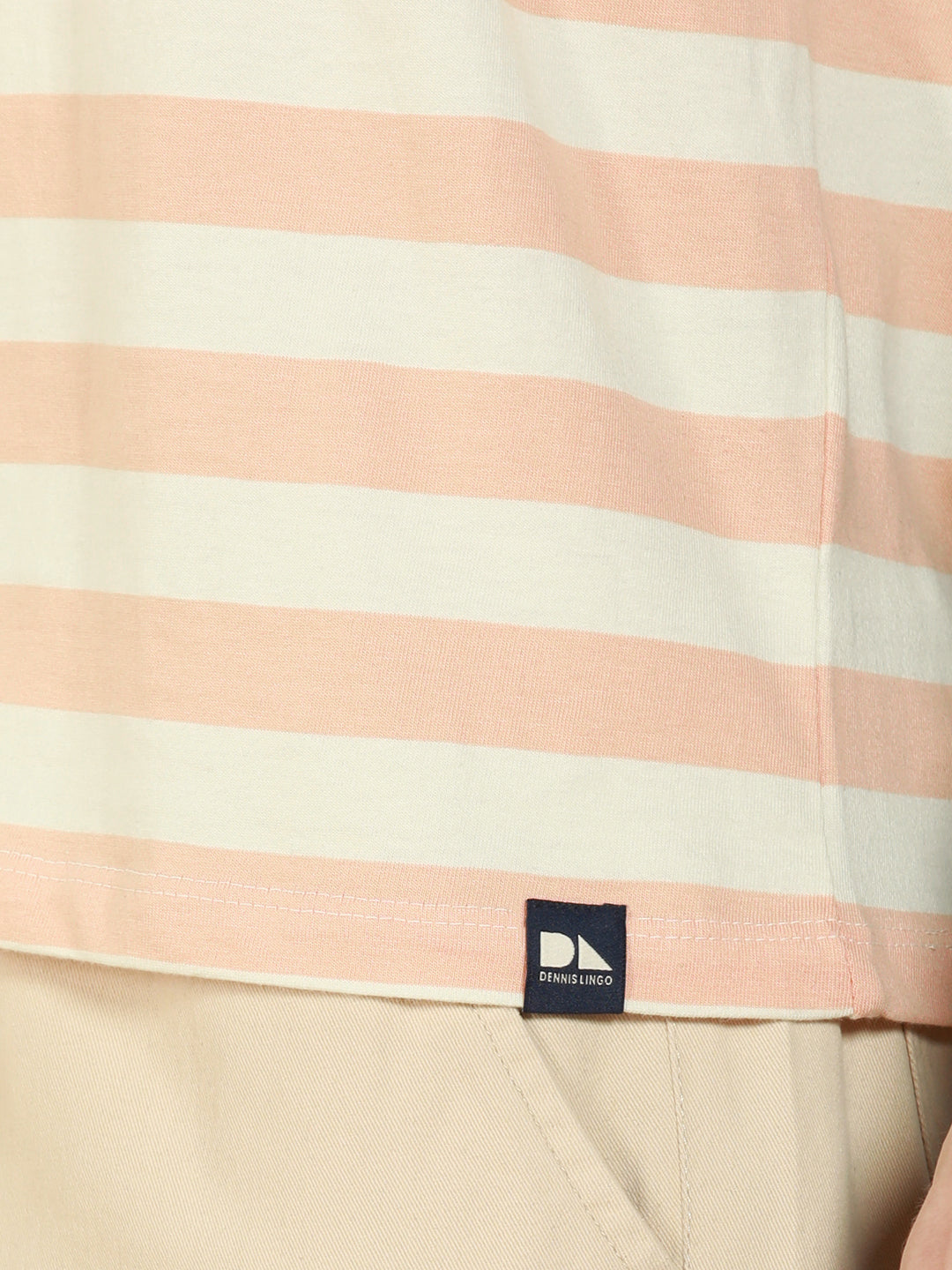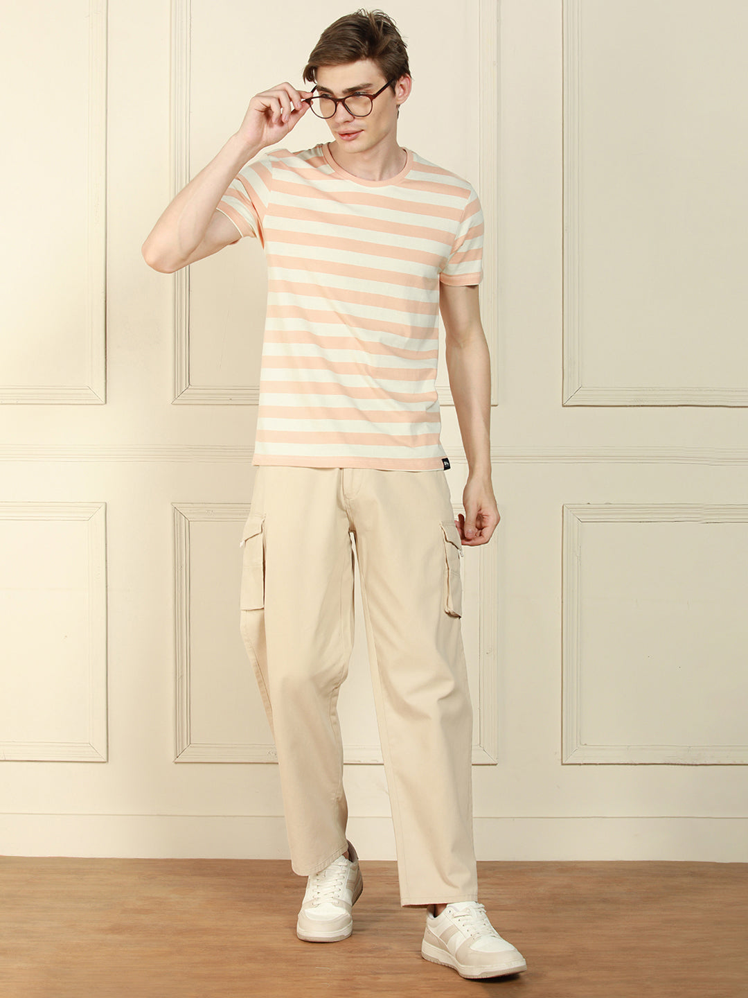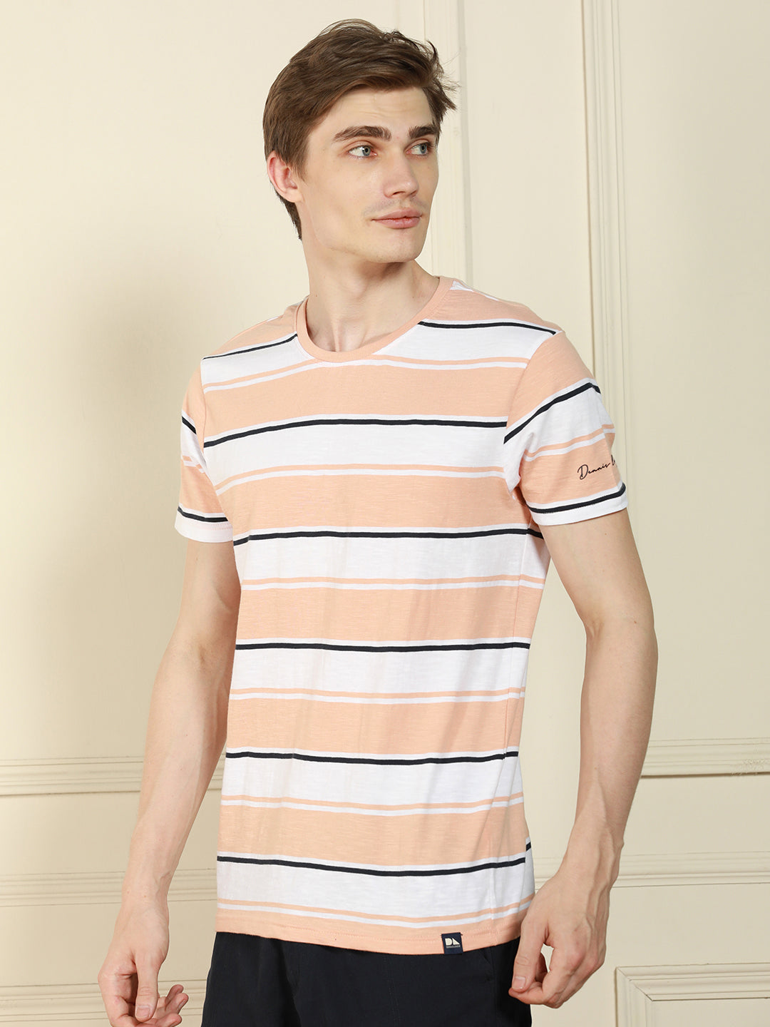 Men's Peach Crew Neck Striped Cotton T-Shirt