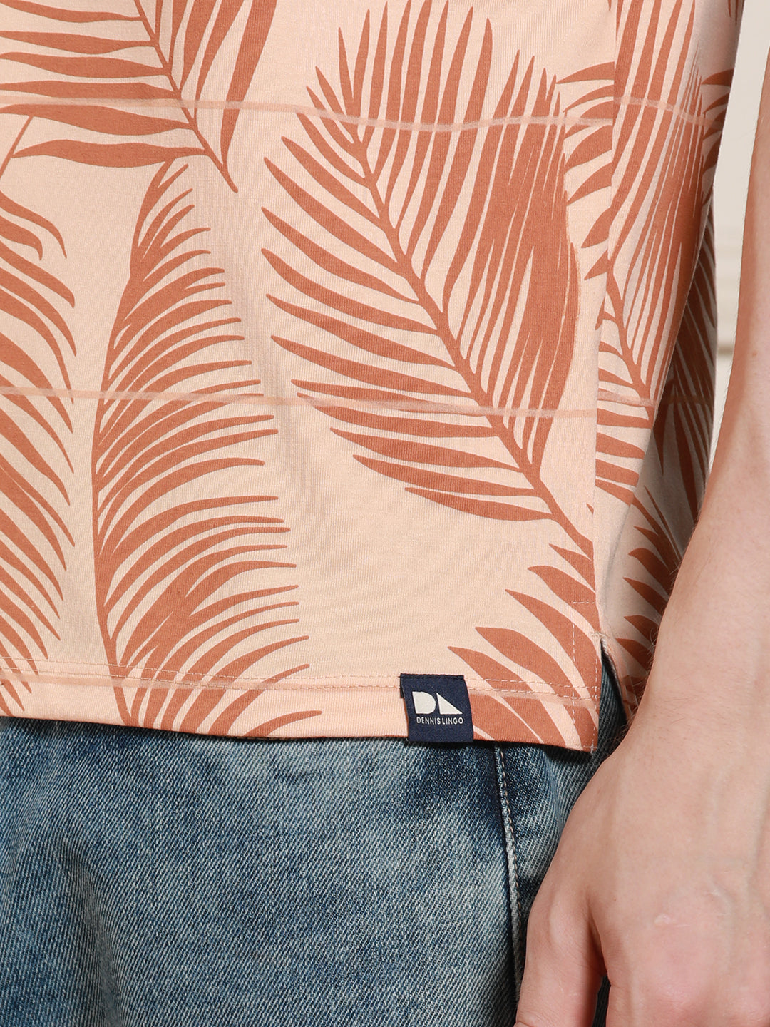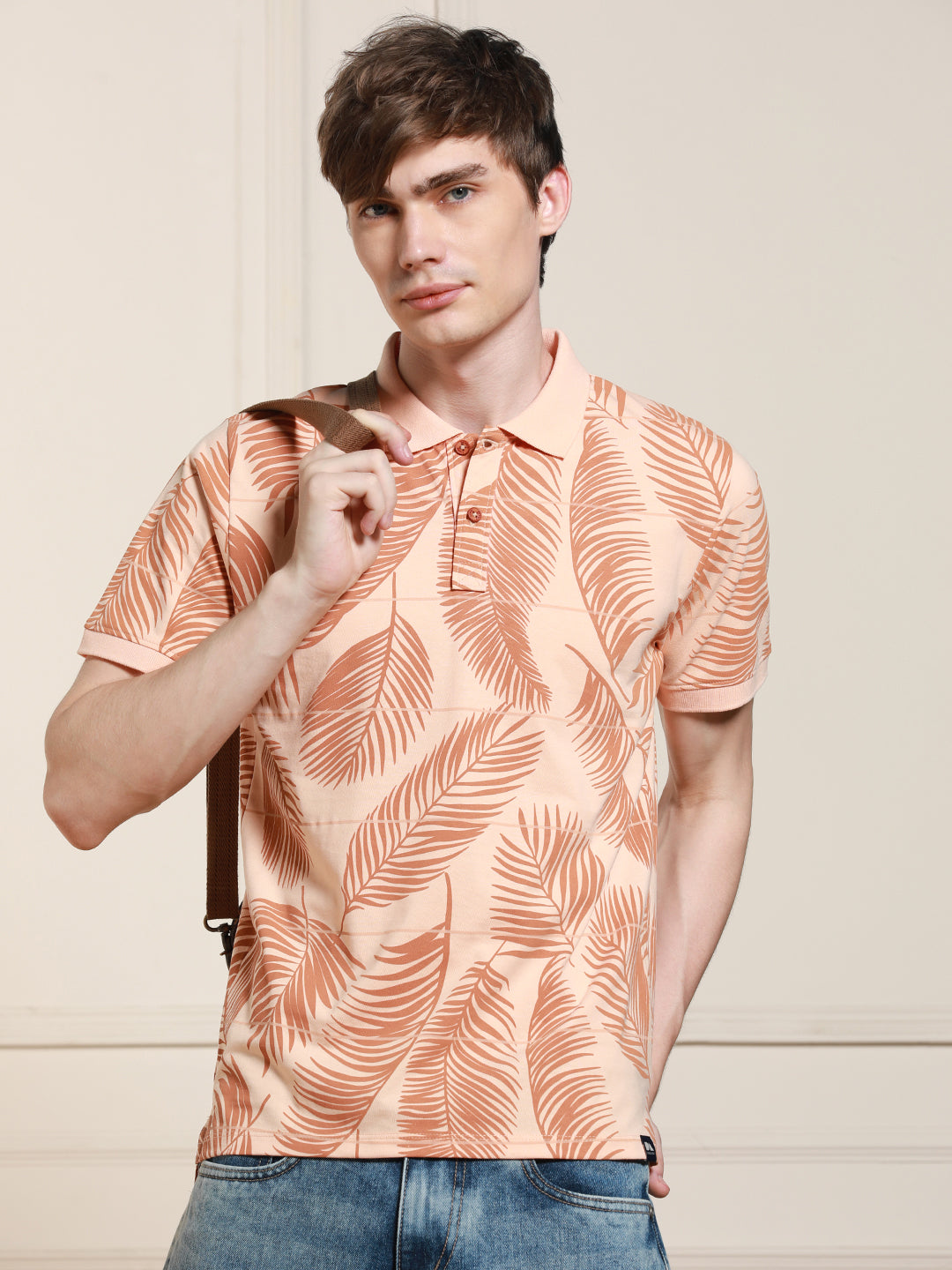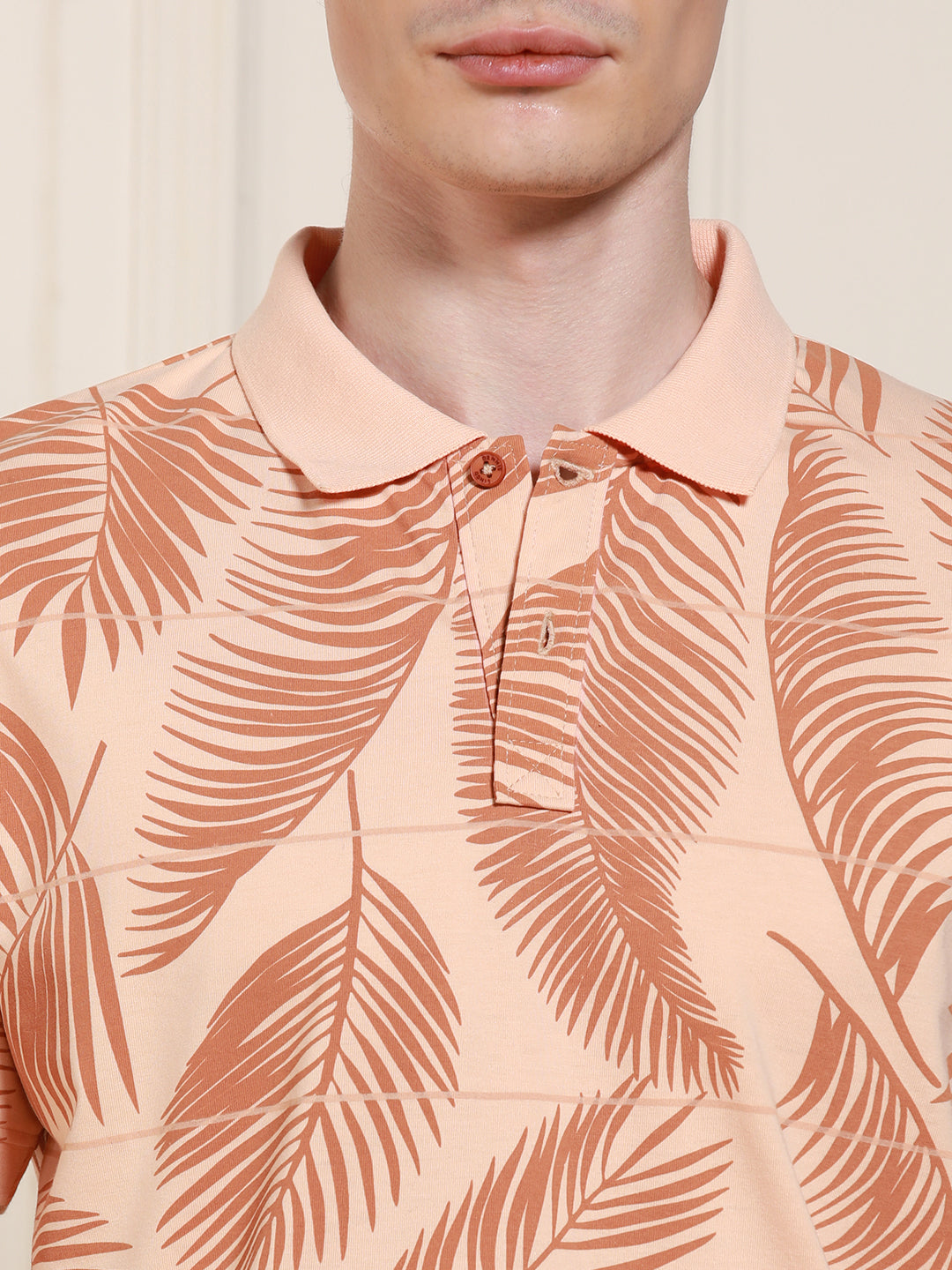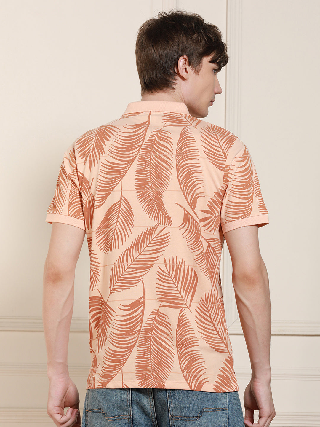 Men's Peach Printed Polo Collar Half Sleeves T-shirt