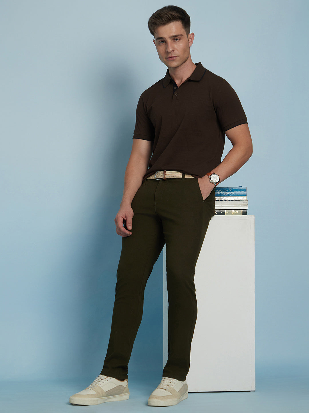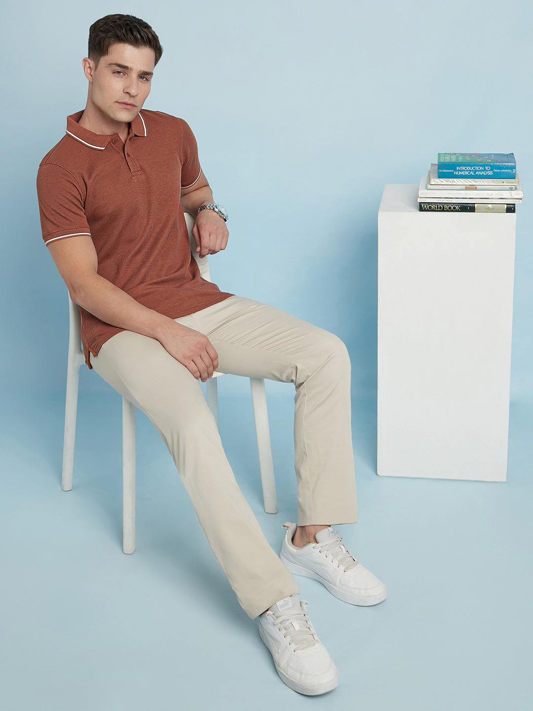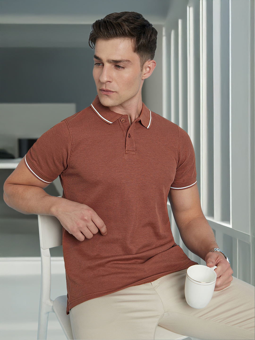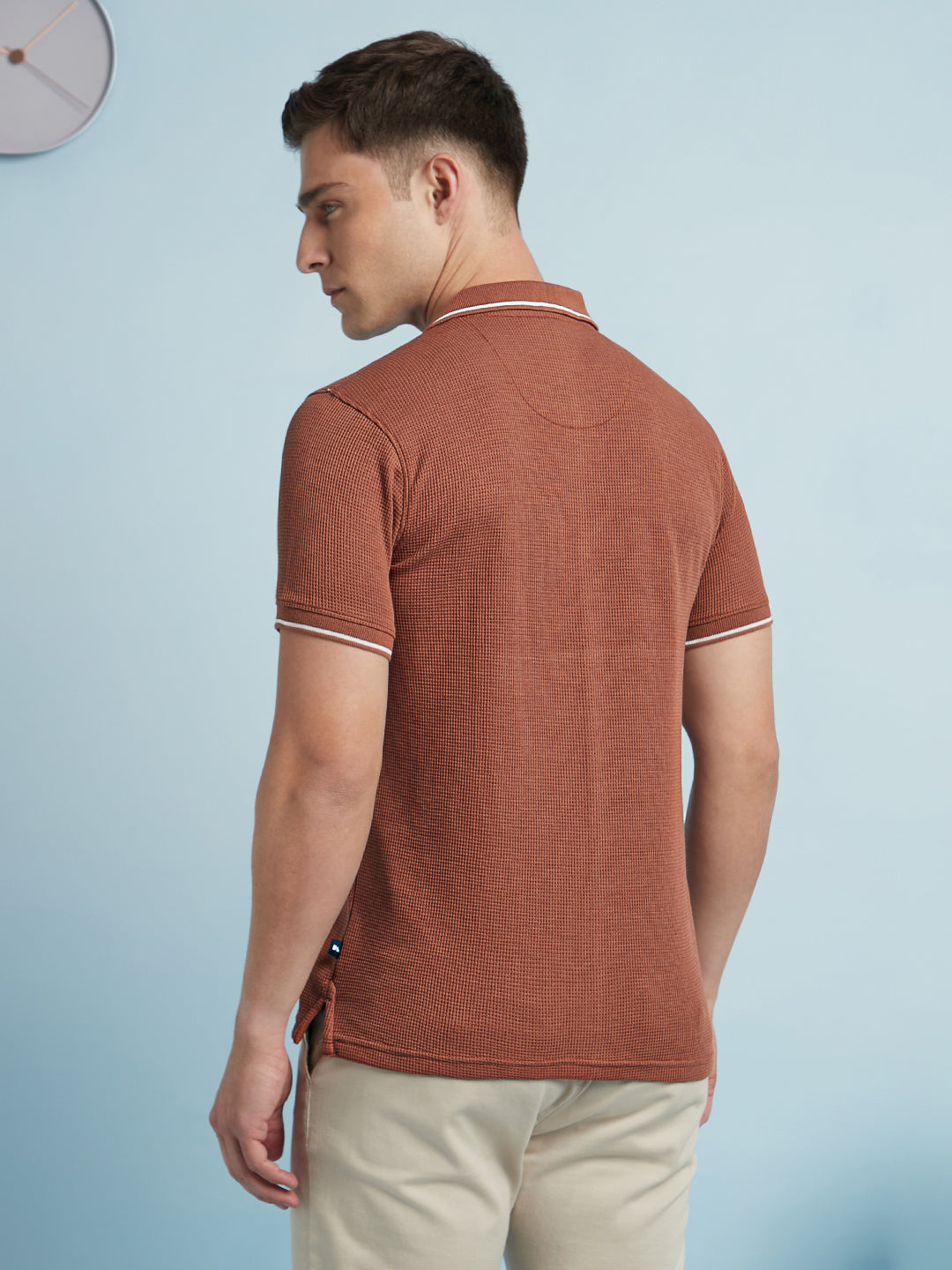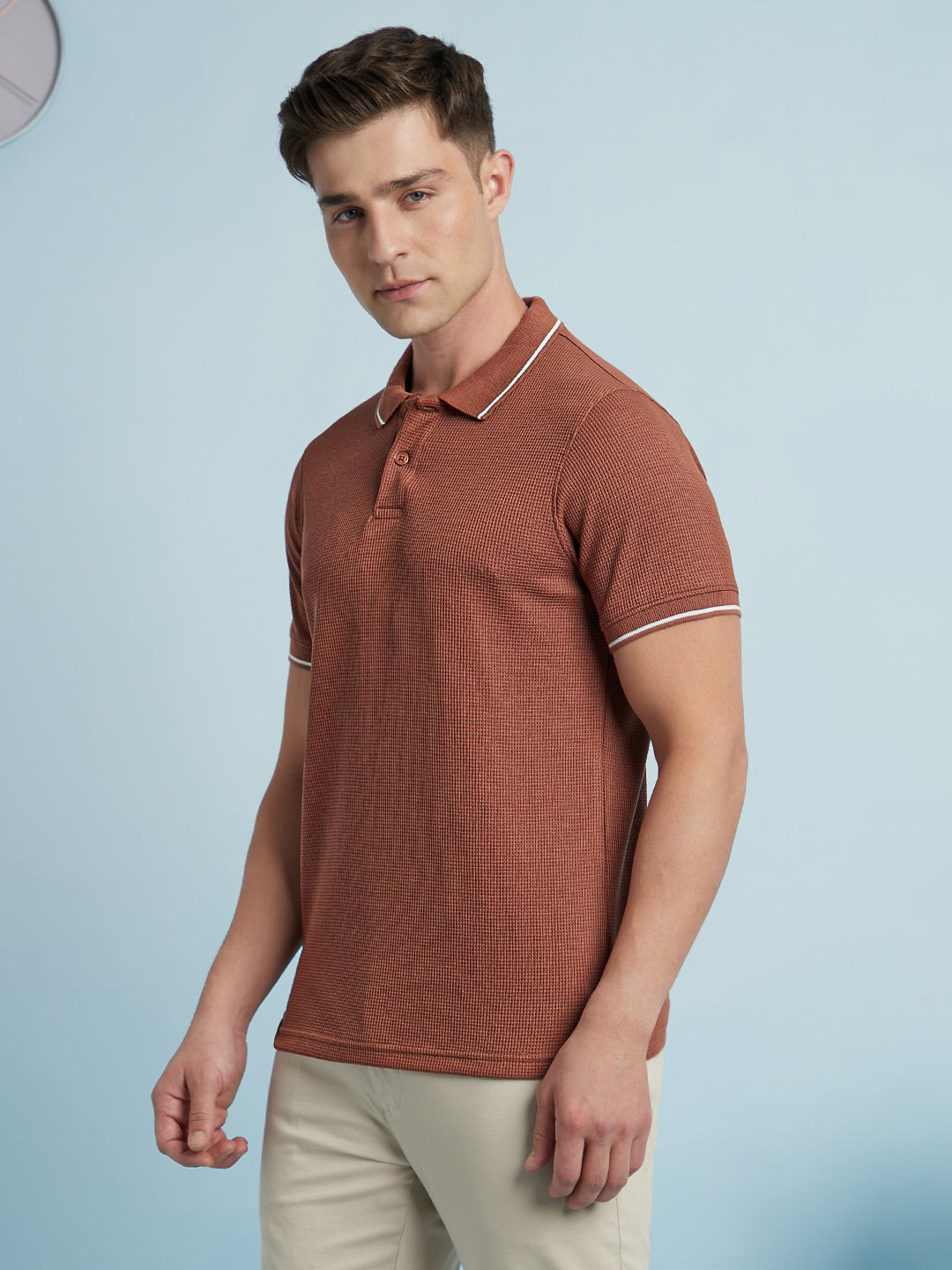 Men Rust Solid Textured Polo Collar Half Sleeves Regular Fit T-Shirt