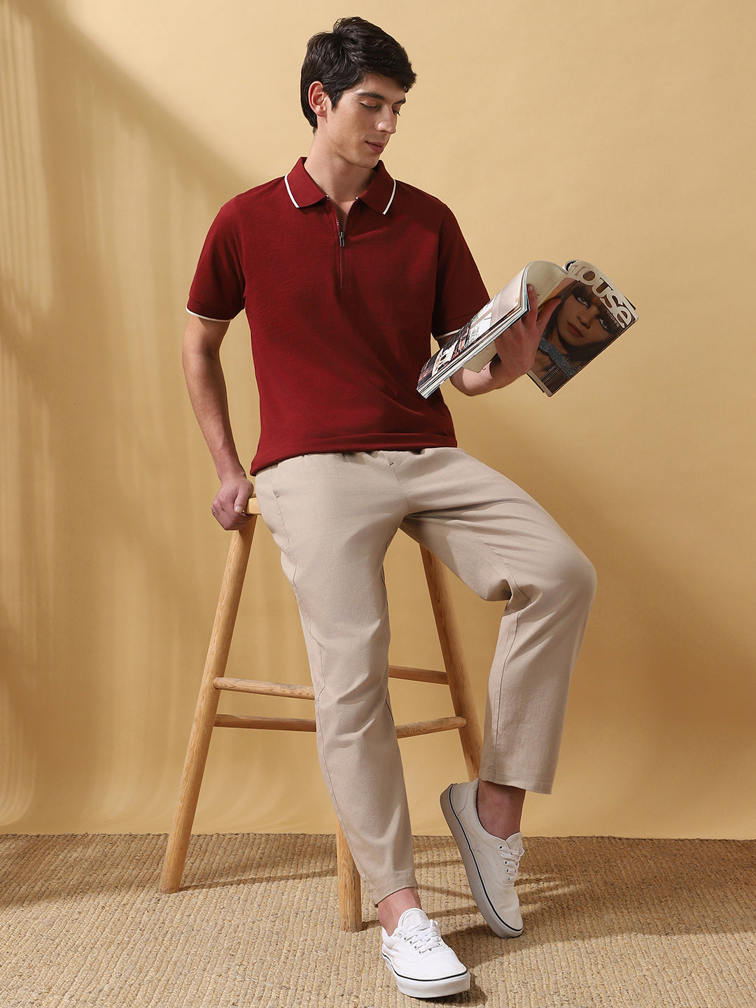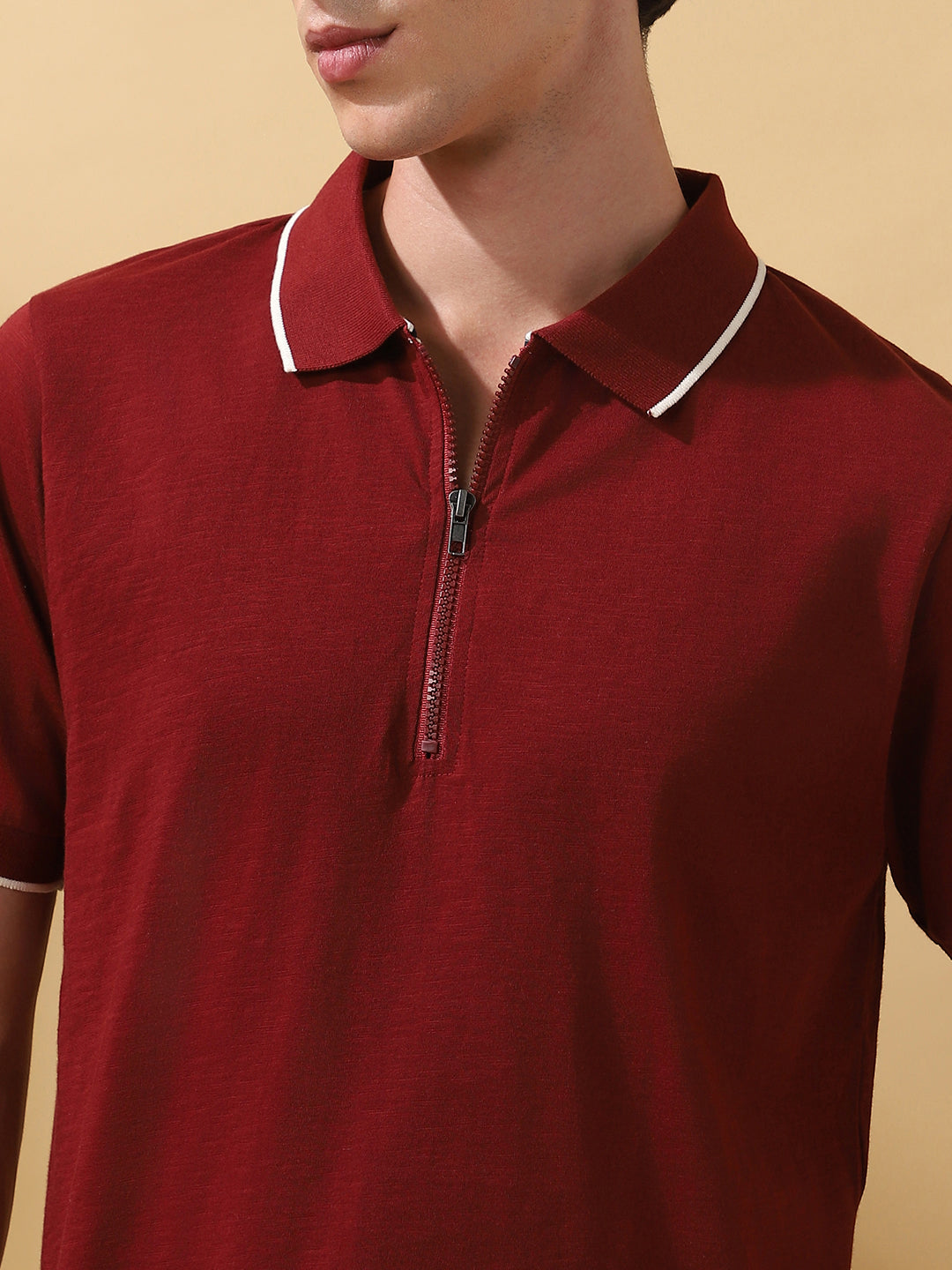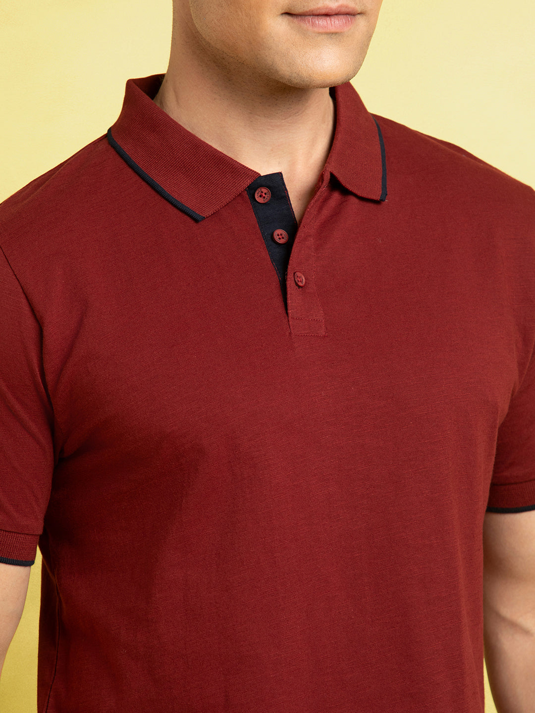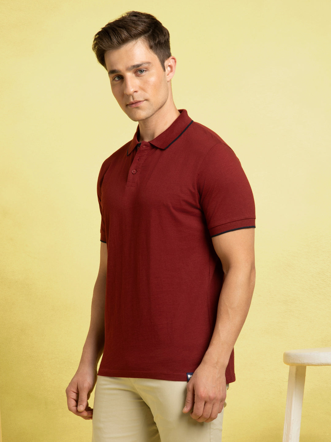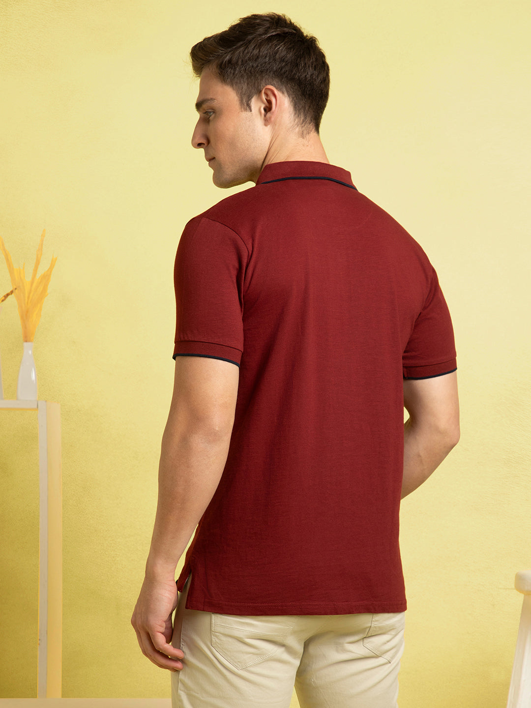 Men's Maroon Solid Polo Collar Half Sleeves T-shirt