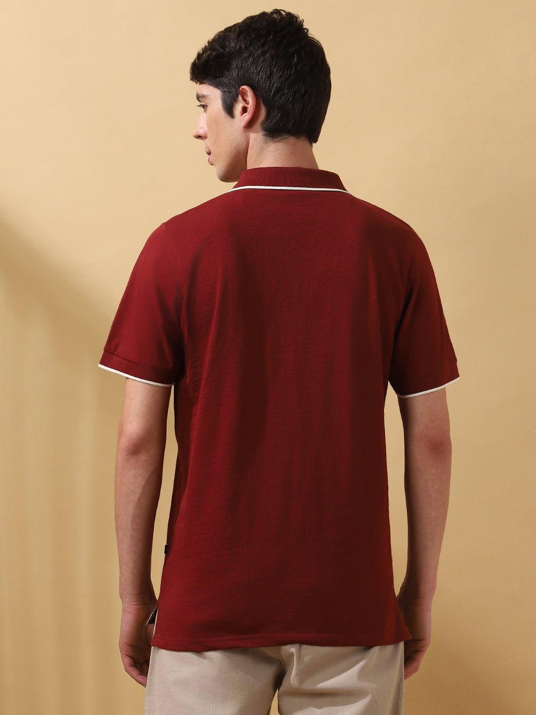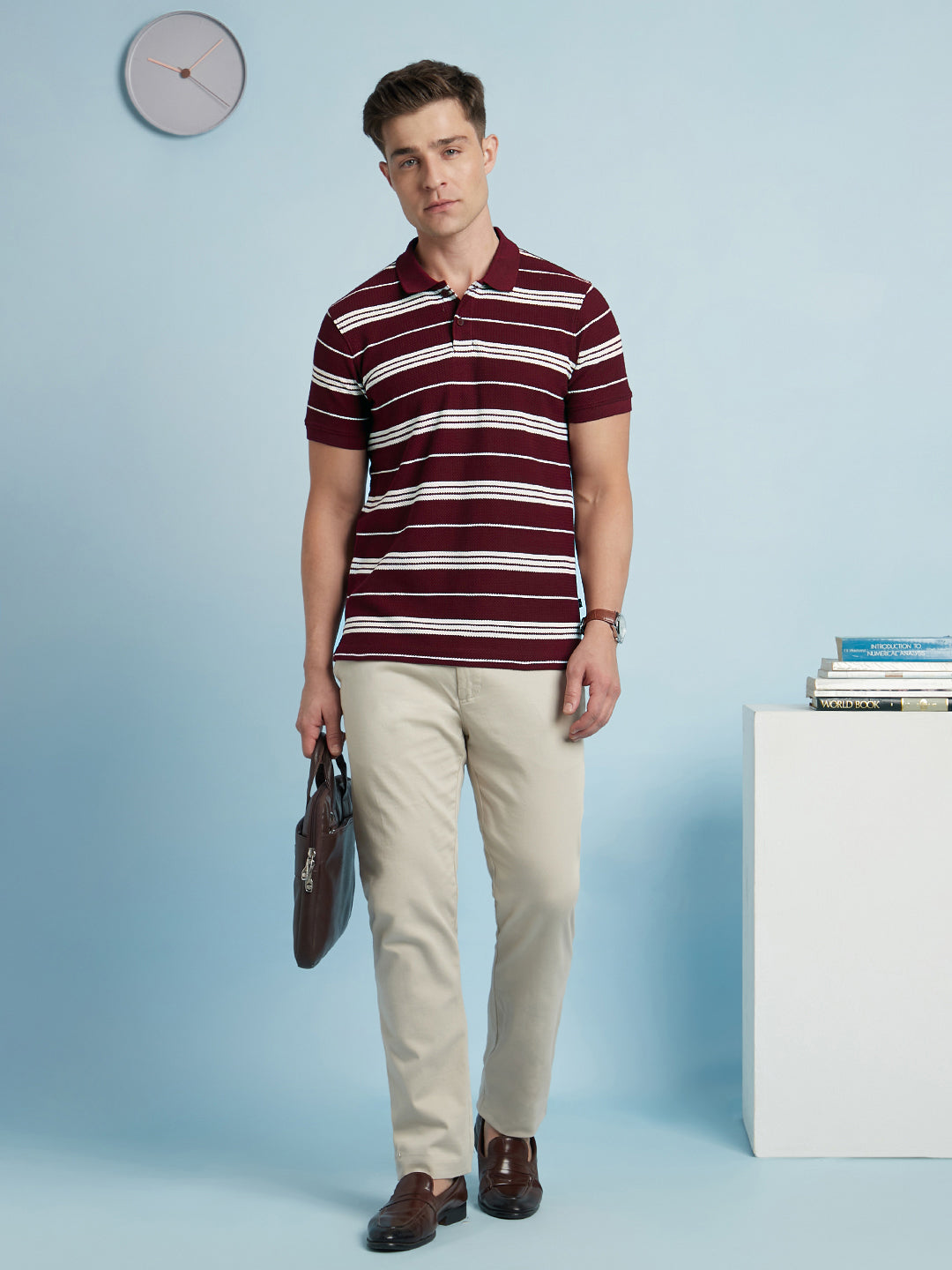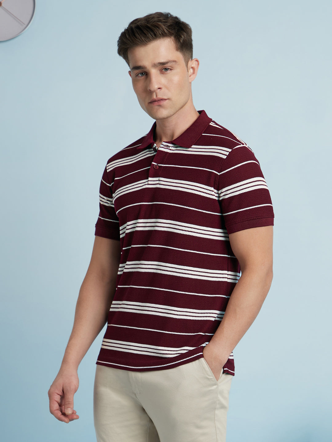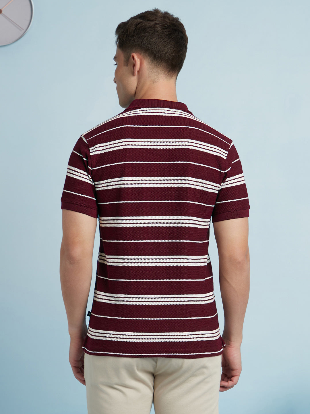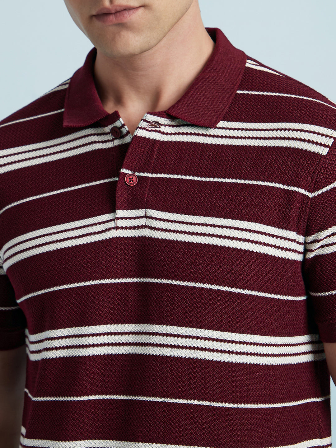 Men Maroon Textured Stripes Polo Collar Half Sleeves Regular Fit T-Shirt