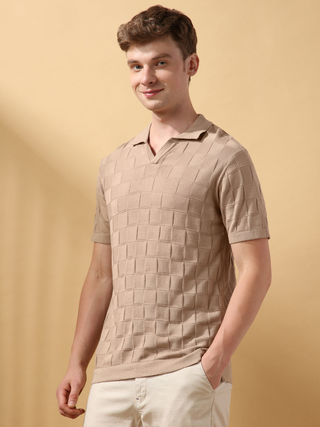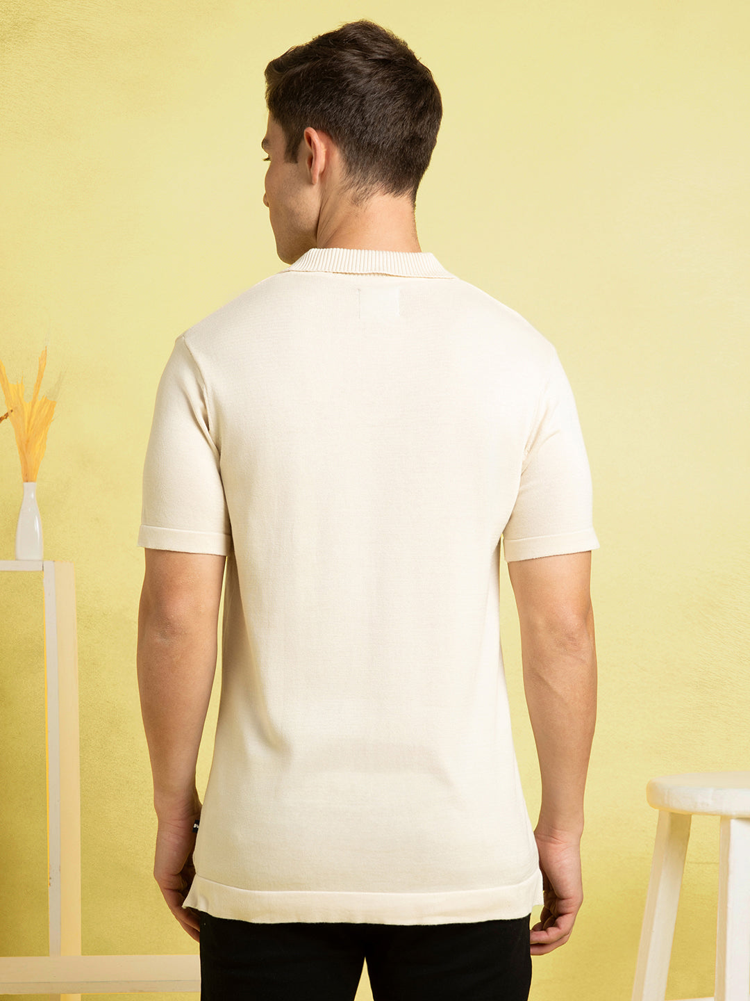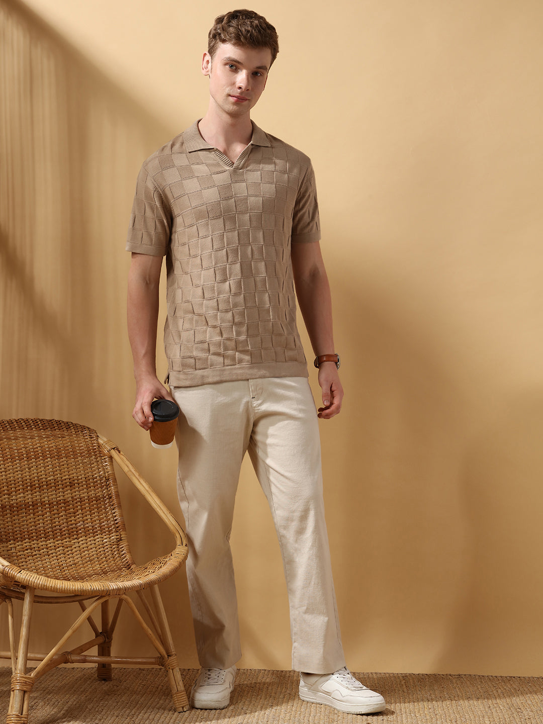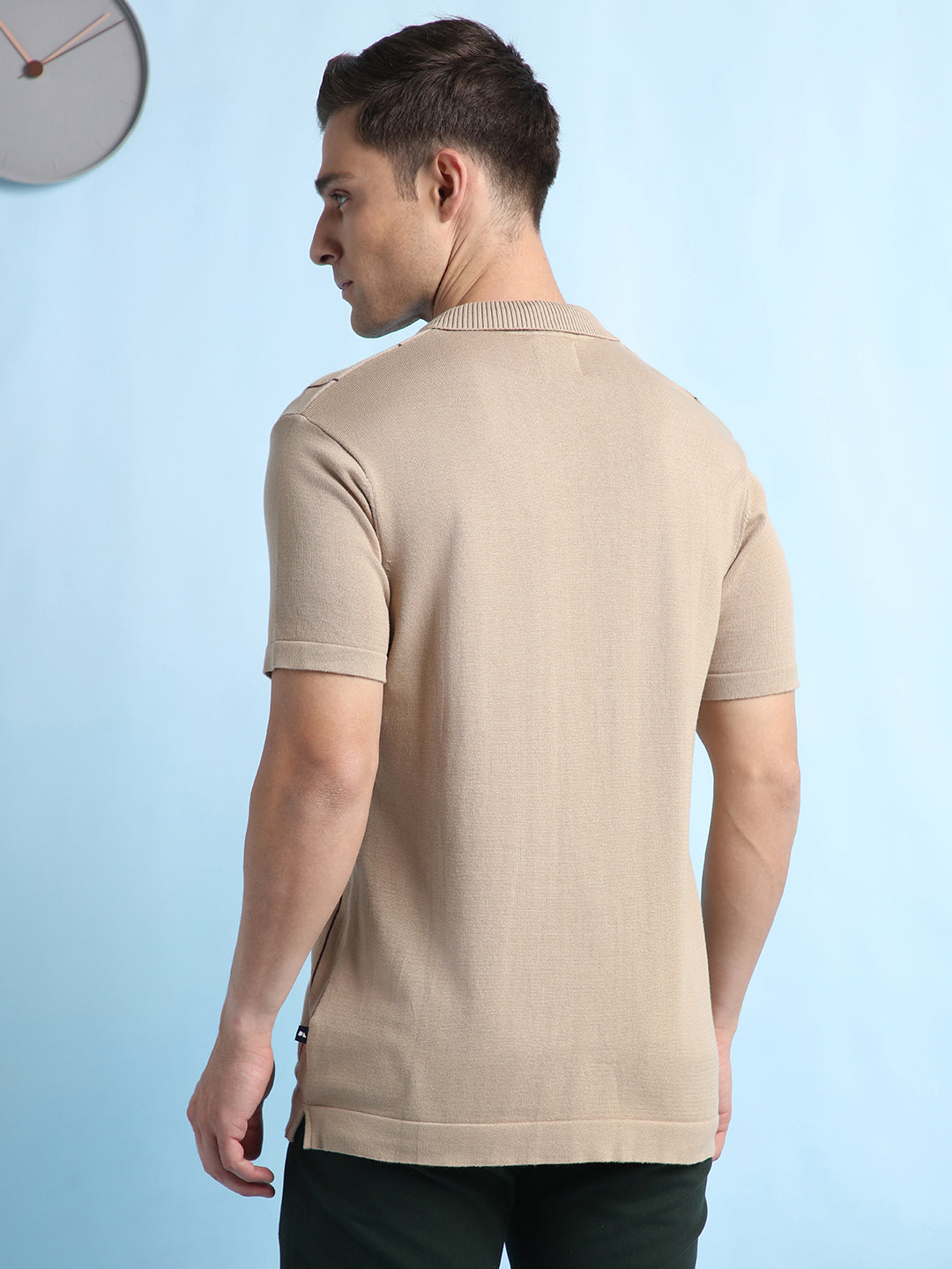 Men's Beige Solid Textured Spread Collar Half Sleeves Flat Knit T-shirt