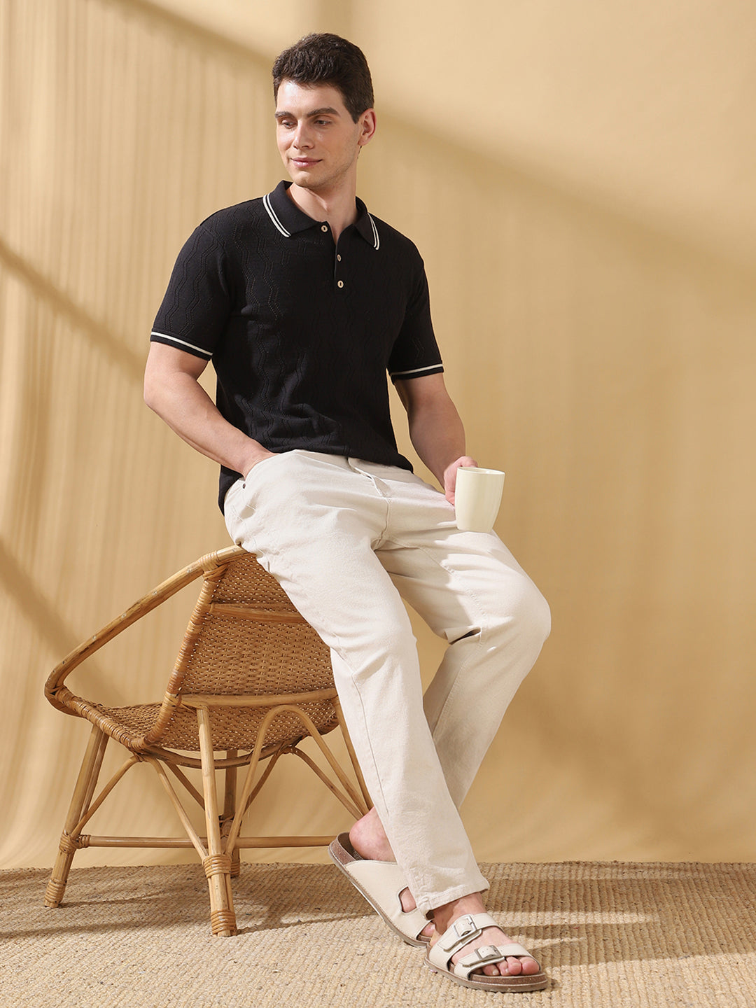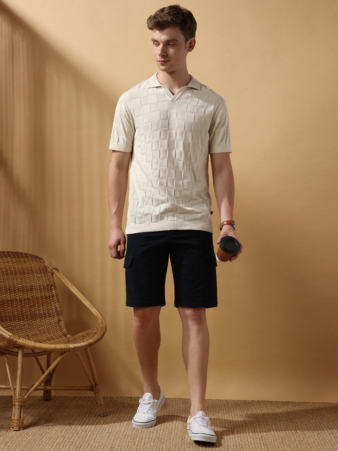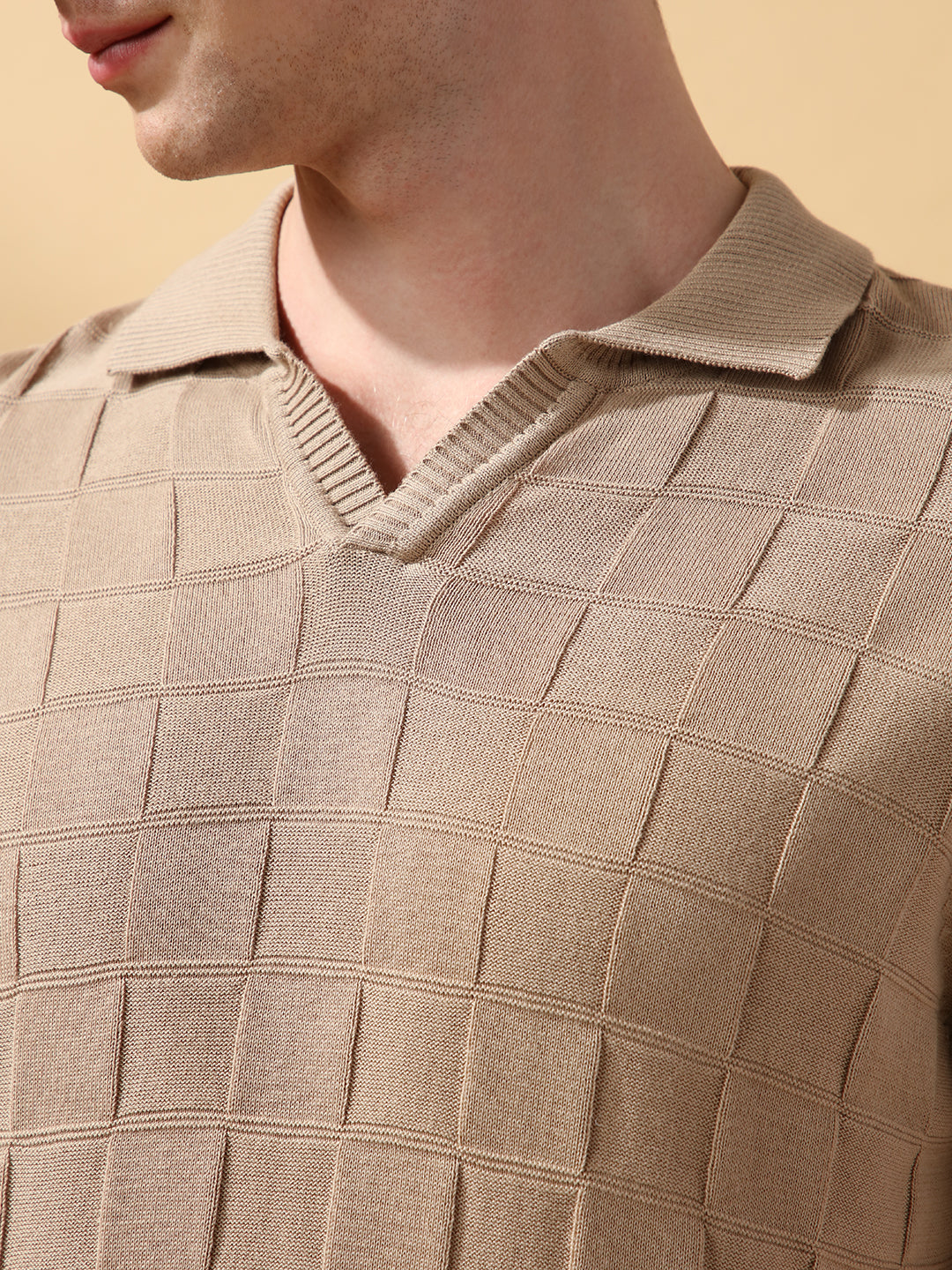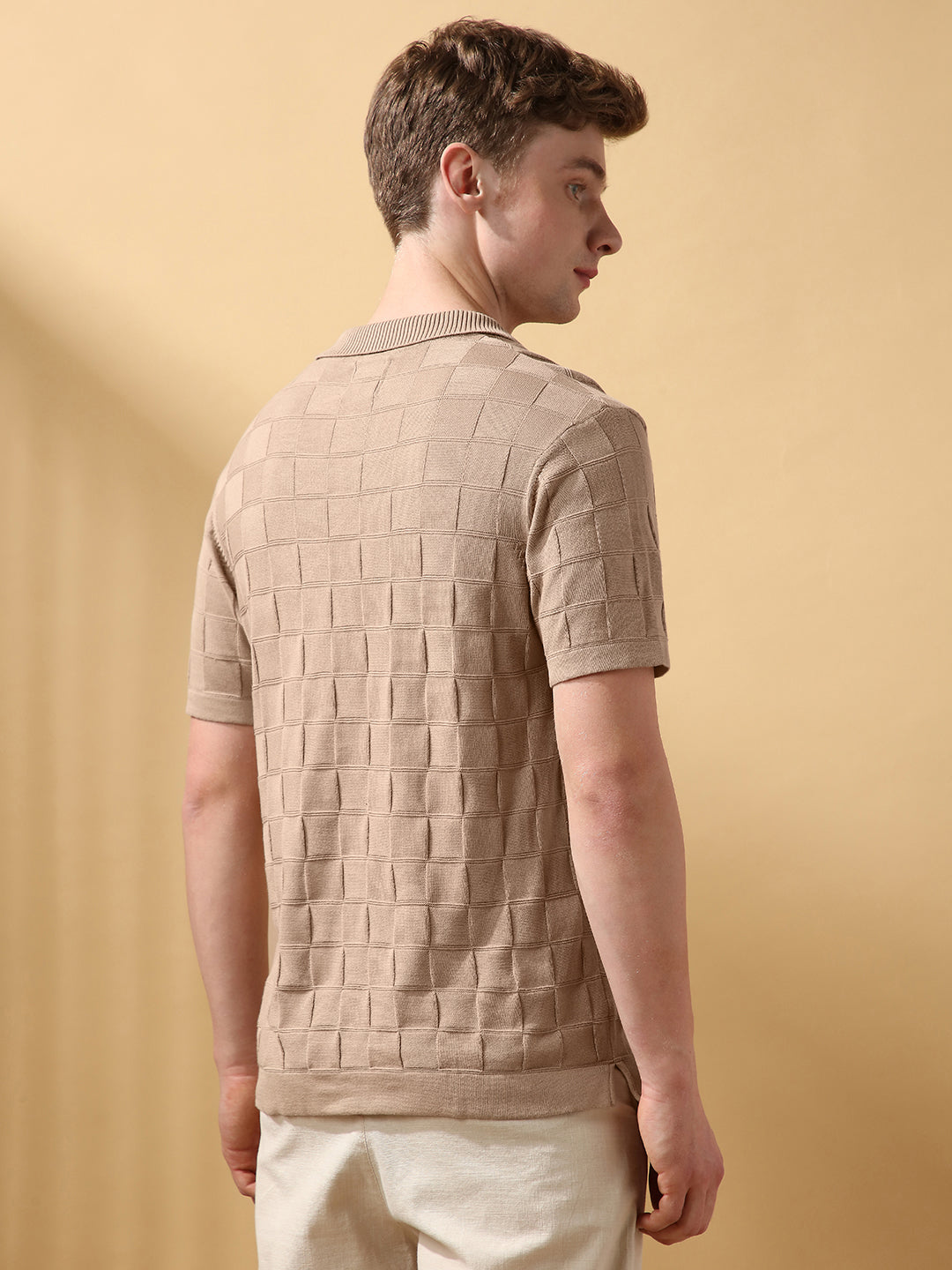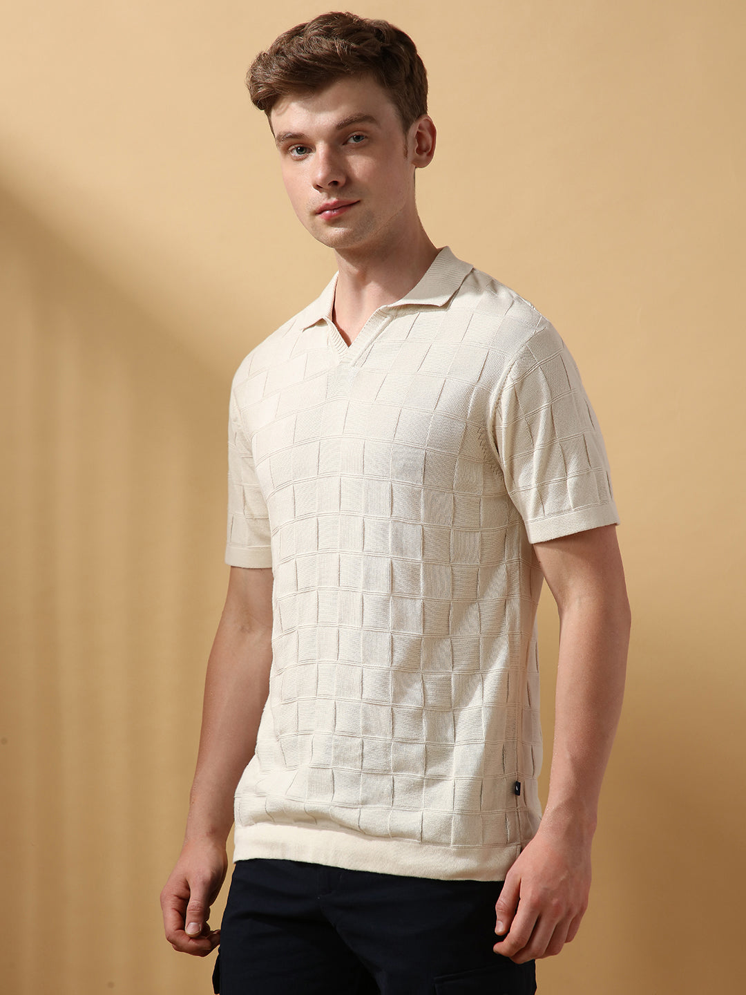 Men's Beige Solid Textured Spread Collar Half Sleeves Flat Knit T-shirt