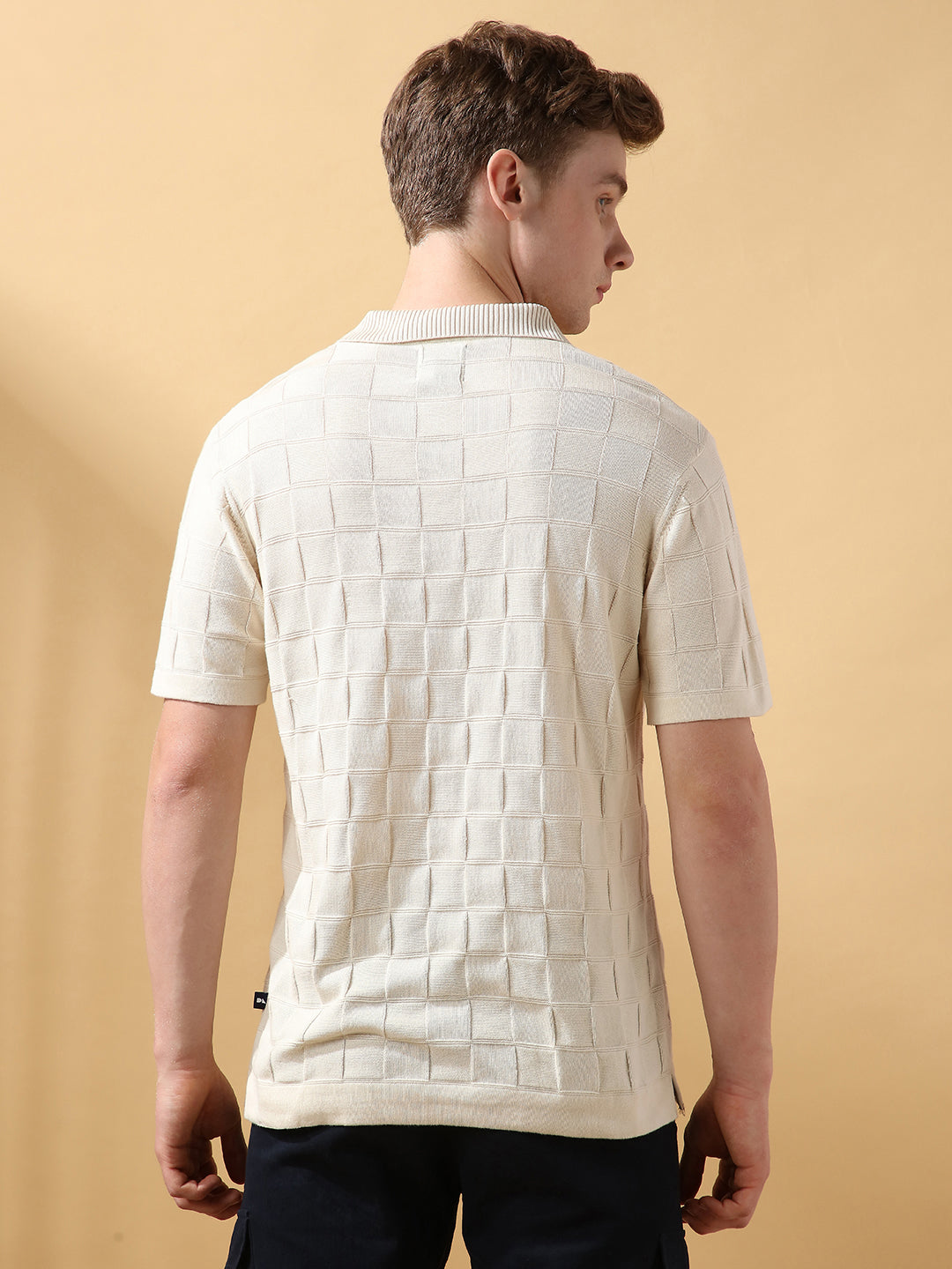 Men's Offwhite Solid Textured Spread Collar Half Sleeves Flat Knit T-shirt