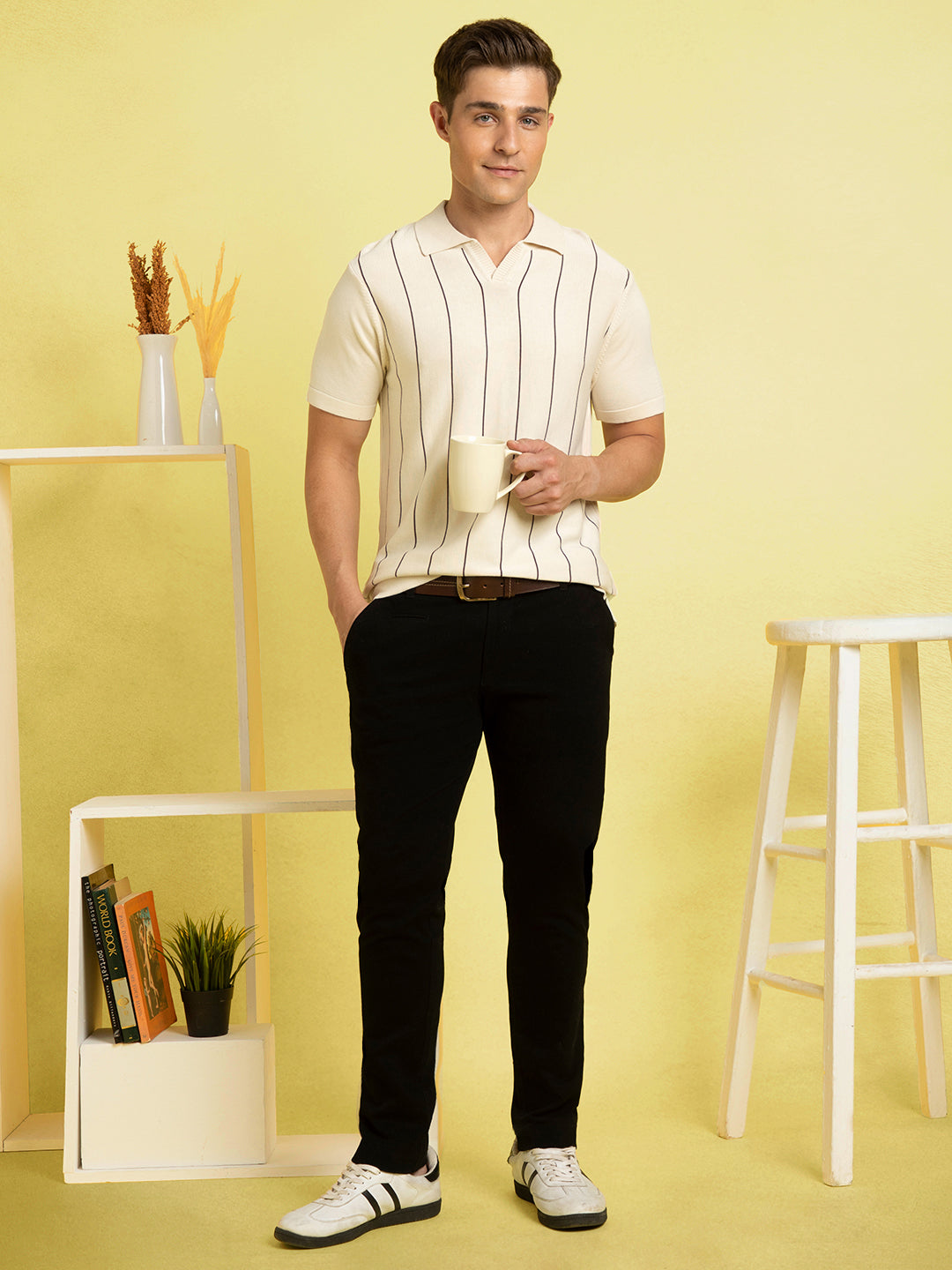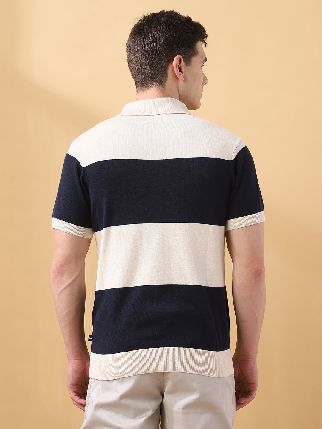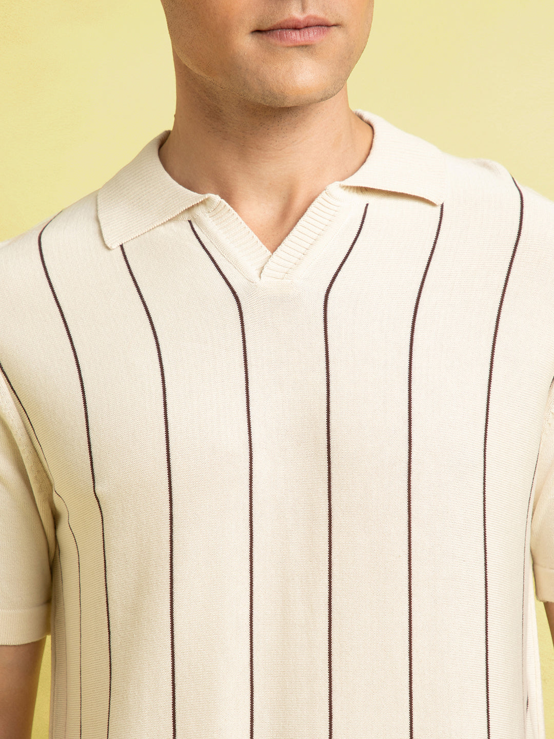 Men's Off-white Striped Polo Collar Half Sleeves Flat Knit T-shirt