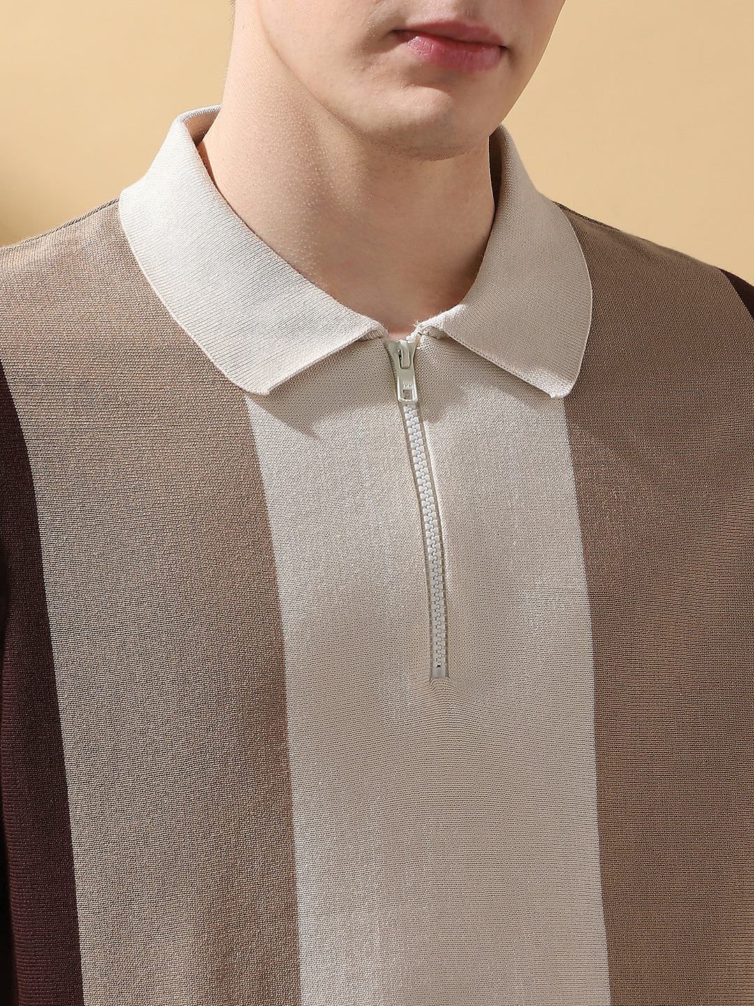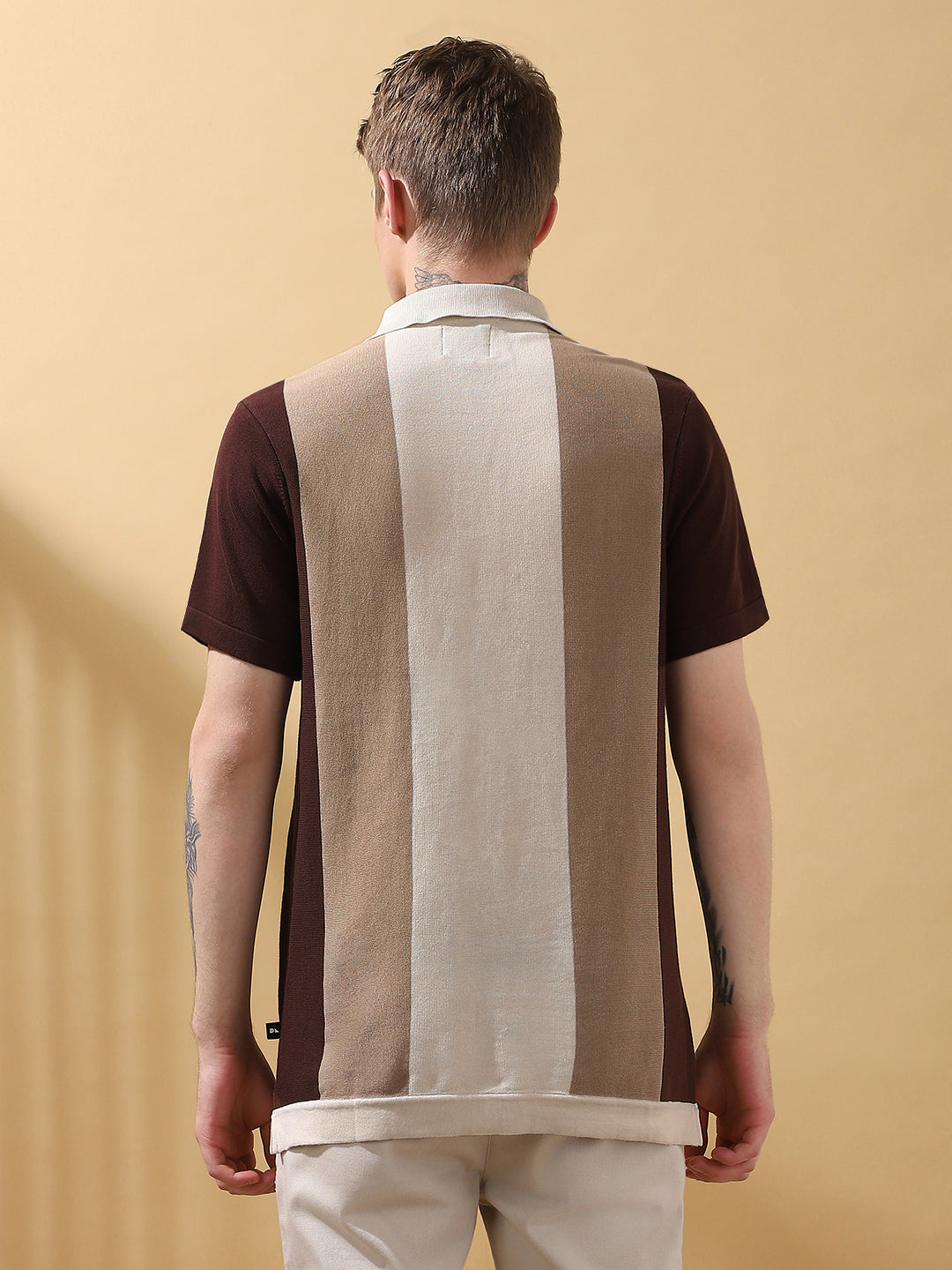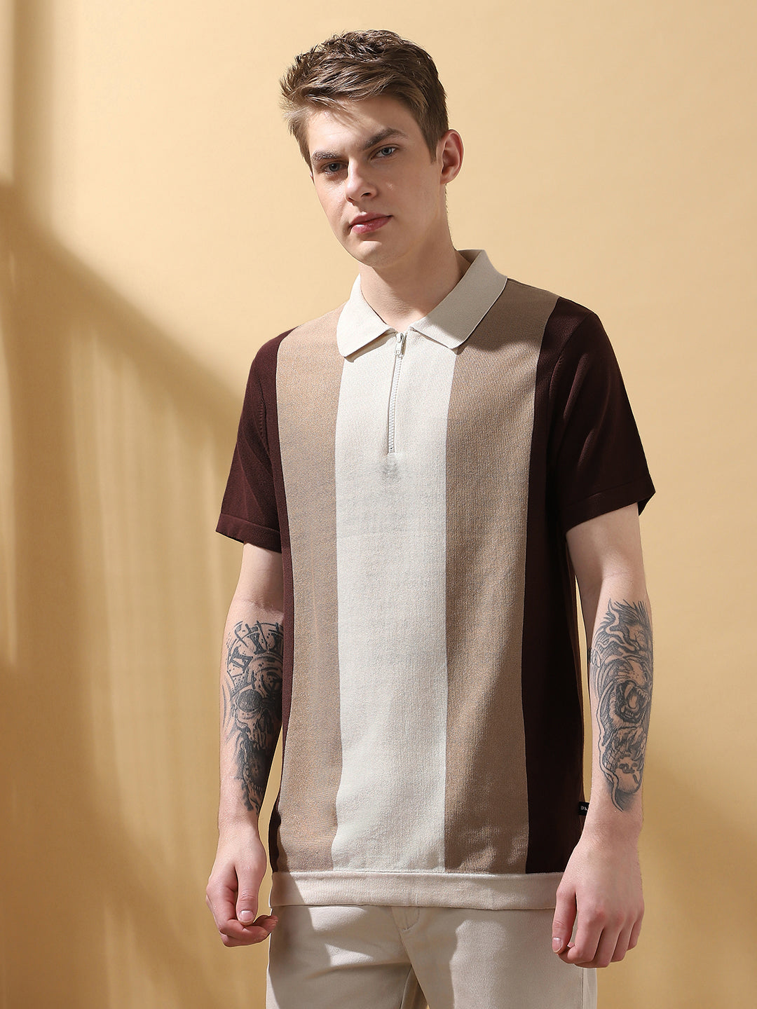 Men's Brown Colorblocked Spread Collar Half Sleeves Flat Knit T-shirt