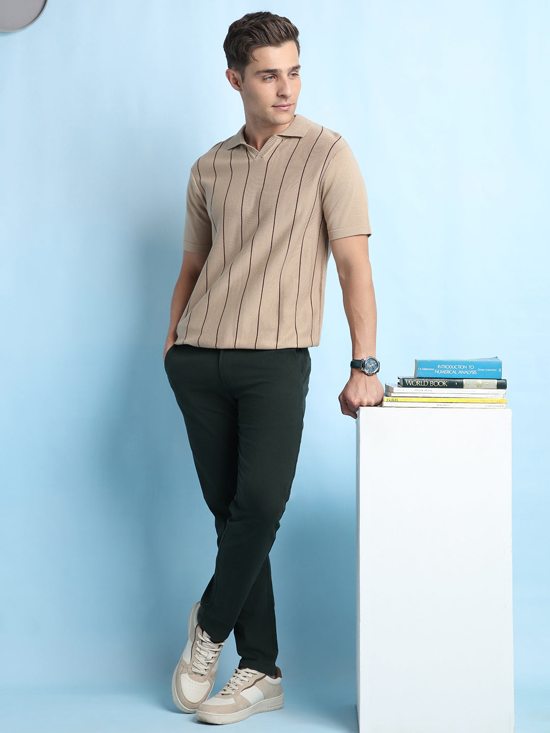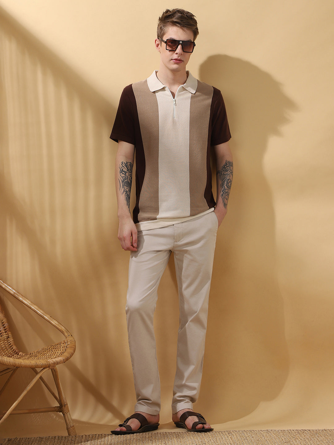 Men's Beige Striped Polo Collar Half Sleeves Flat Knit T-shirt