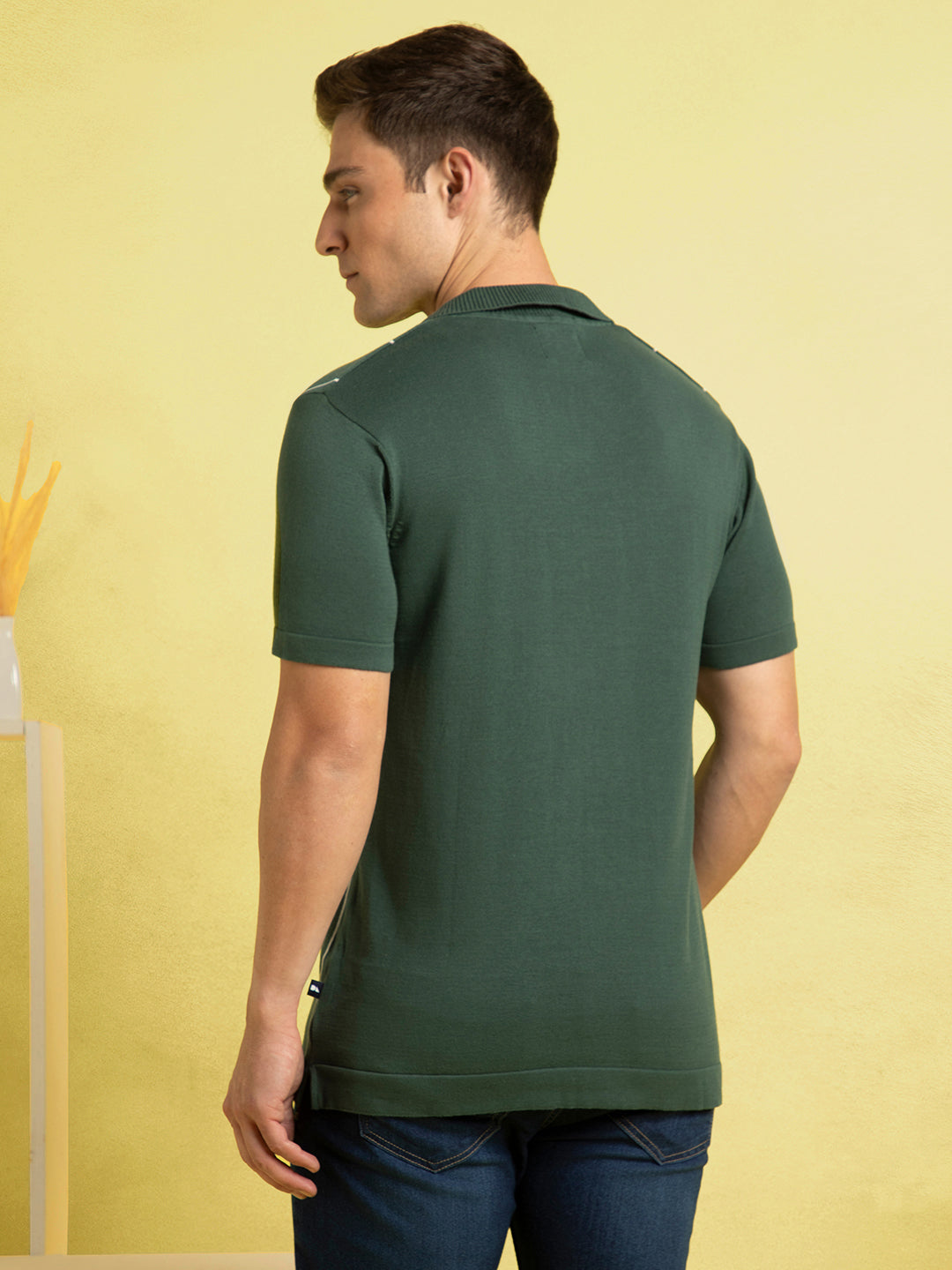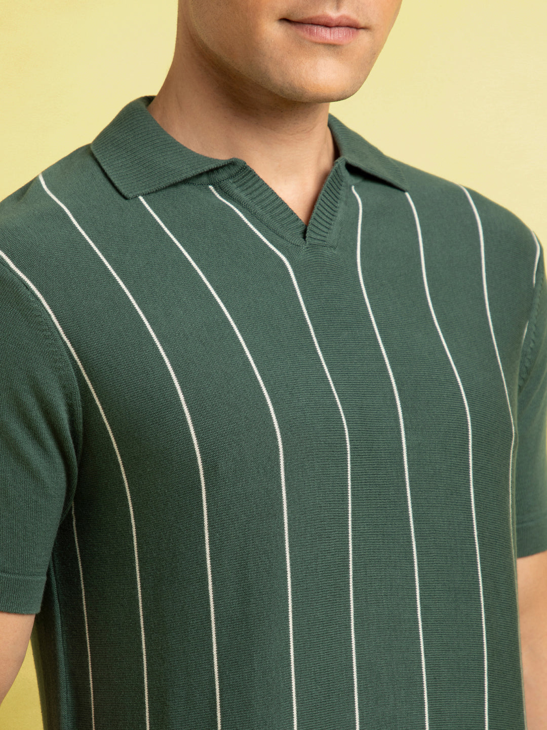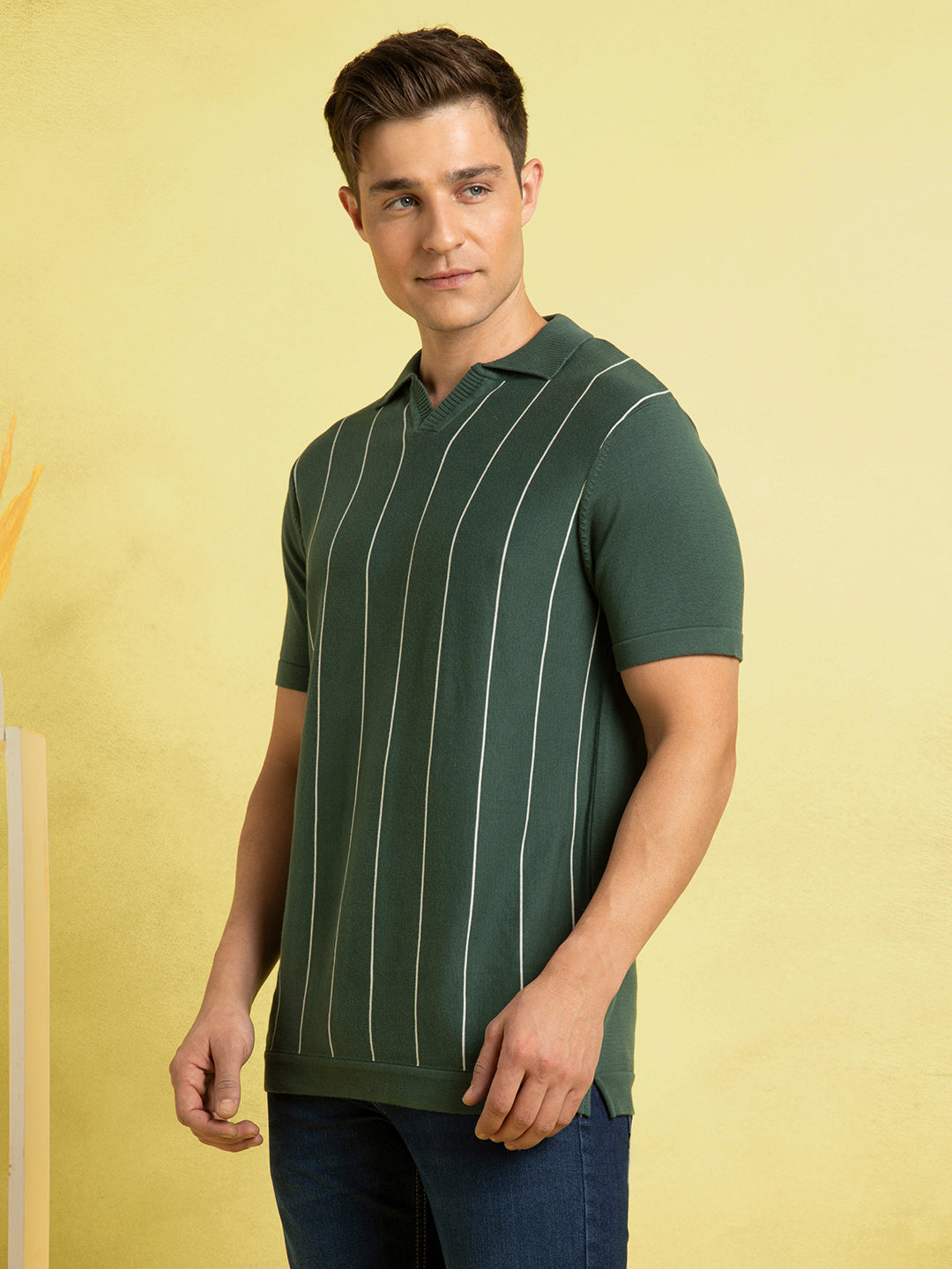 Men Green Striped Polo Collar Half Sleeves Regular Fit Flat Knit T-Shirt