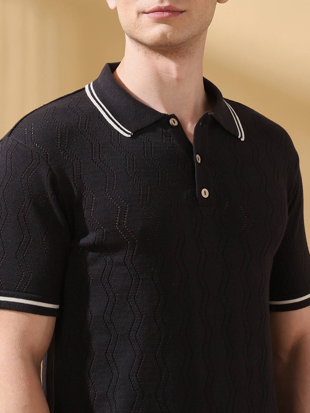 Men Black Self Design Polo Collar Cotton Relaxed Fit T-shirt