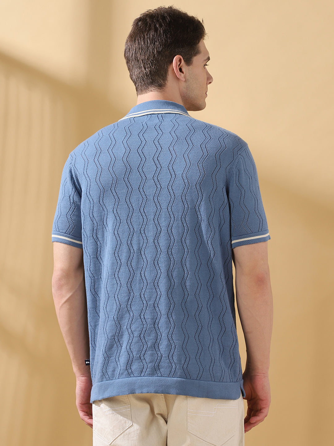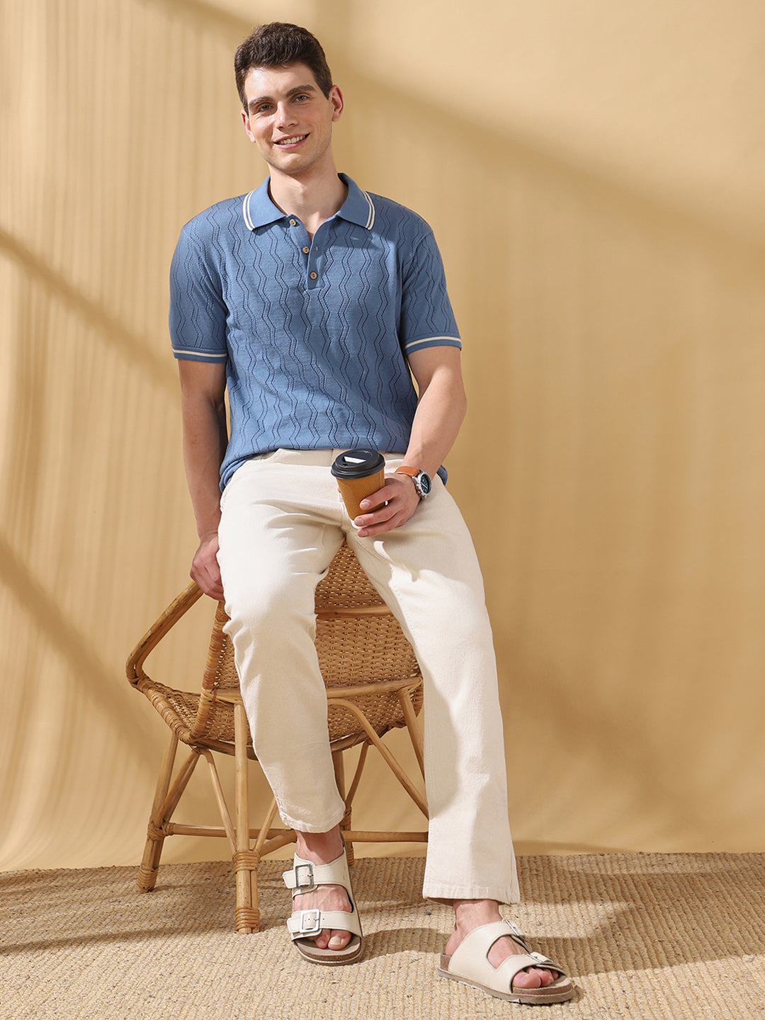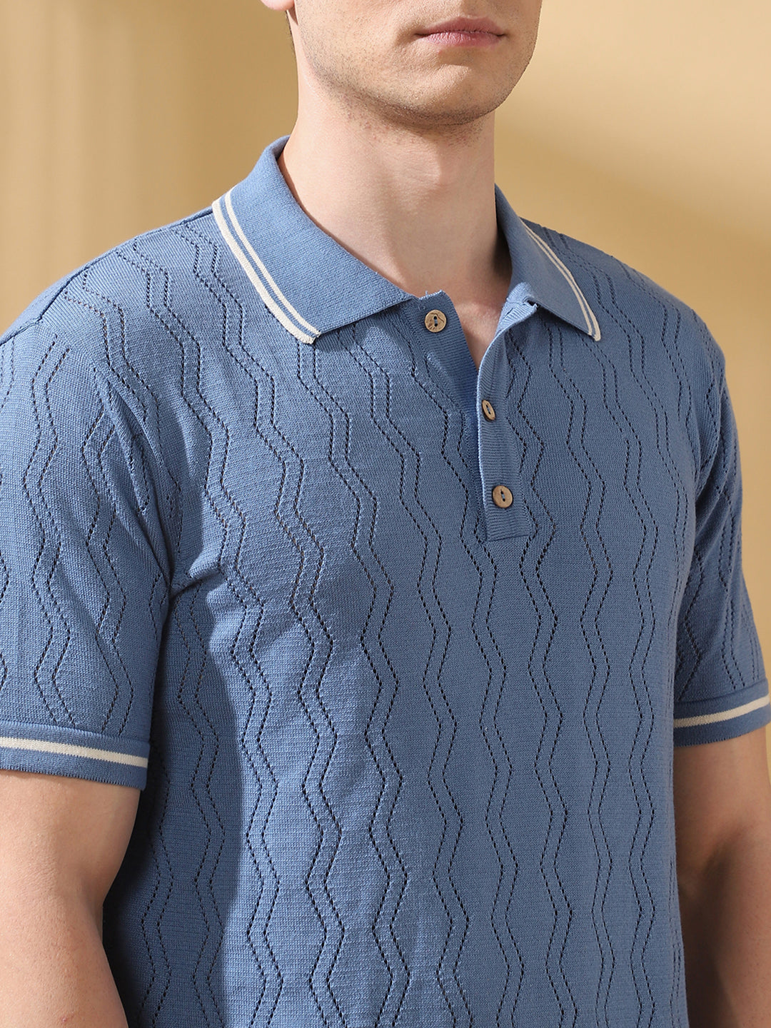 Men Blue Self Design Polo Collar Cotton Relaxed Fit T-shirt