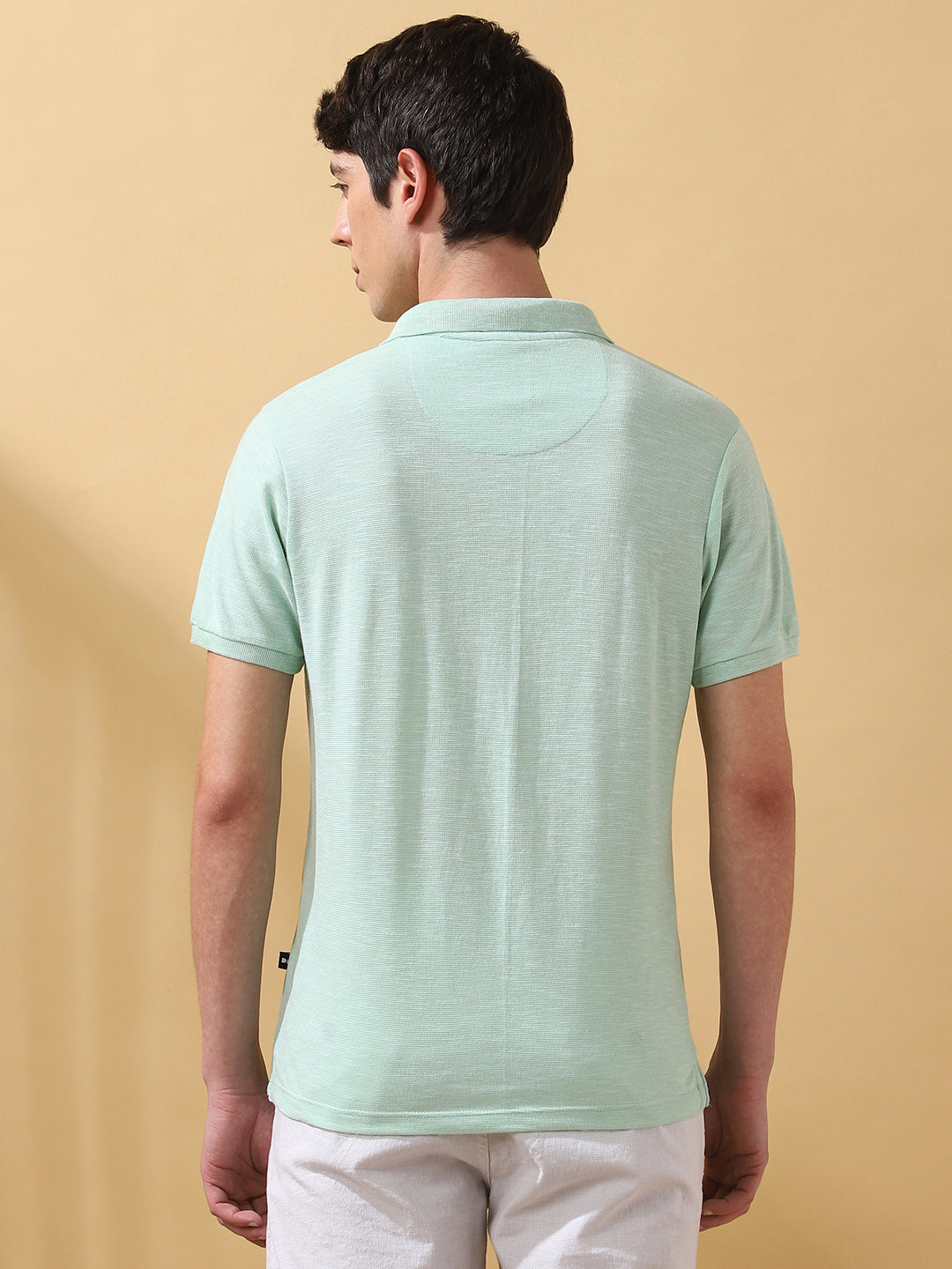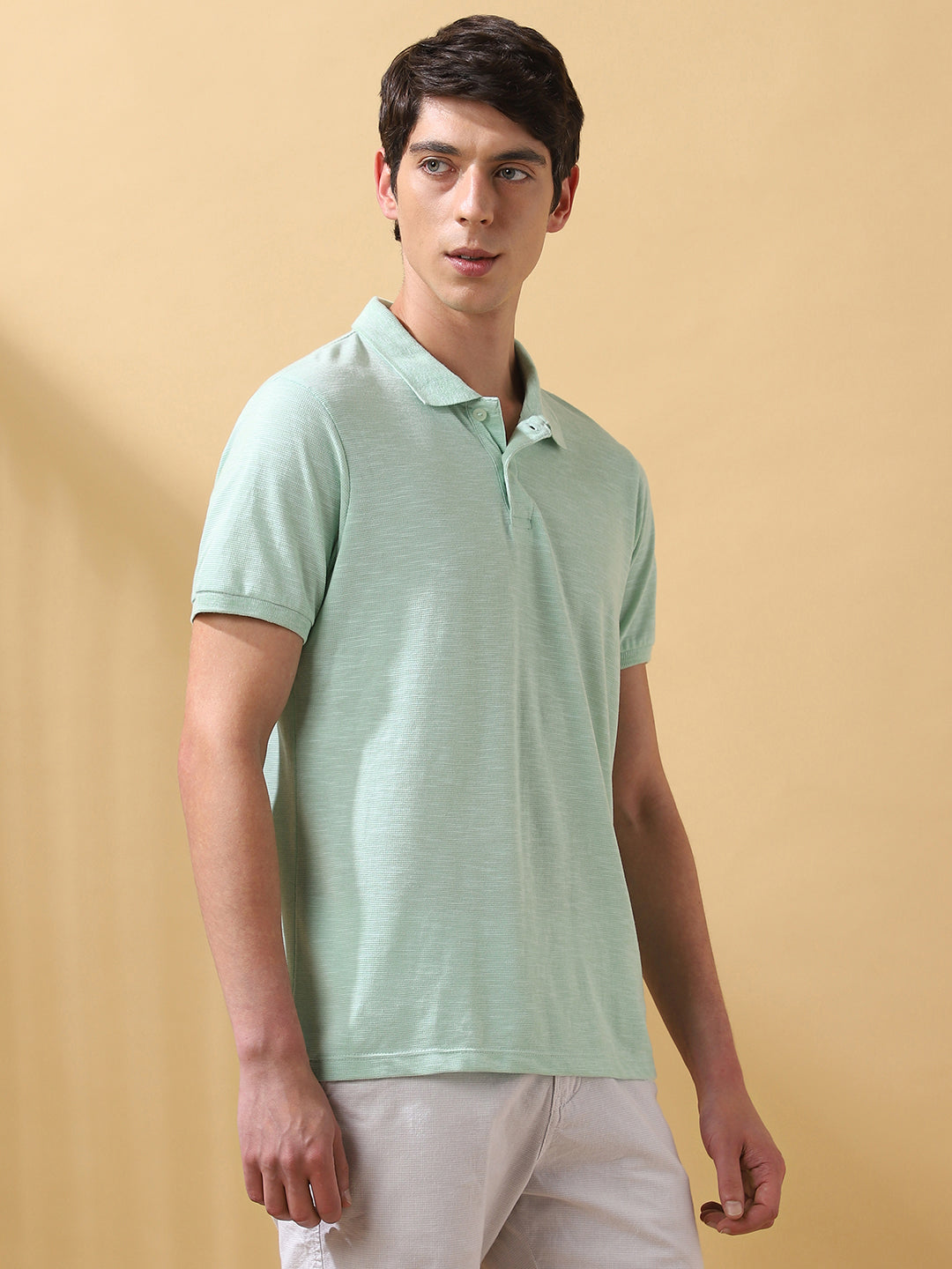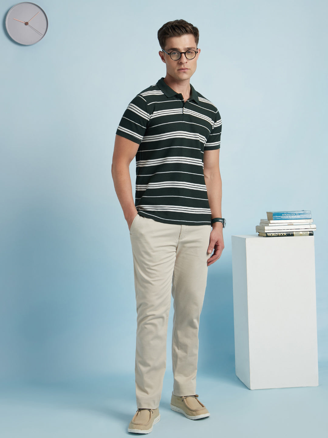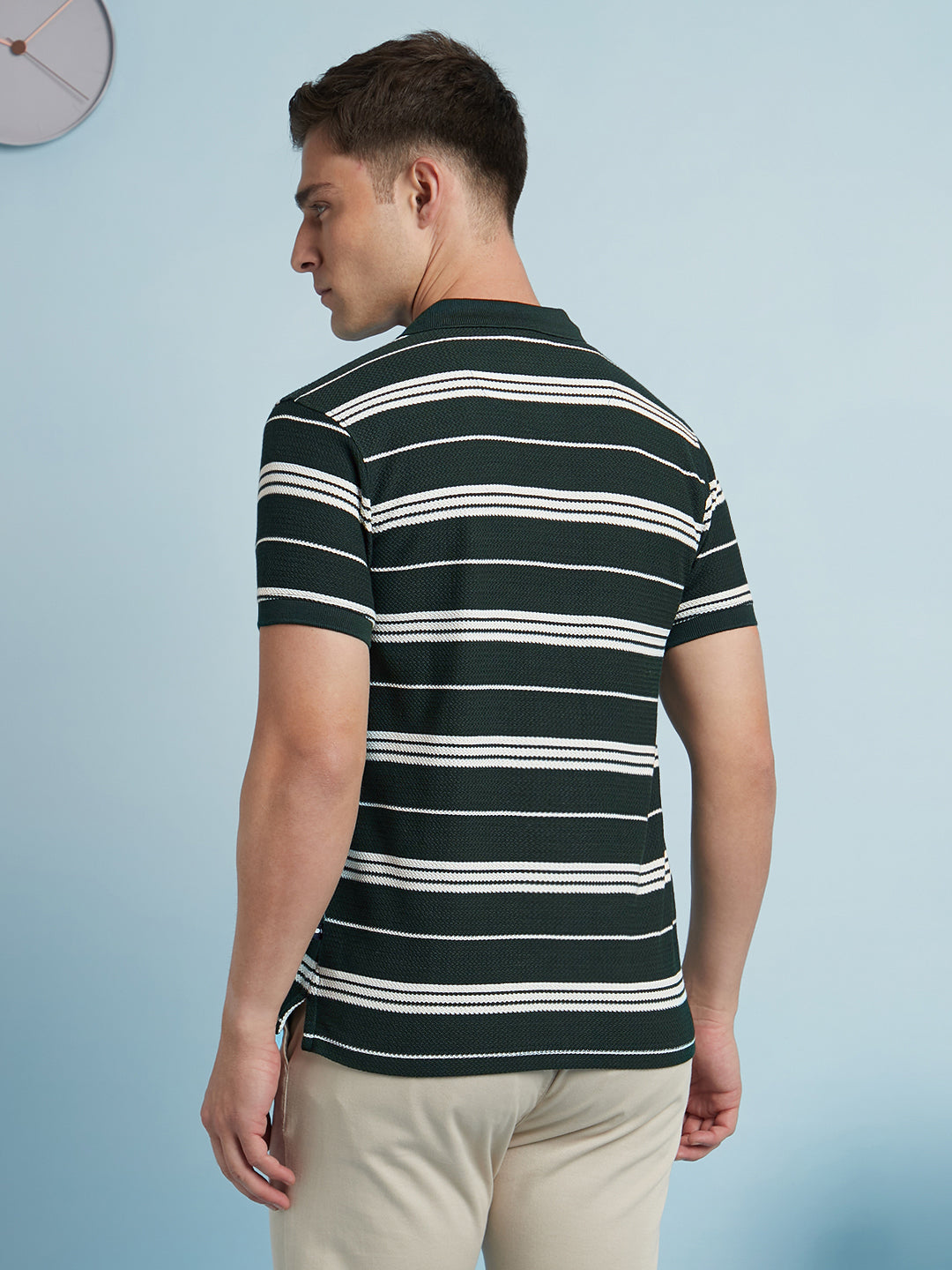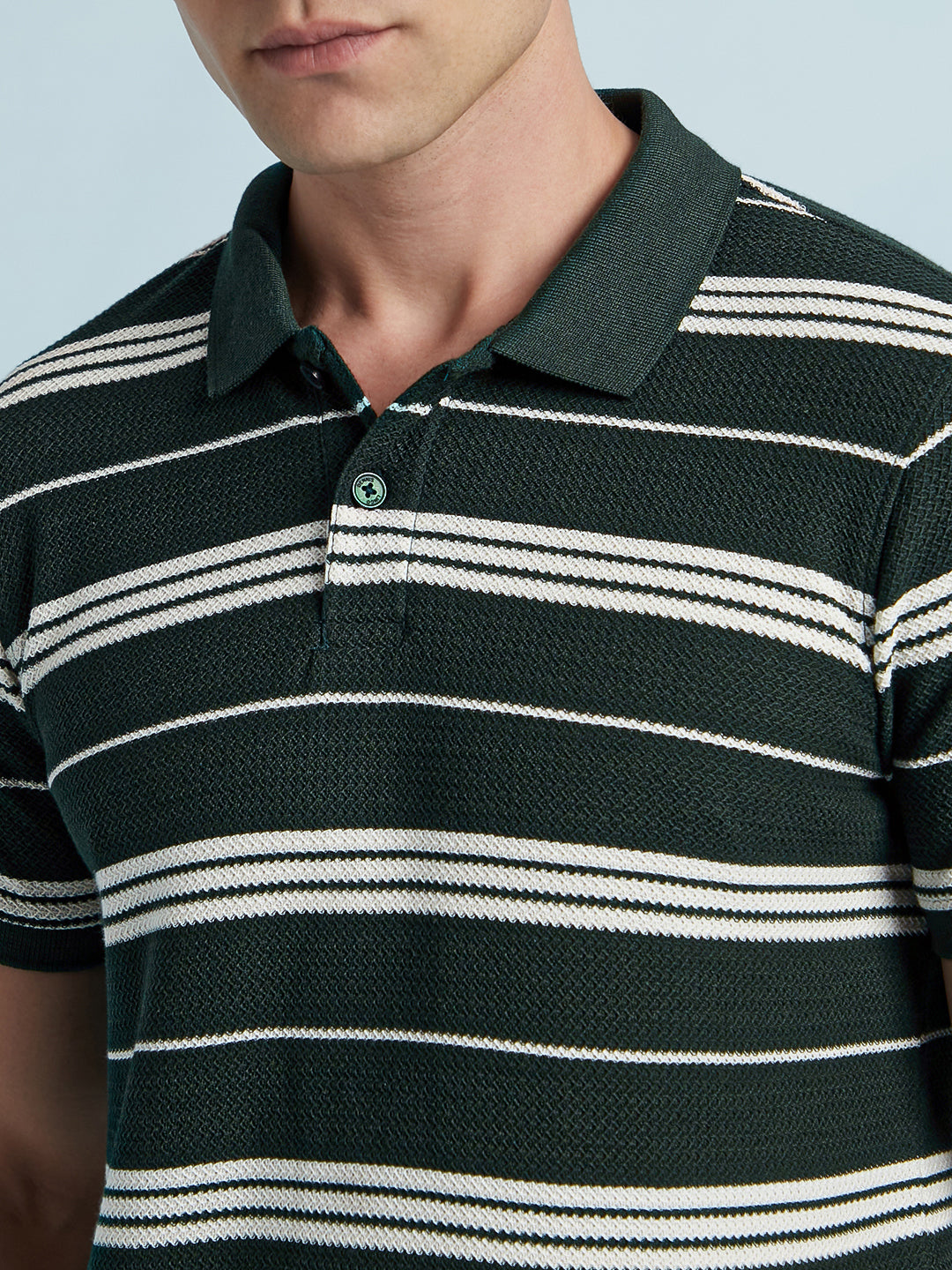 Men Green Textured Stripes Polo Collar Half Sleeves Regular Fit T-Shirt