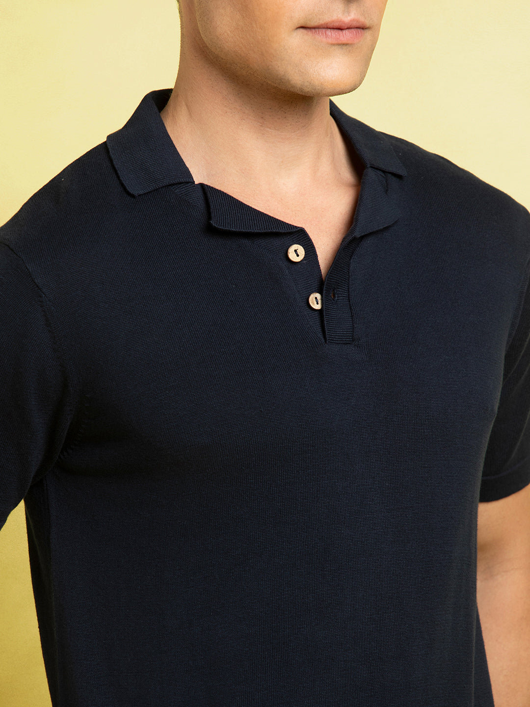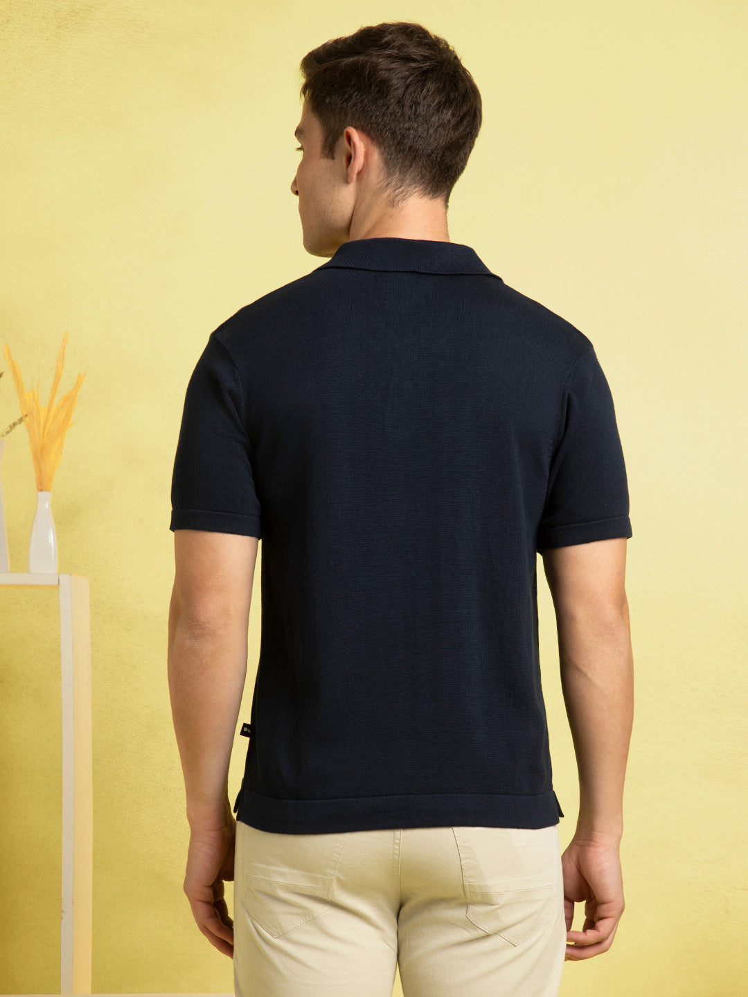 Men's Navy Solid Textured Polo Collar Half Sleeves Flat Knit T-shirt