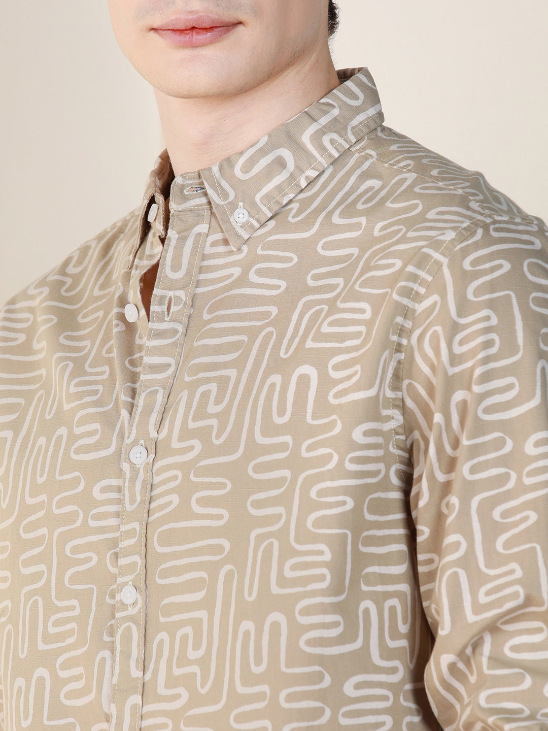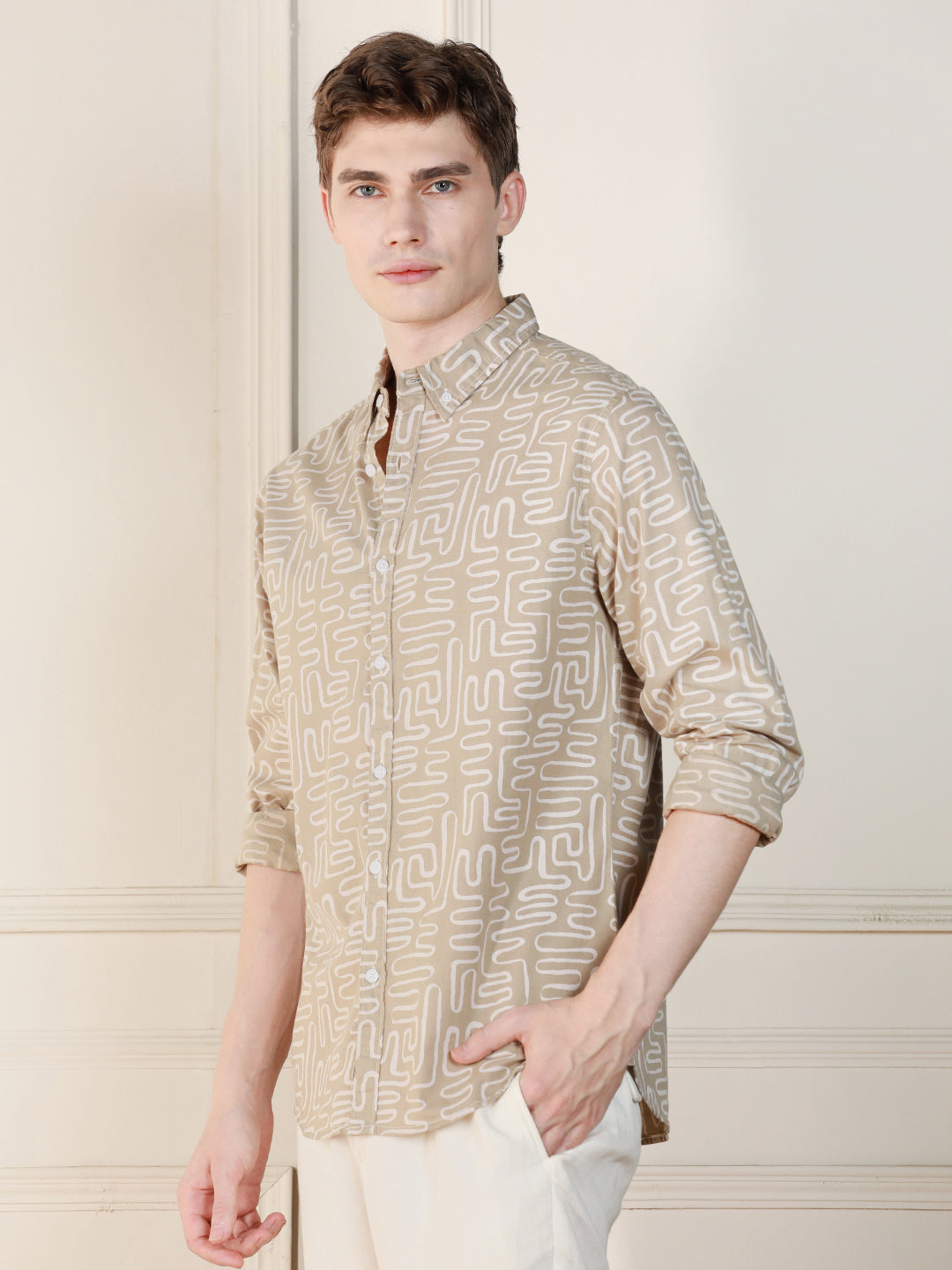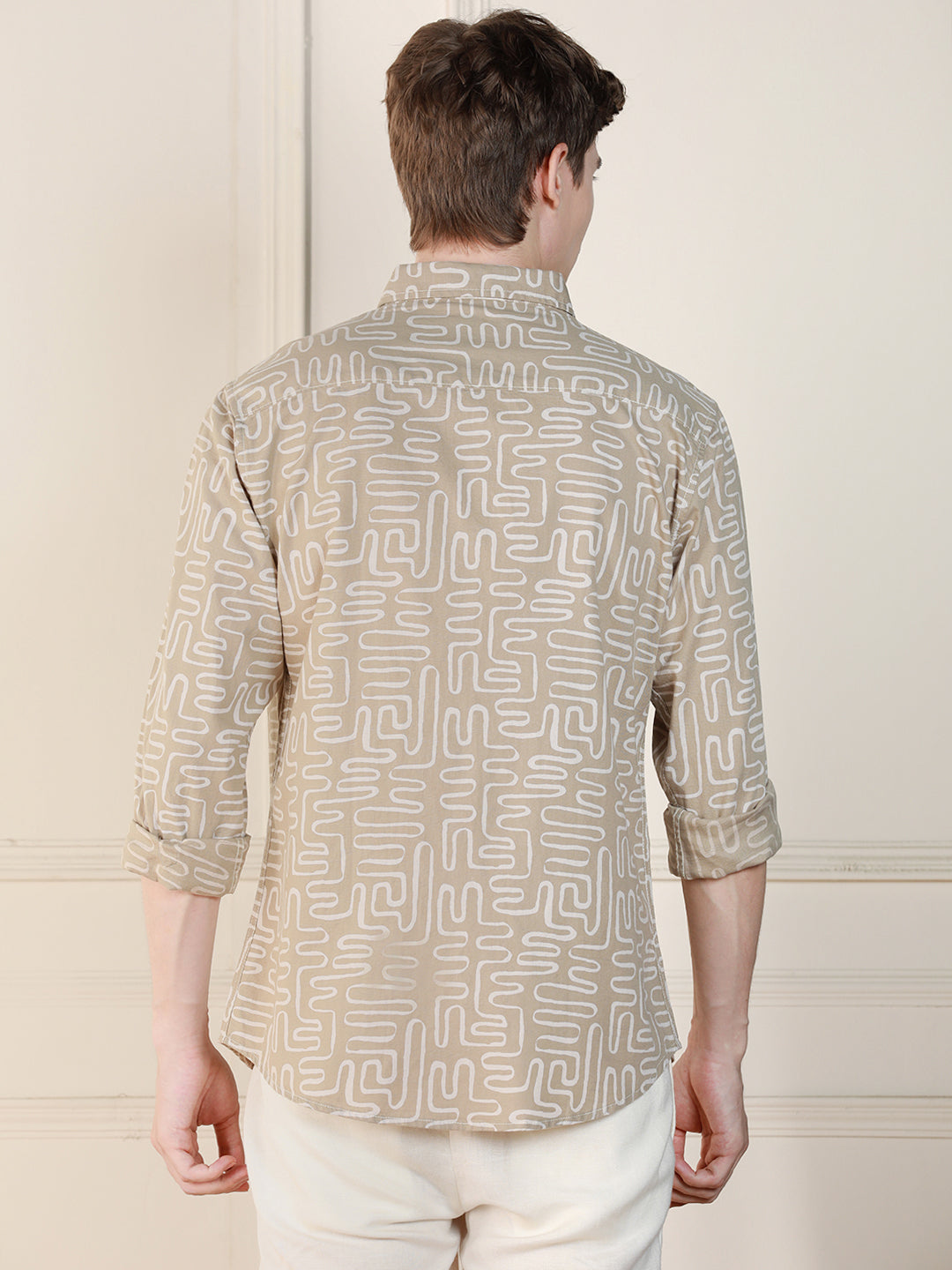 Men's Khaki Abstract Print Spread Collar Long Sleeves Relaxed Fit Casual Shirt