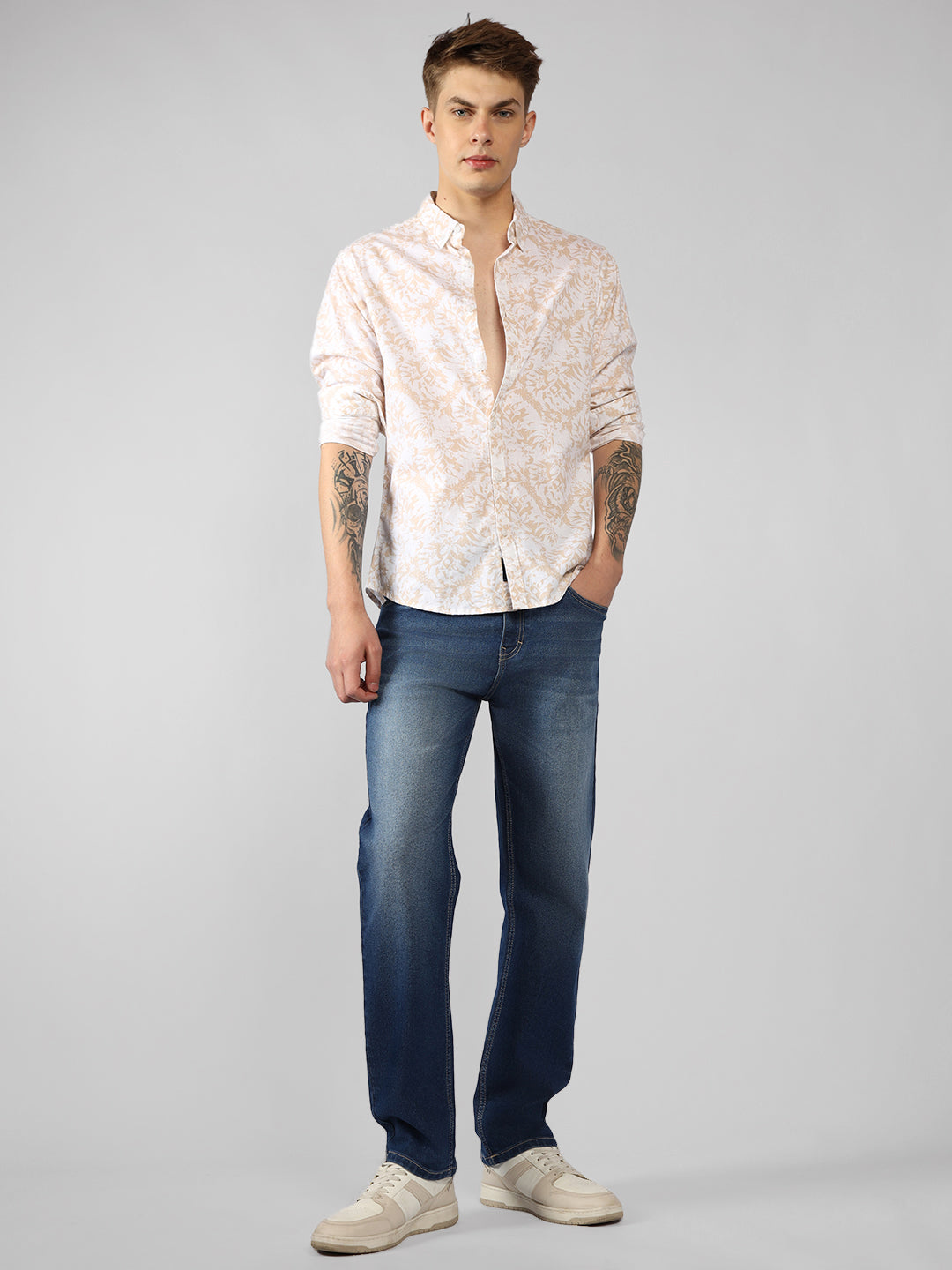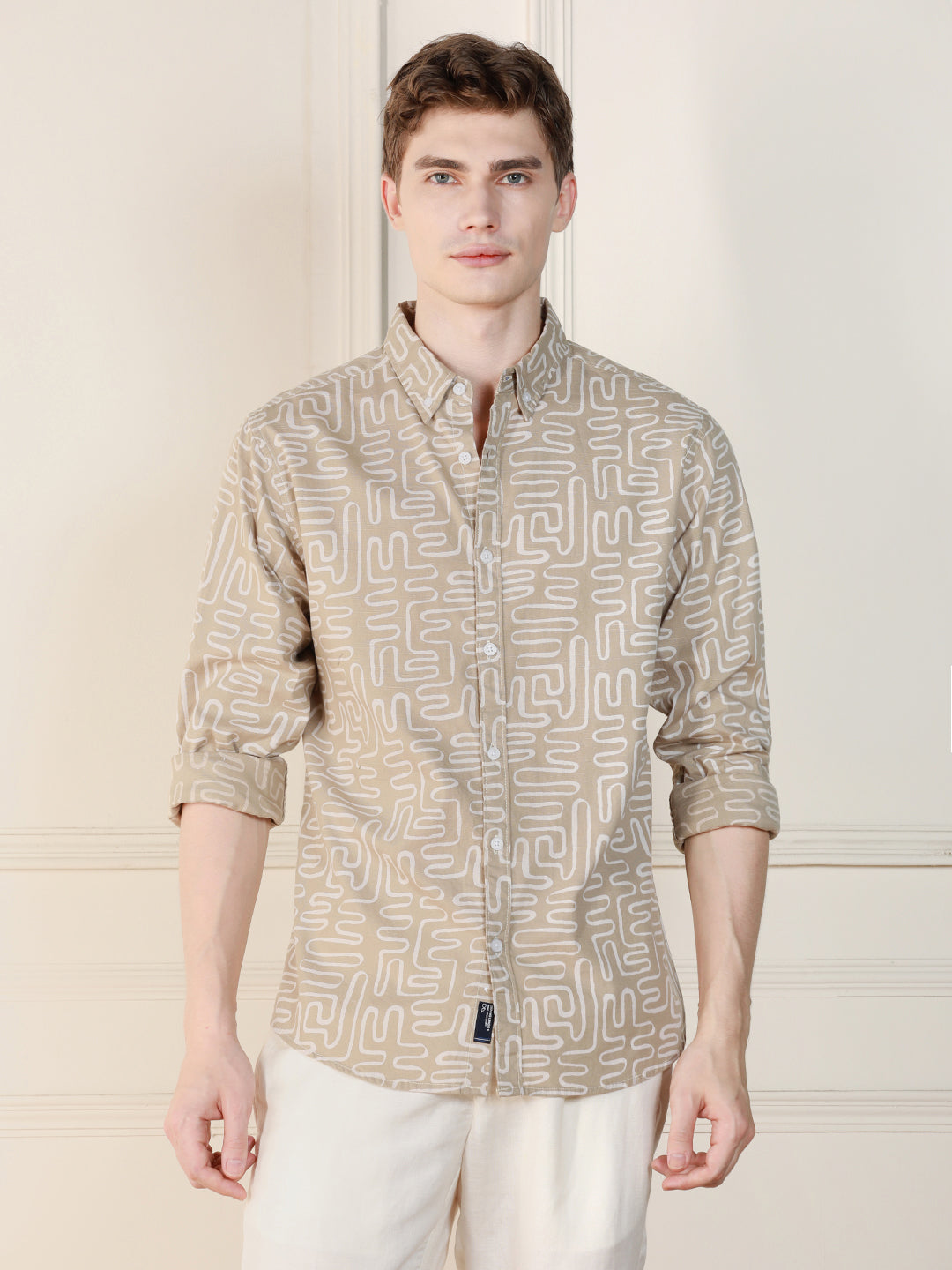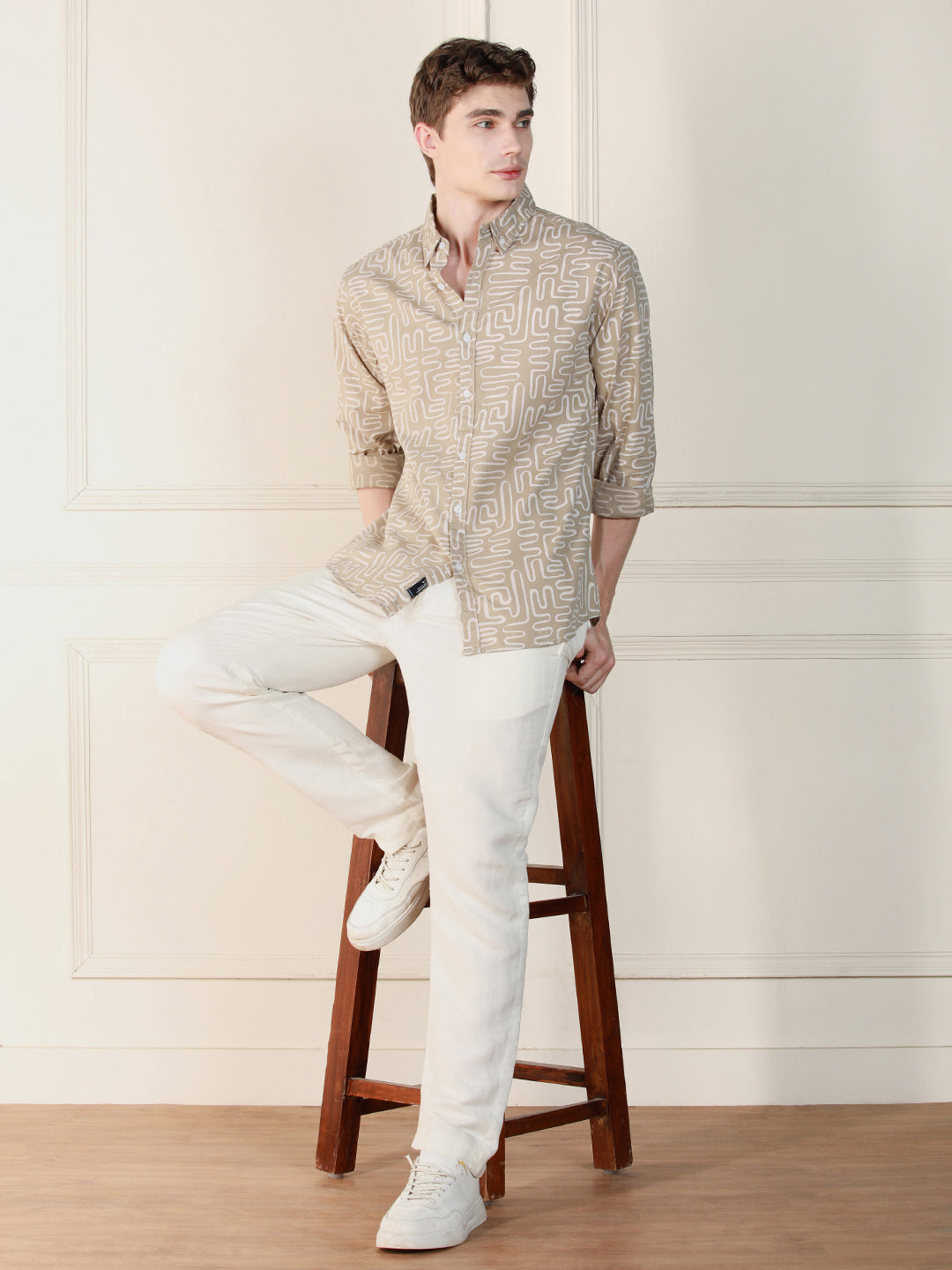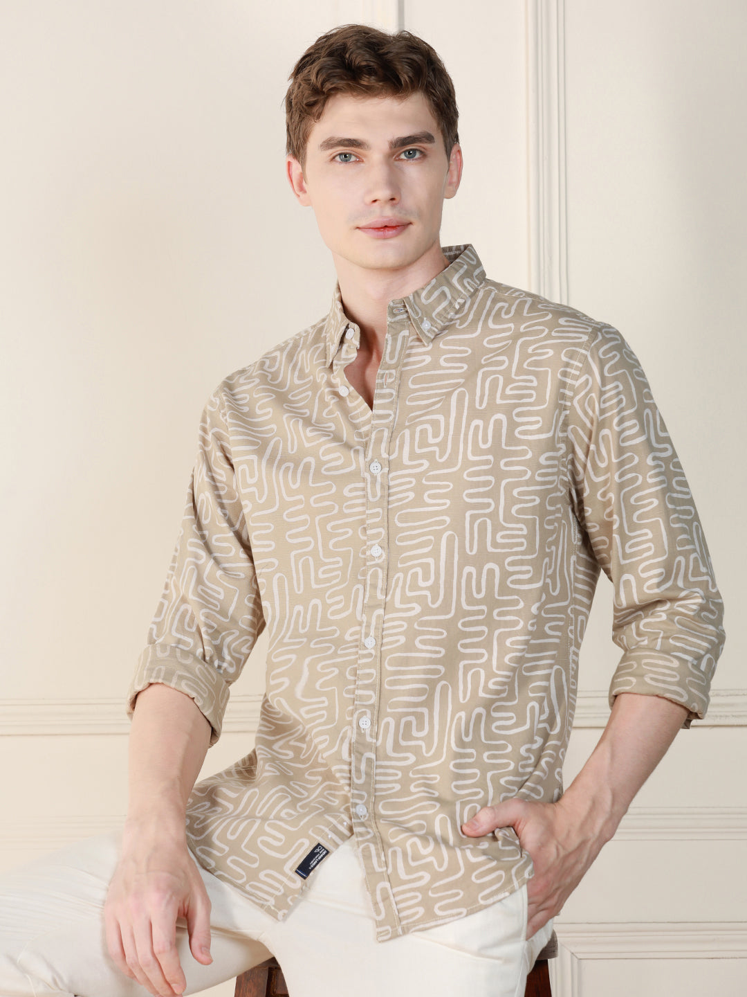 Men's Khaki Abstract Print Spread Collar Long Sleeves Relaxed Fit Casual Shirt