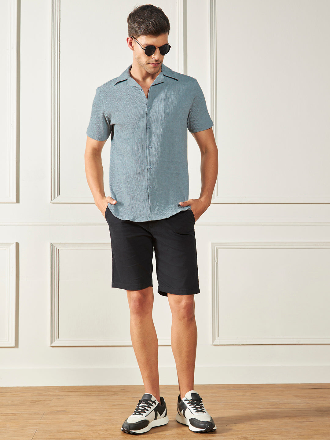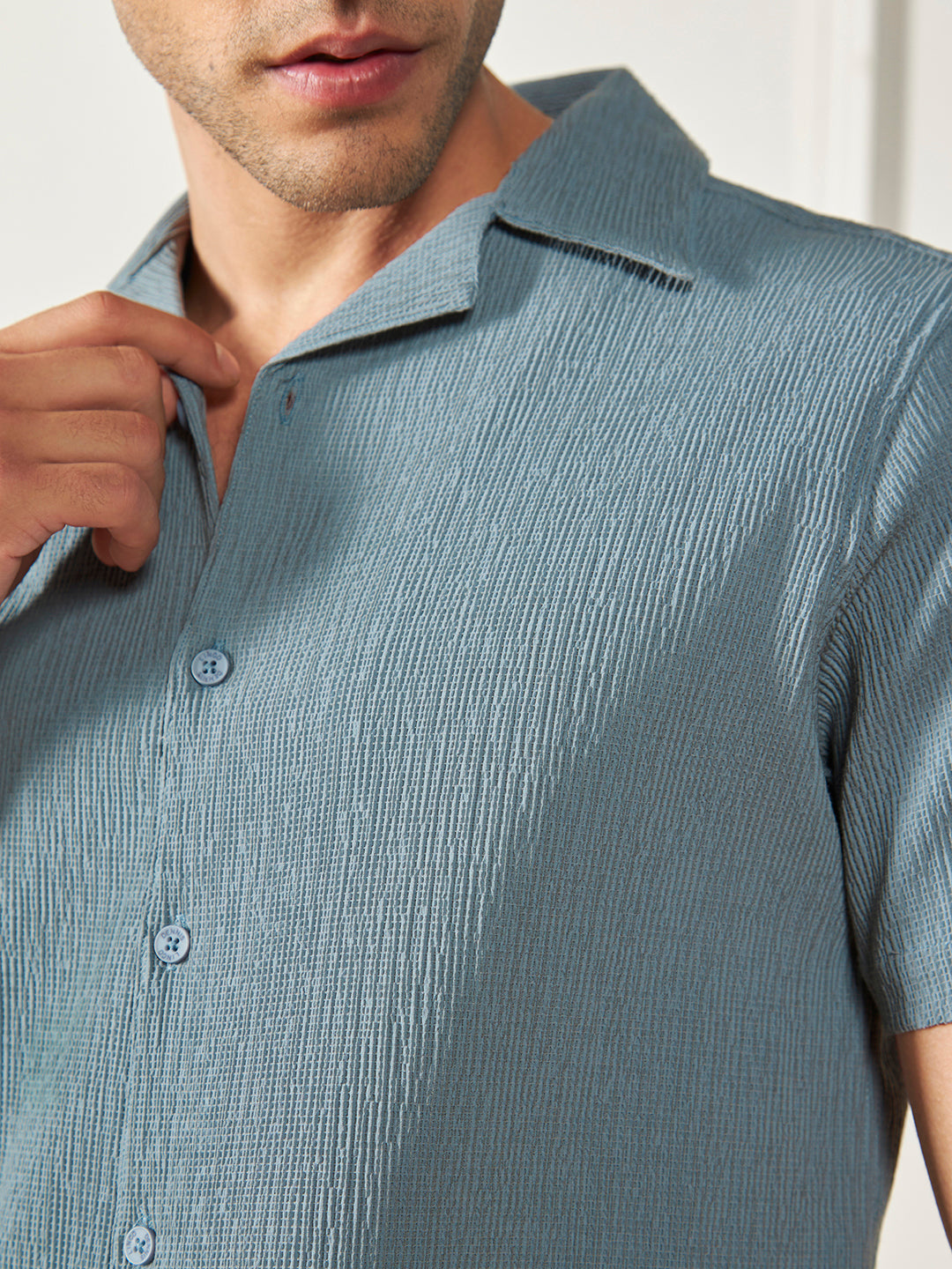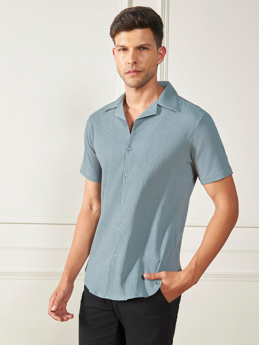 Men's Grey Cuban Collar Textured Cotton Poly Casual Shirt