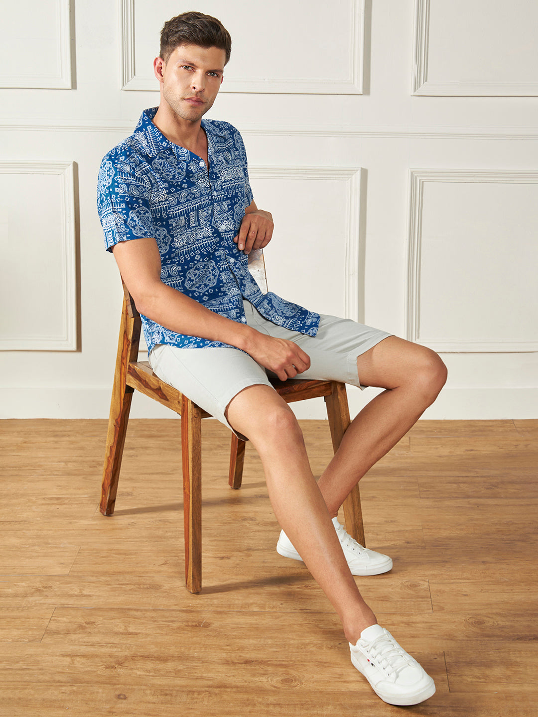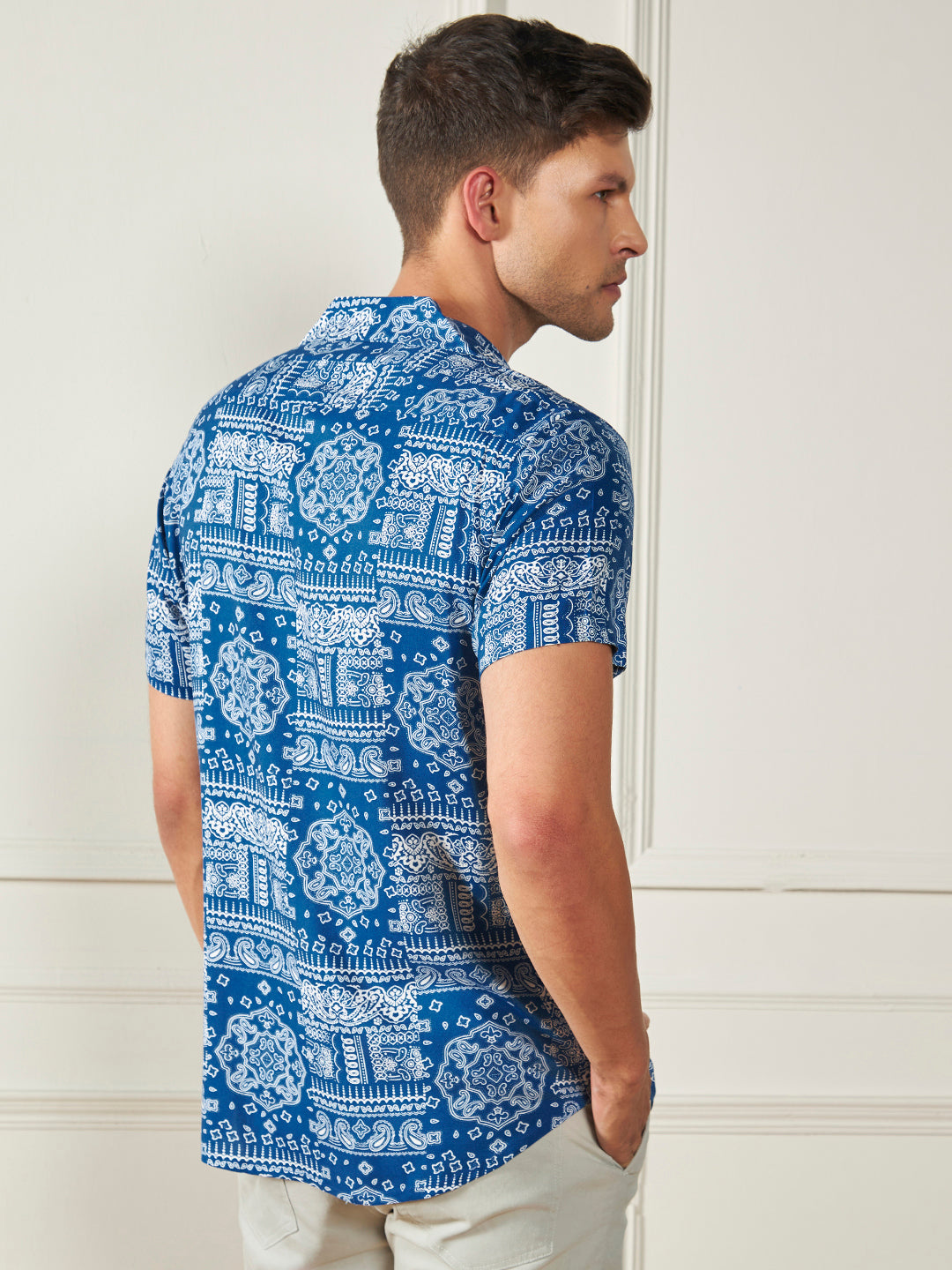 Men's Blue Printed Spread Collar Half Sleeve Regular Fit Shirt