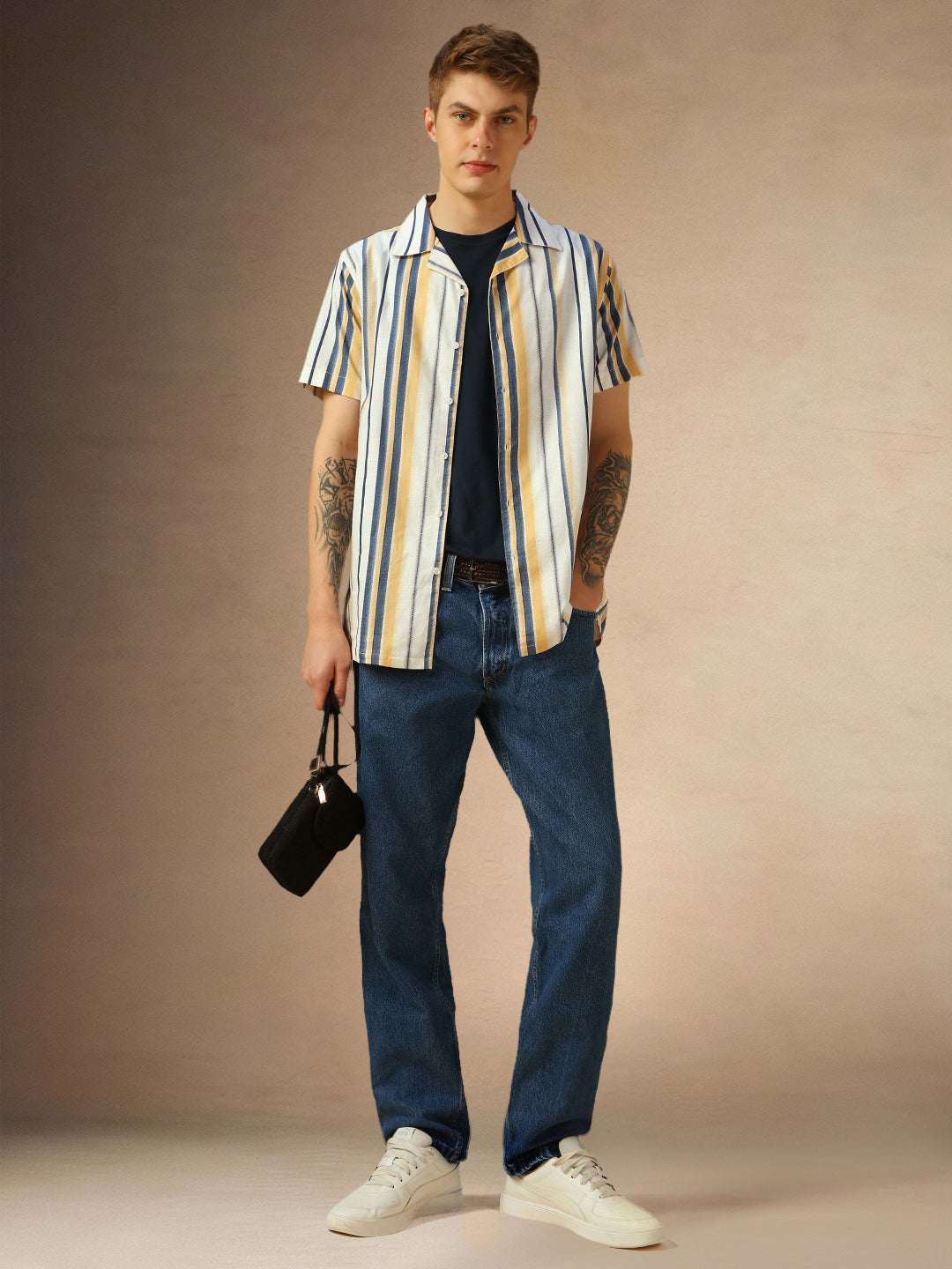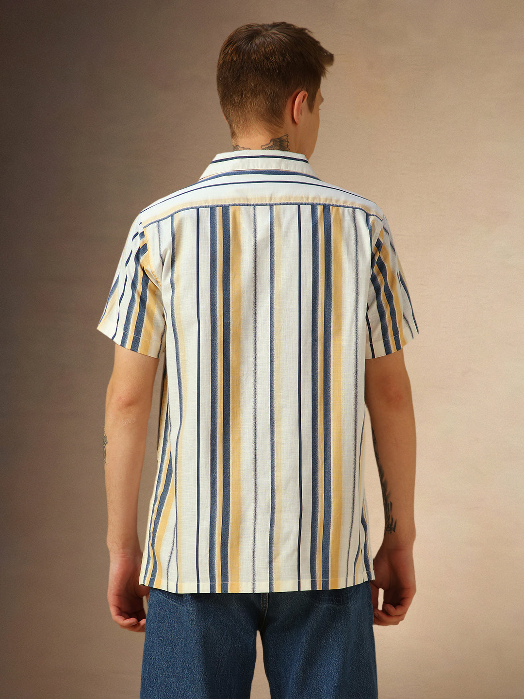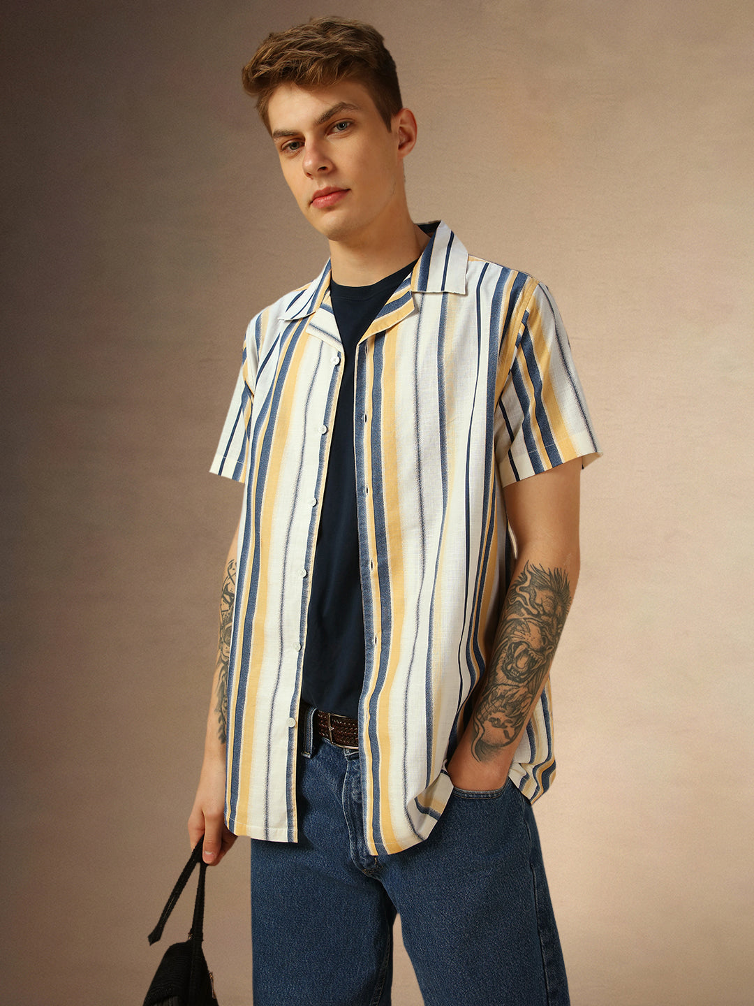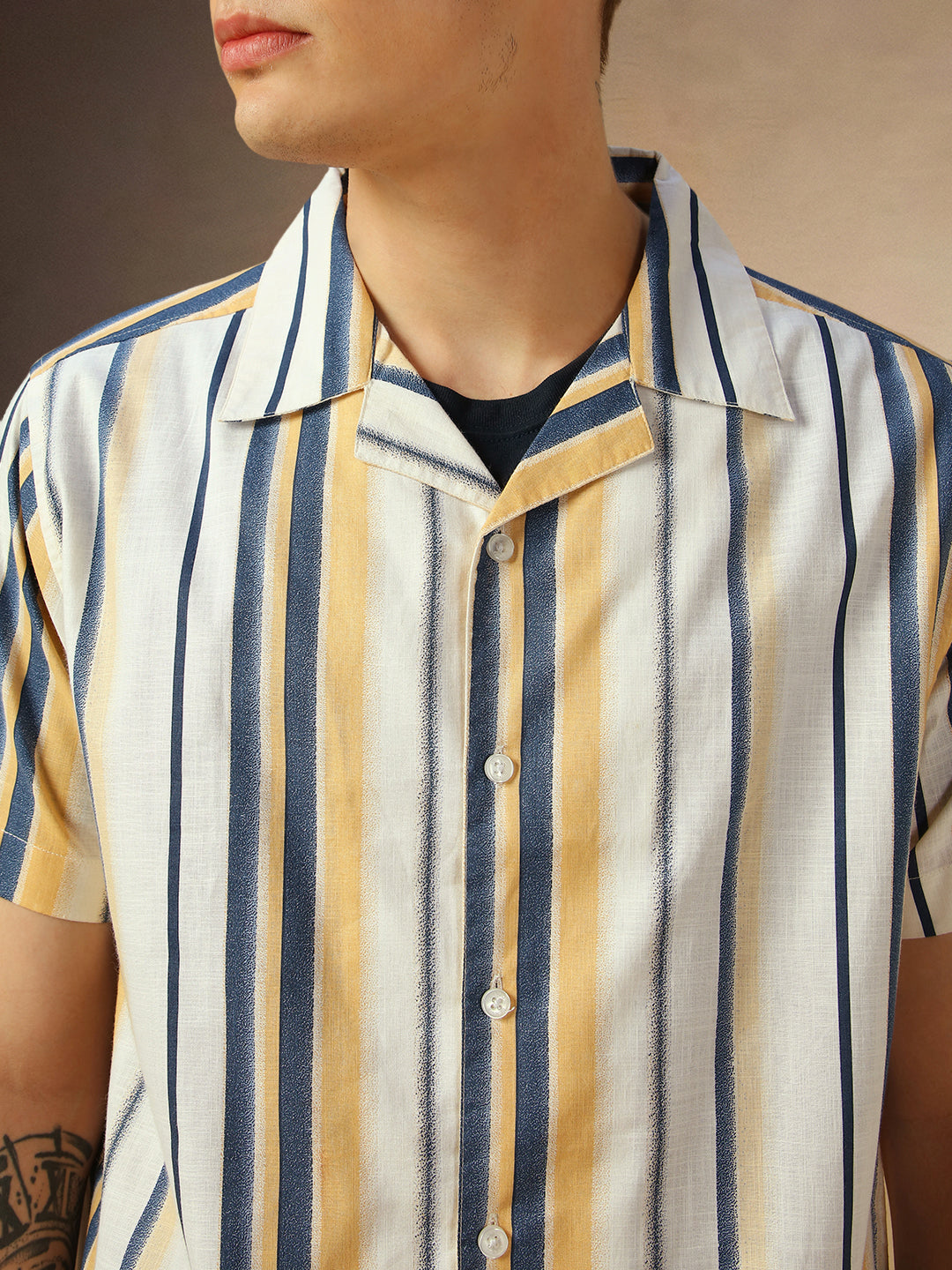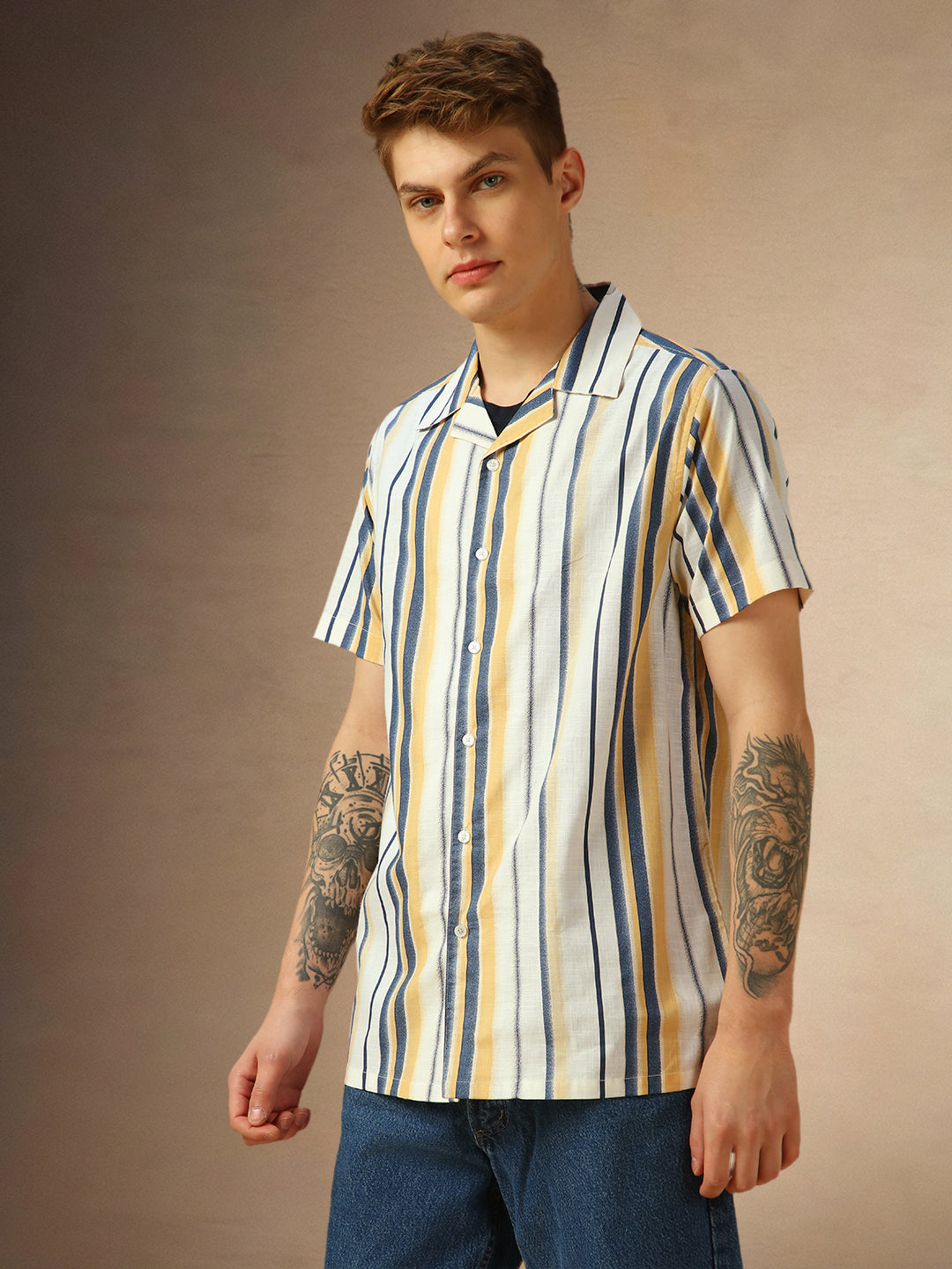 Men's Yellow Striped Cuban Collar Half Sleeves Shirt