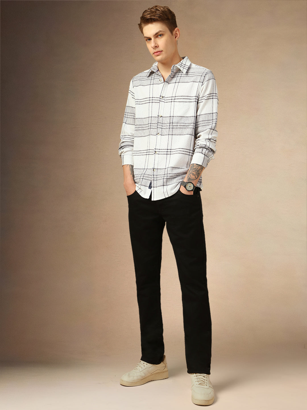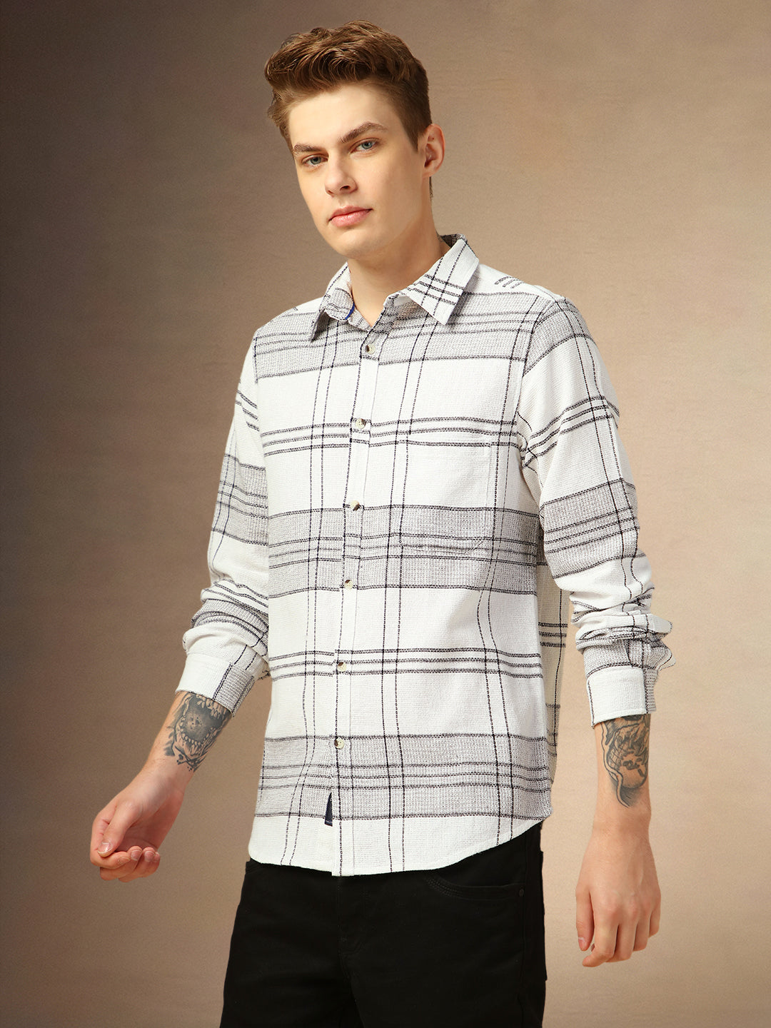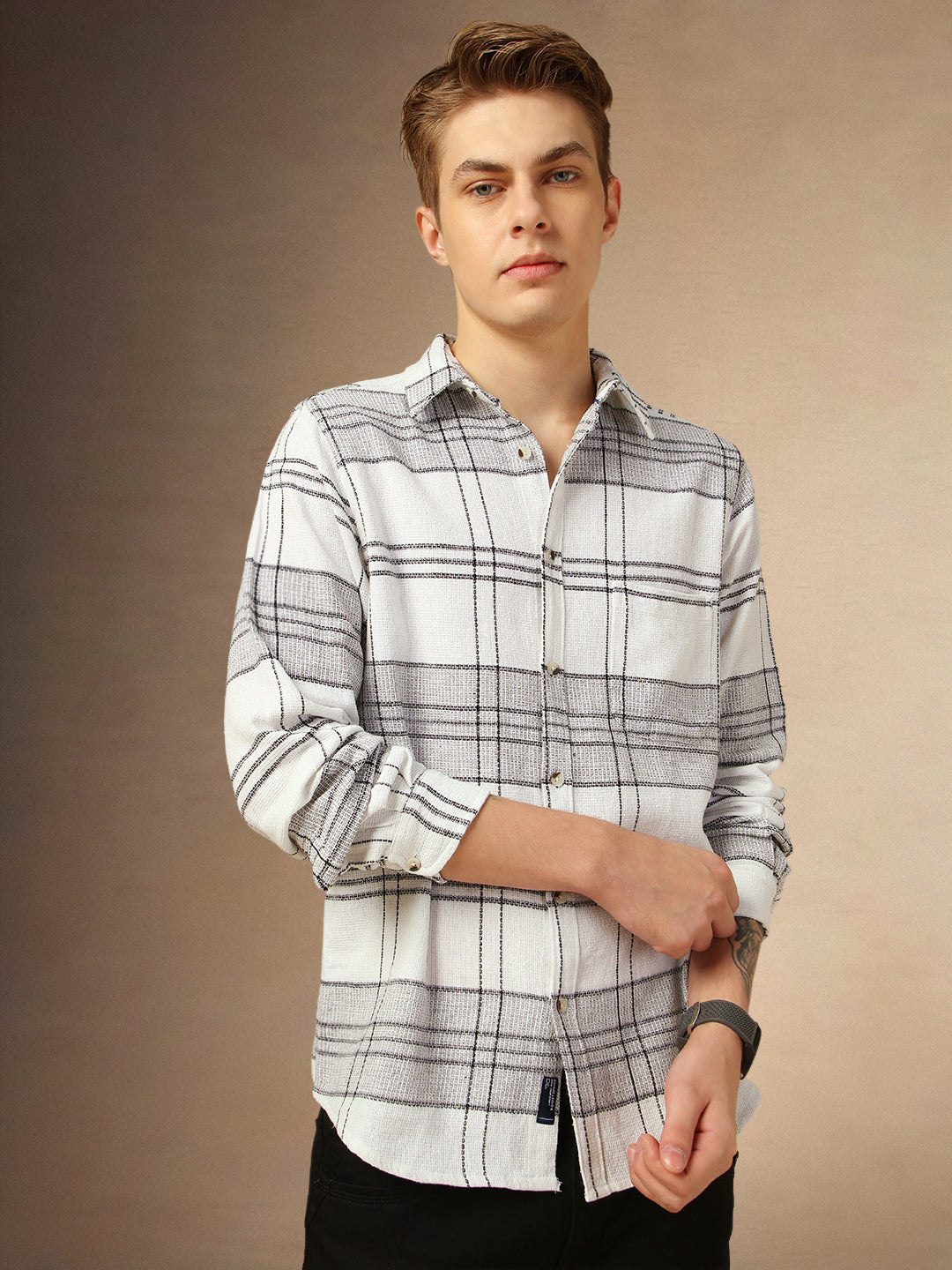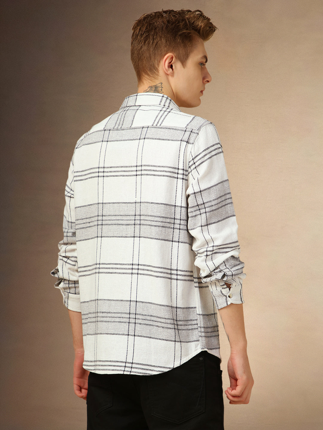 Men's Off White Checks Spread Collar Full Sleeves Shirt