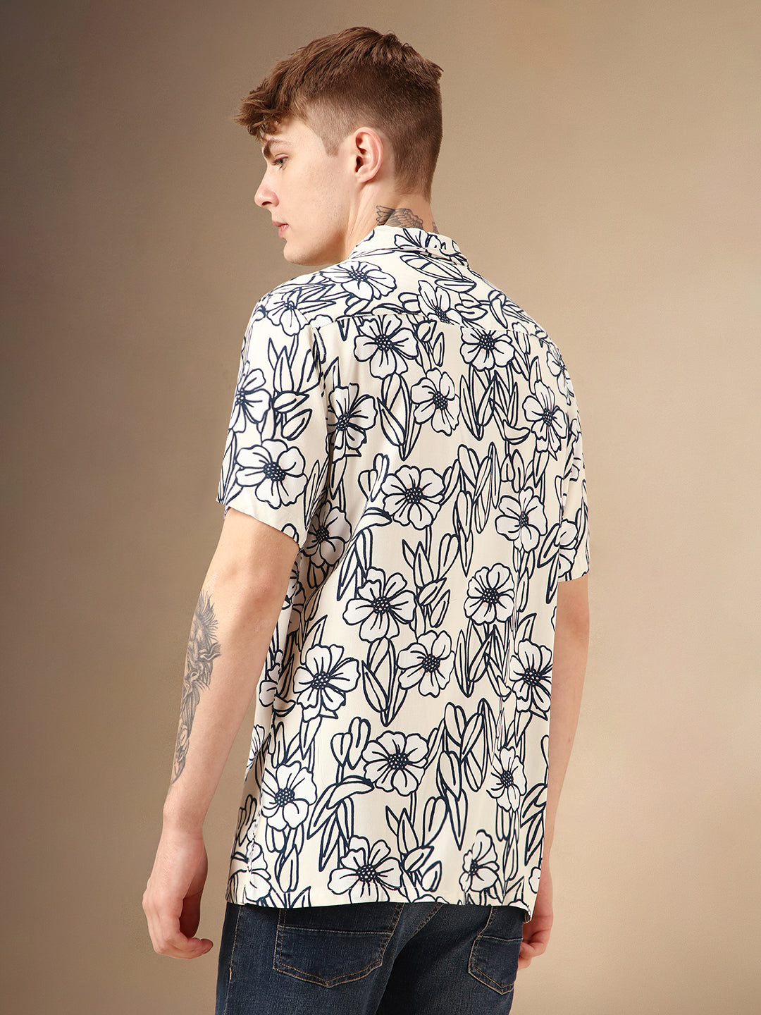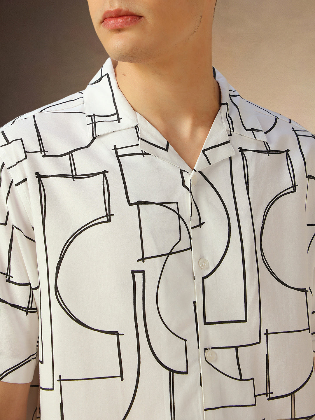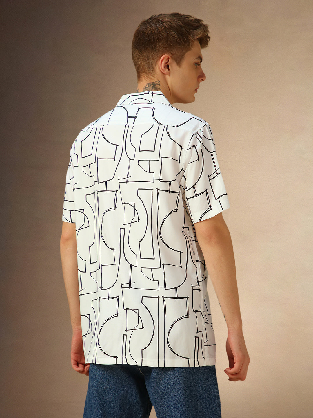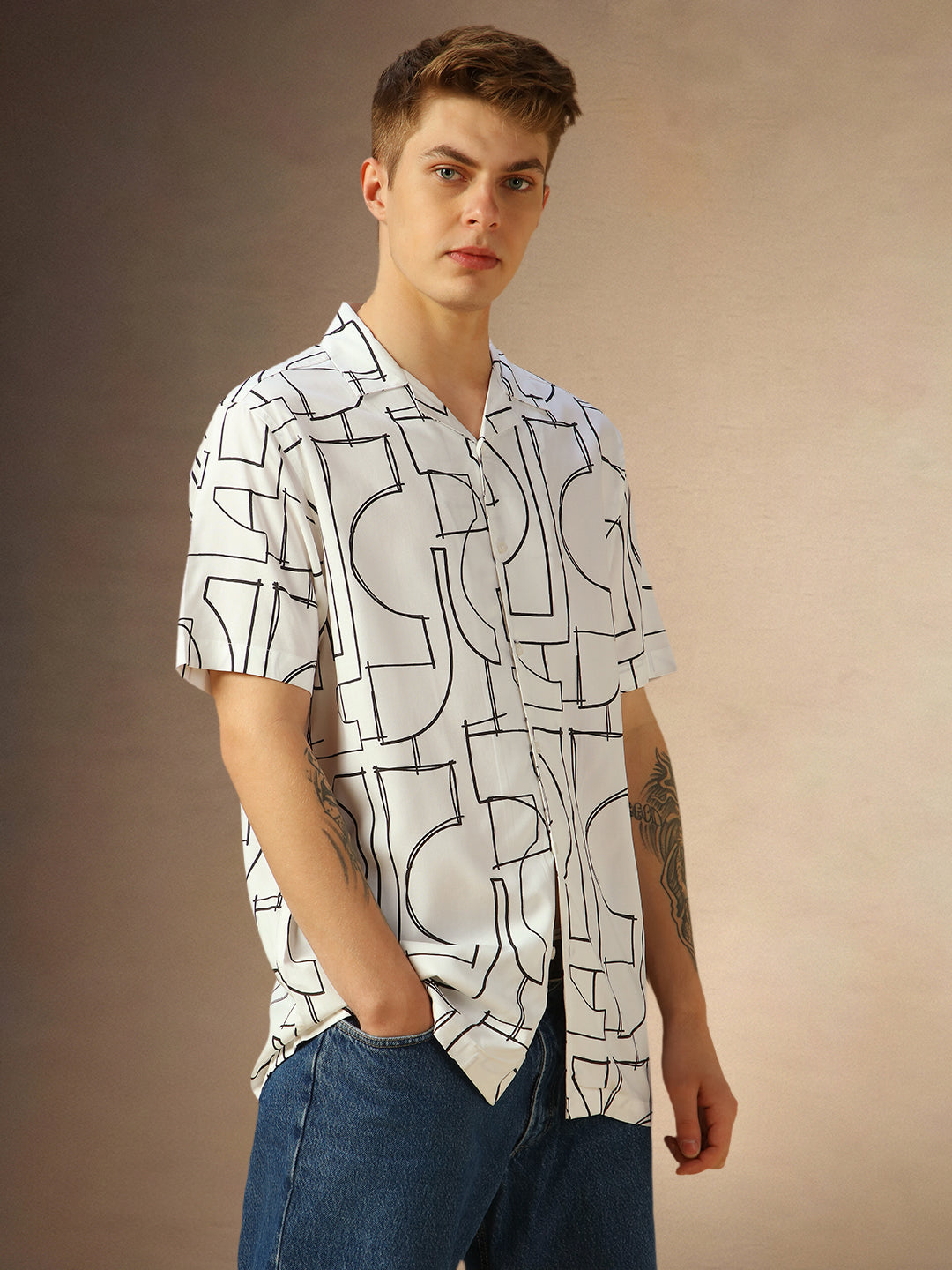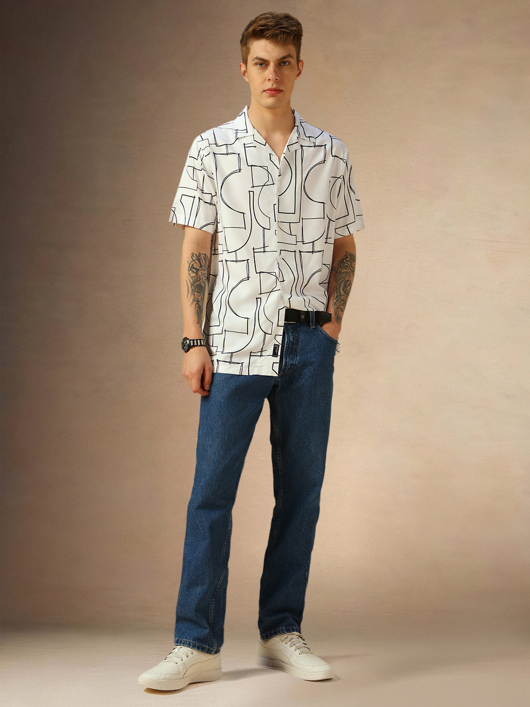 Men's White Printed Cuban collar Half Sleeves Shirt