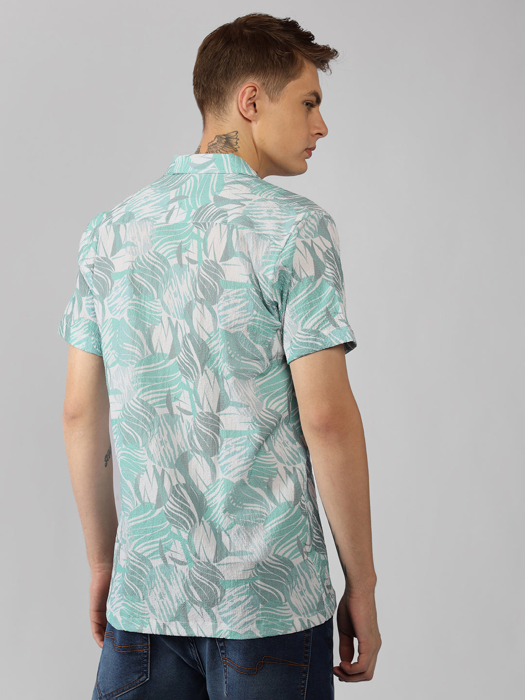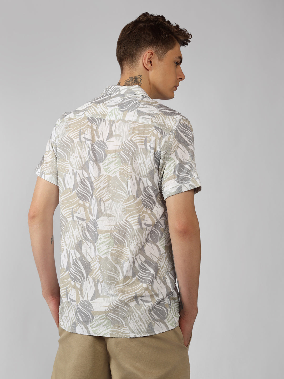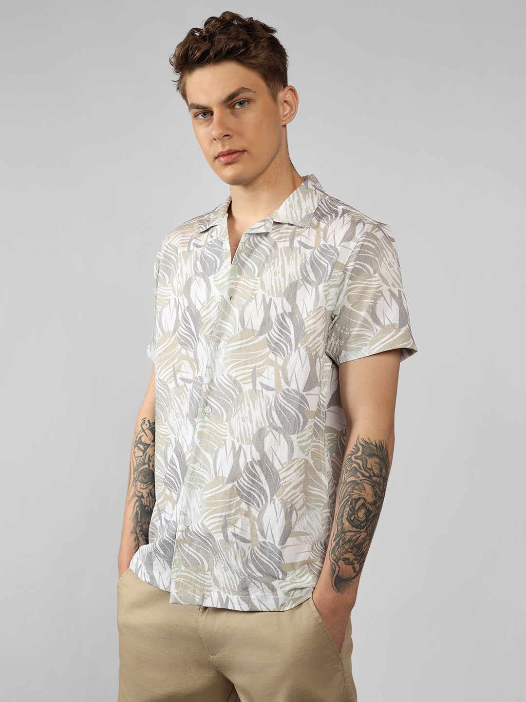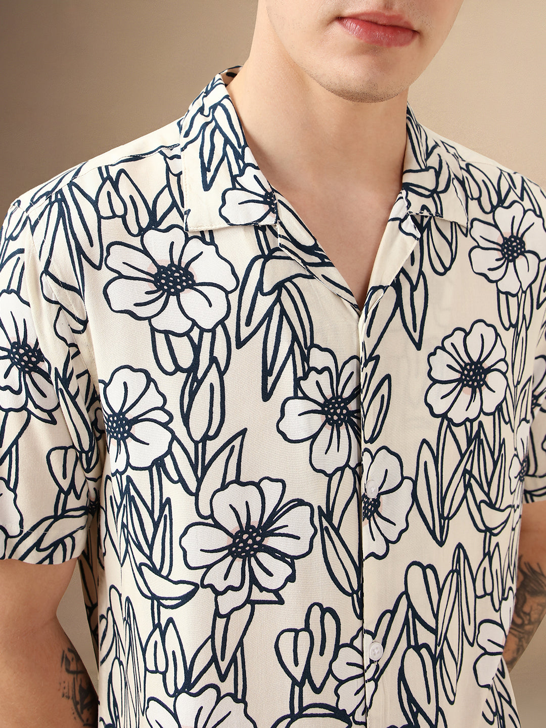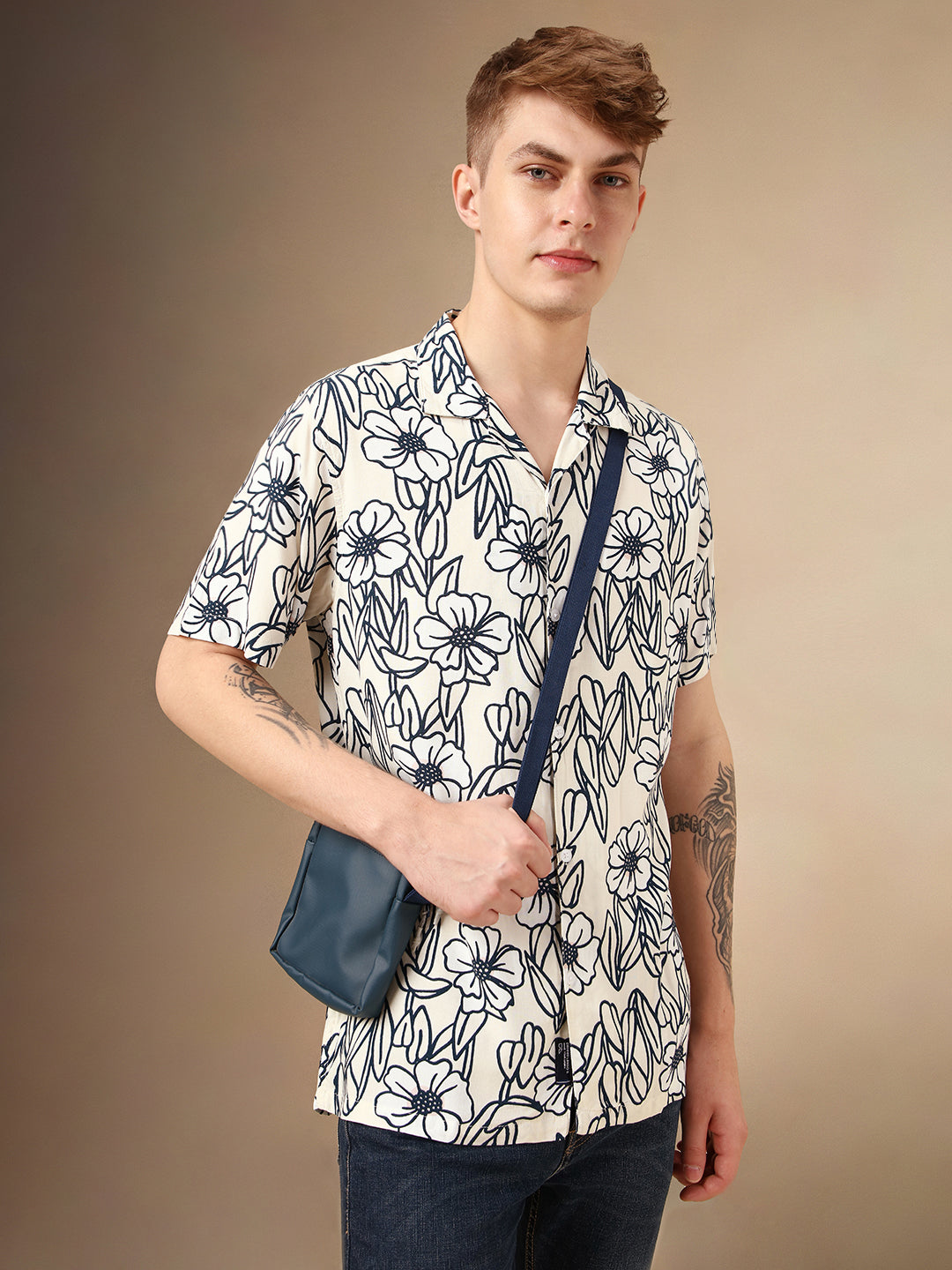 Men's White Printed Cuban collar Half Sleeves Shirt