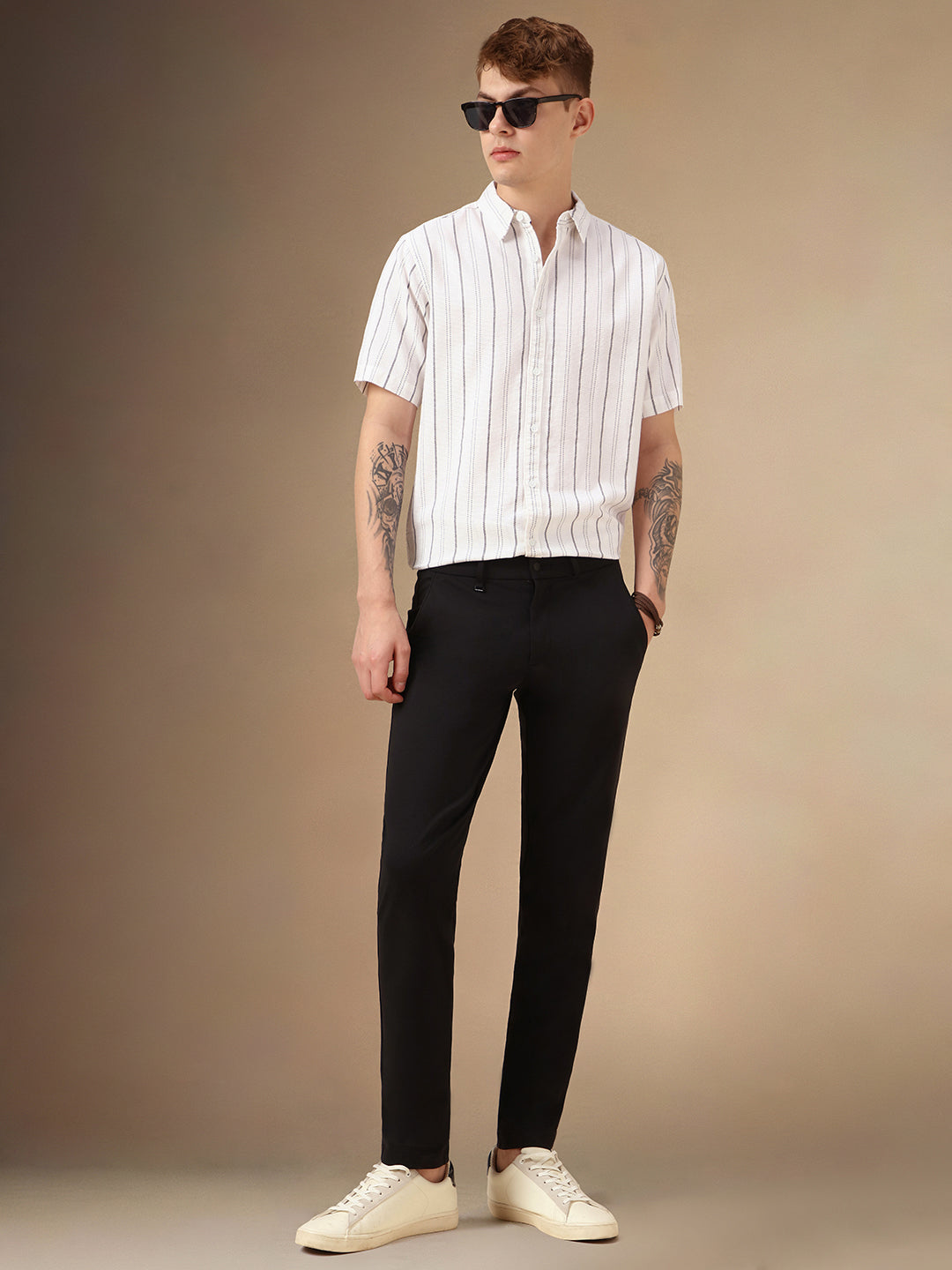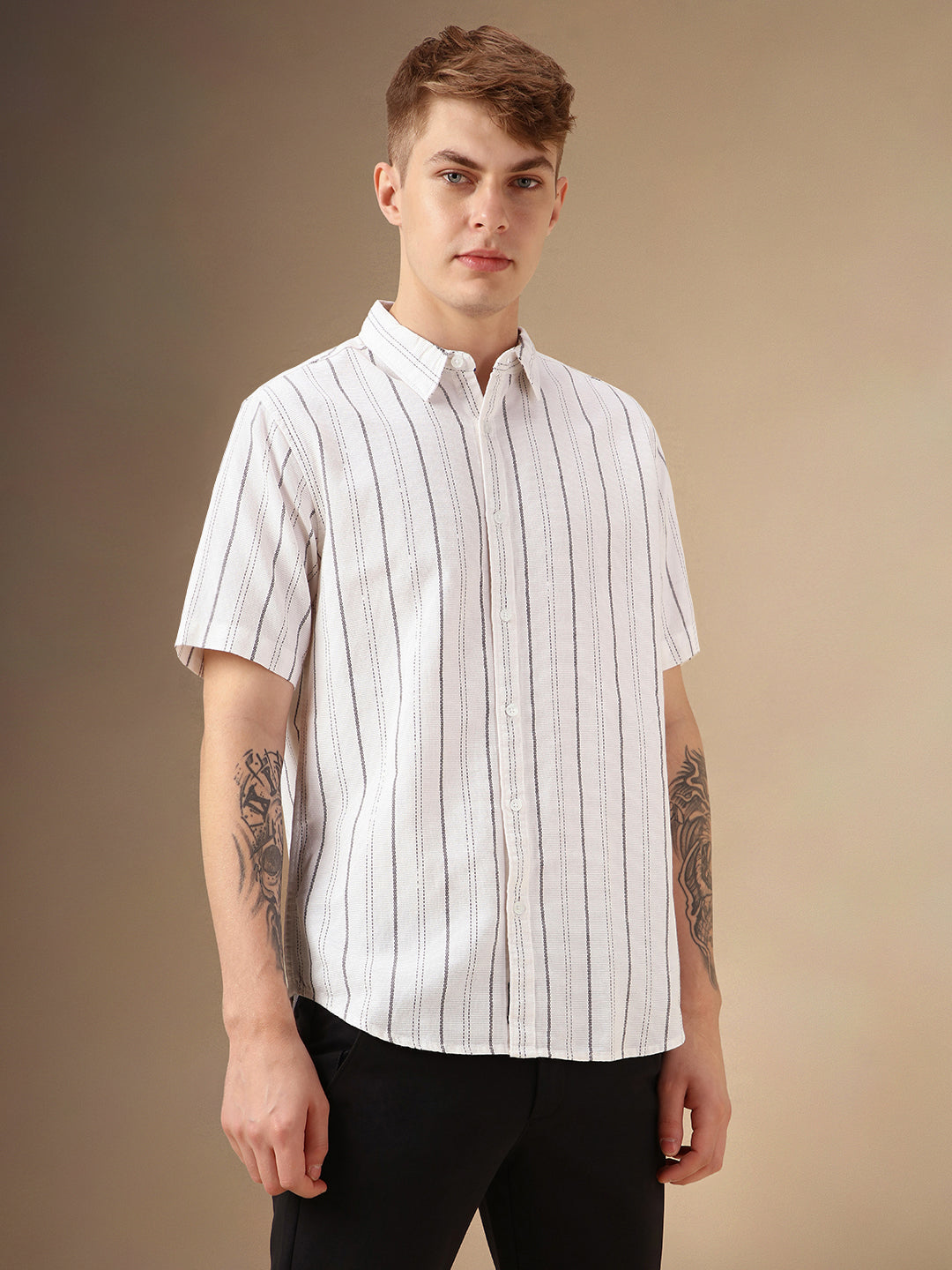 Men's White Striped Spread Collar Half Sleeves Casual Shirt