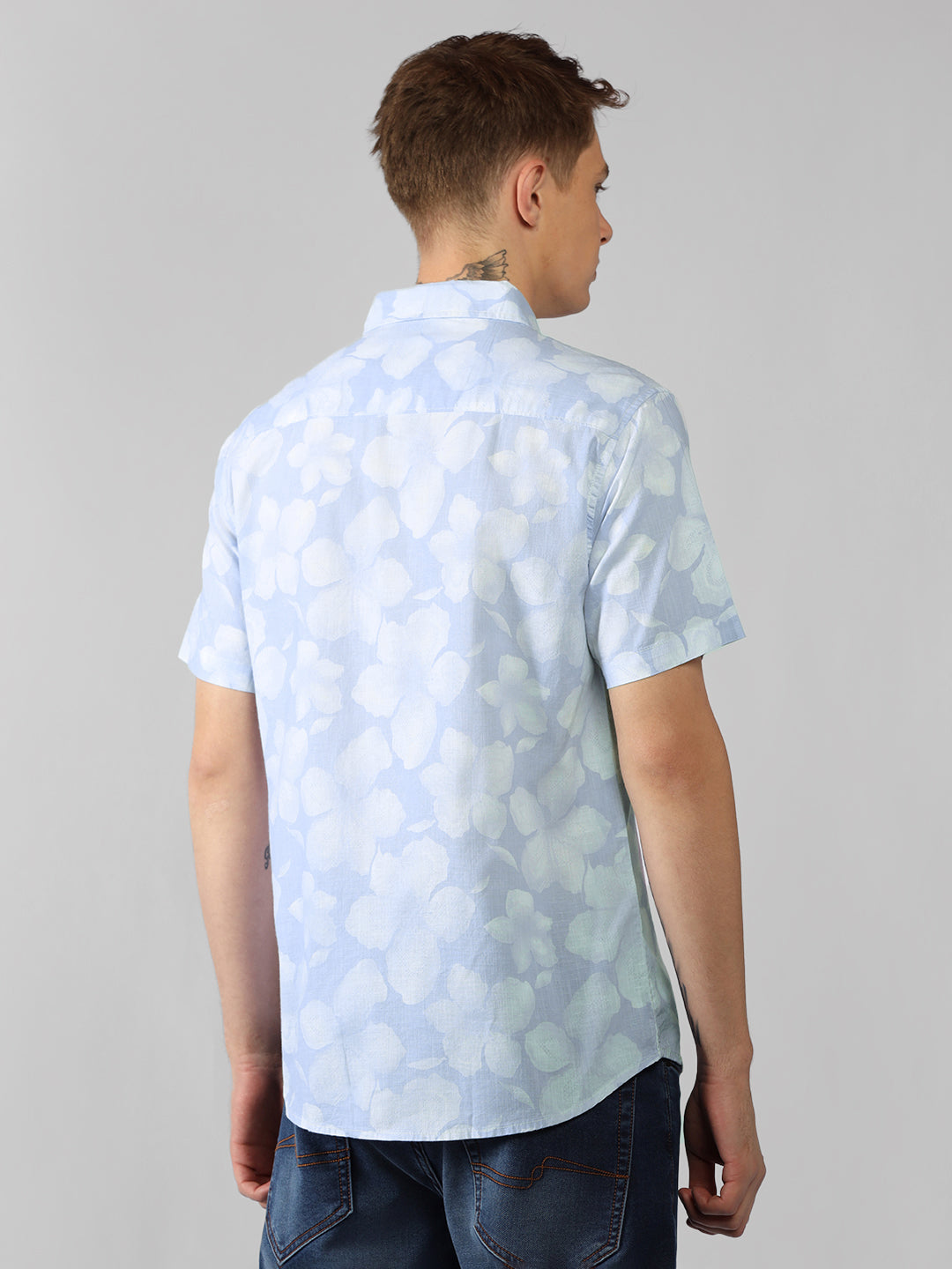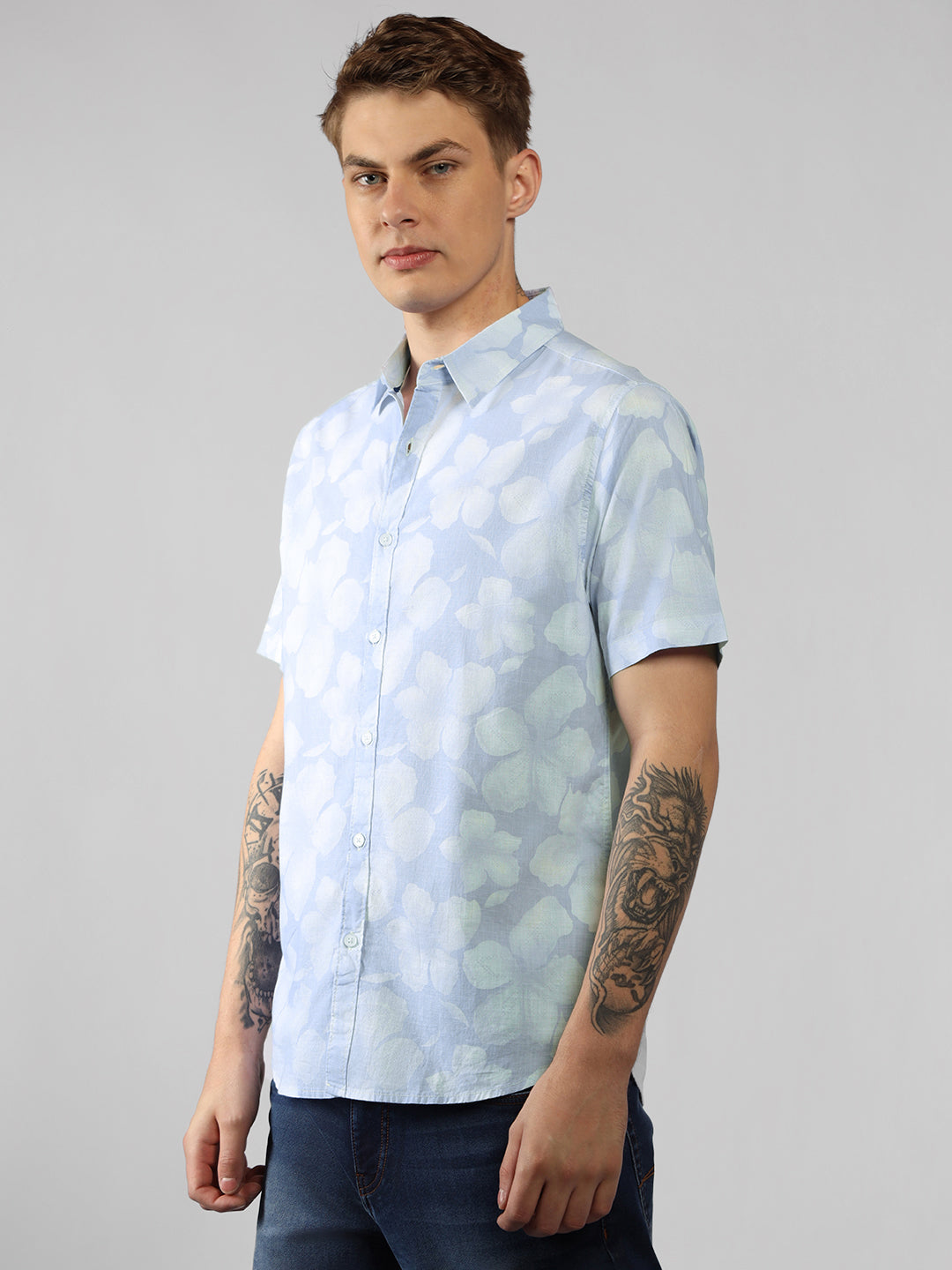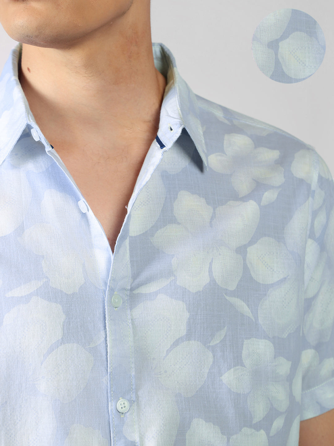 Men's Blue Floral Print Spread Collar Short Sleeves Relaxed Fit Casual Shirt