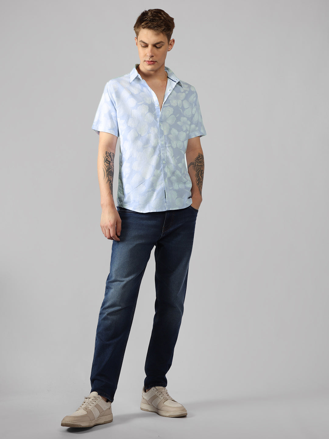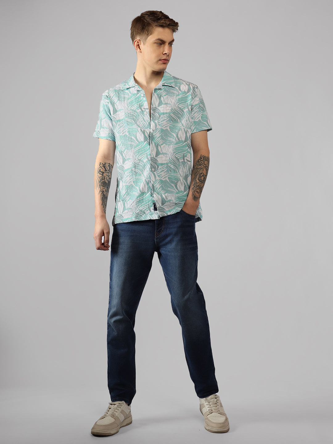 Men's Blue Printed Cuban Collar Half Sleeve Relaxed Fit Shirt