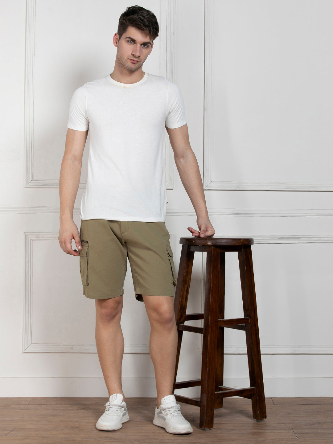 Men's Light Olive Relaxed Fit Mid-Rise Solid Cargo Shorts