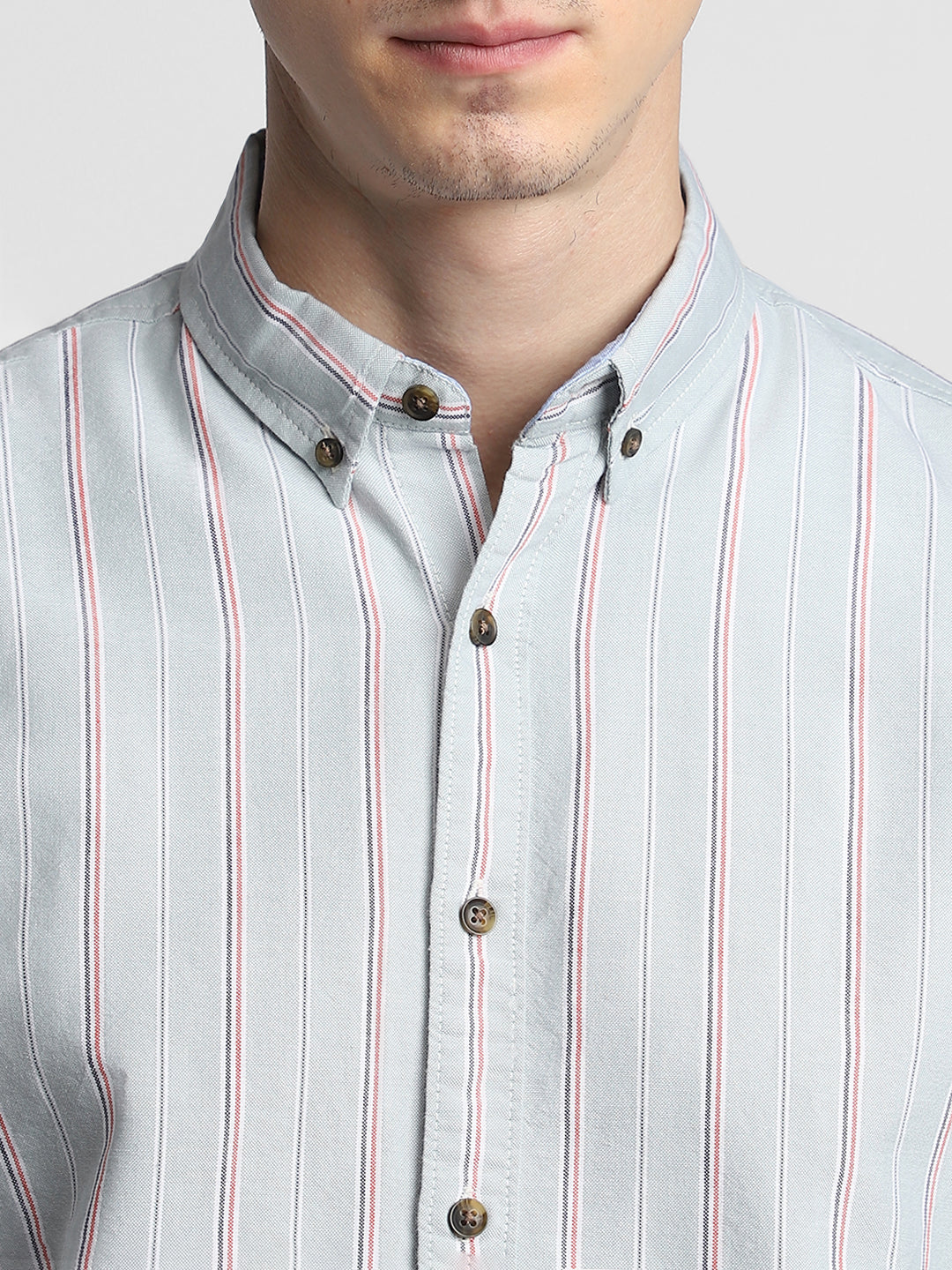 Men's Button Down Collar Slim Fit Stripes Green Casual Shirts