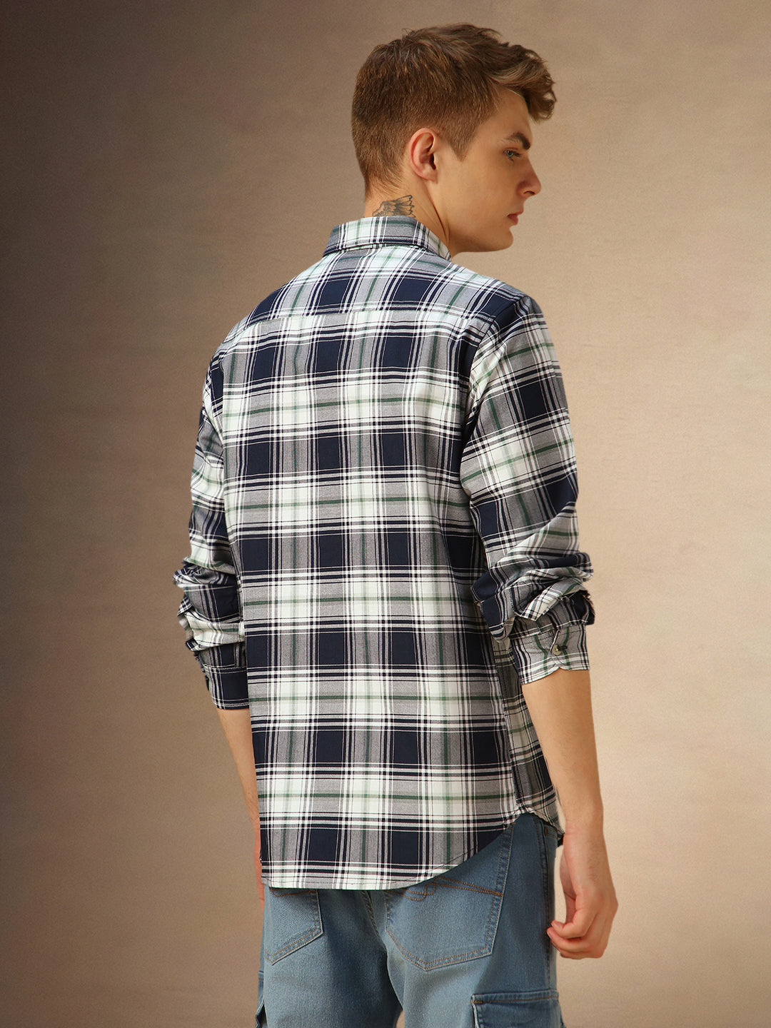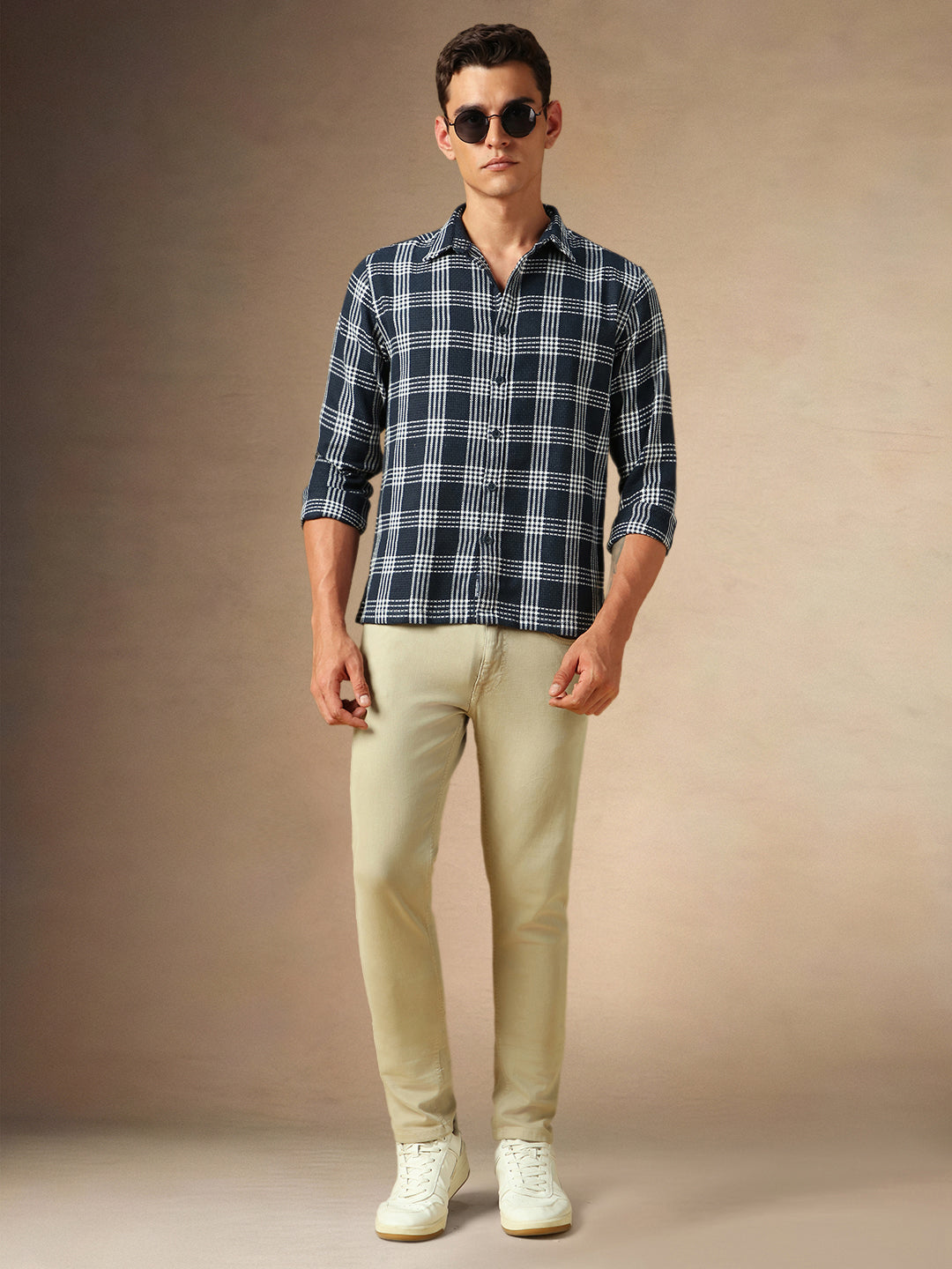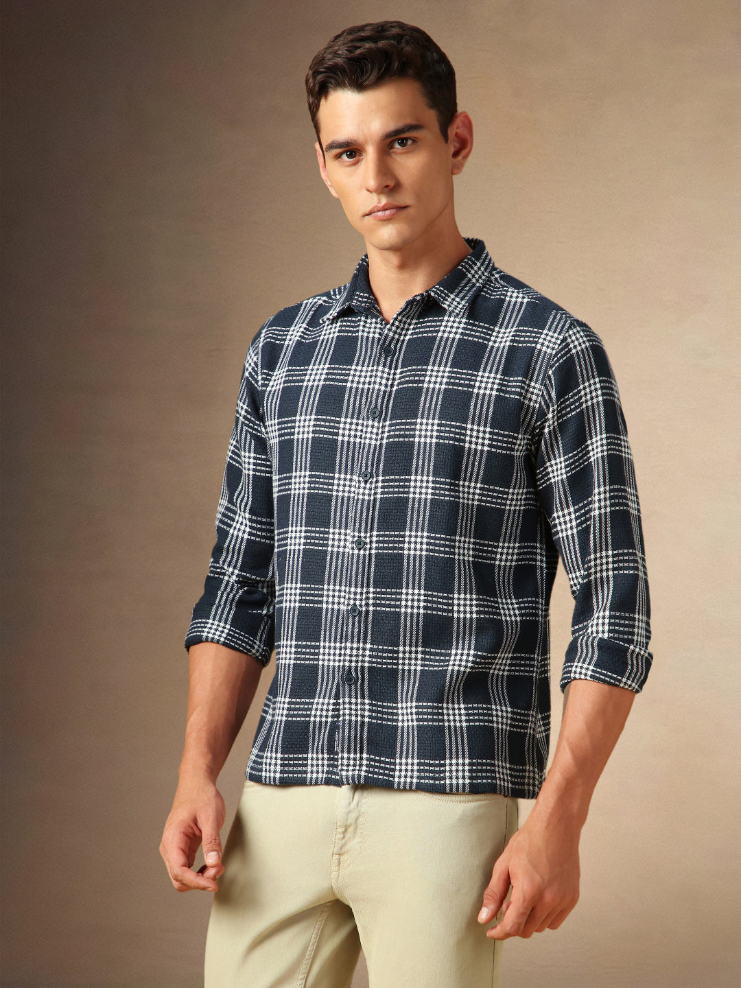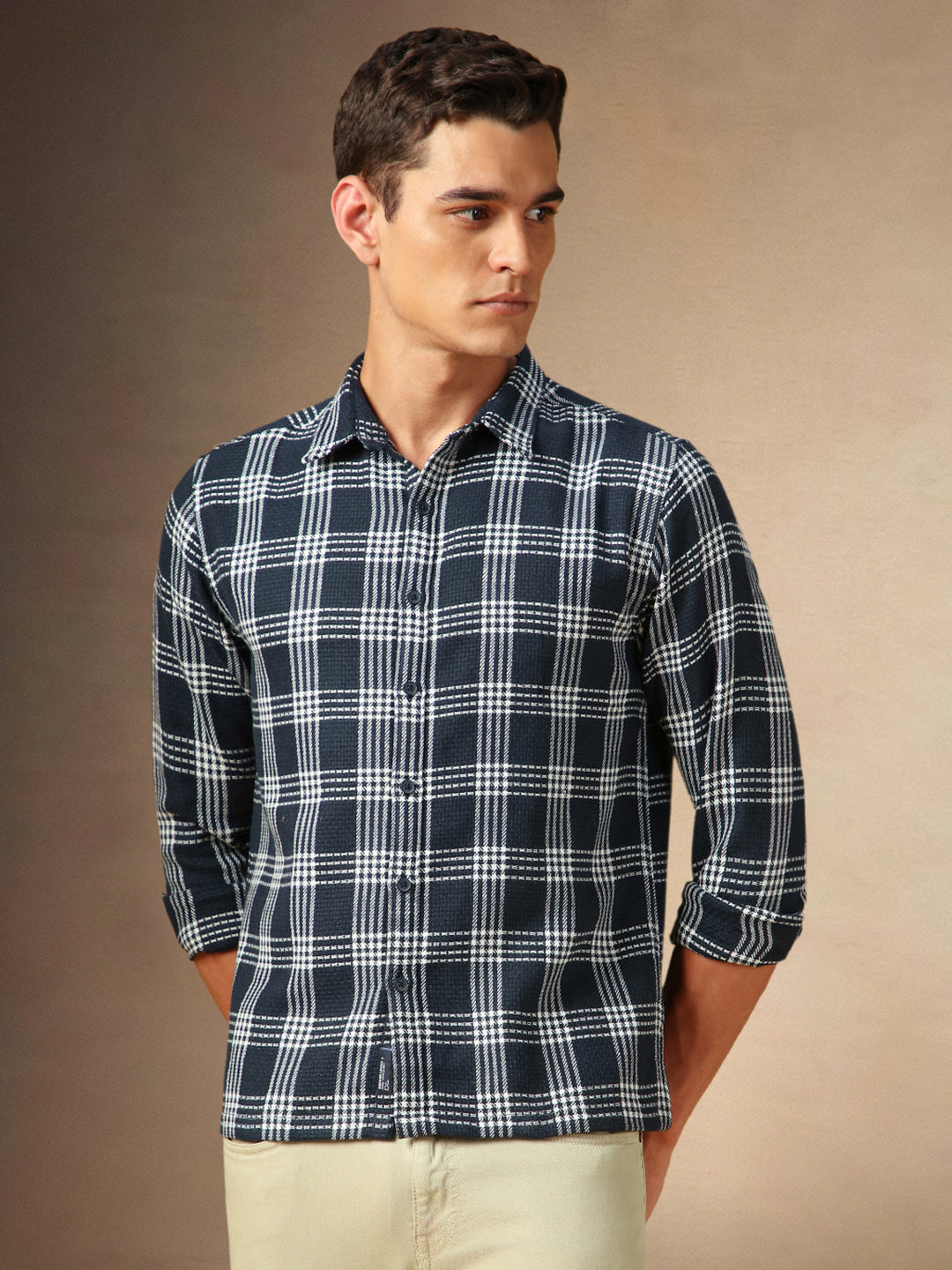 Men's Navy Checks Spread Collar Full Sleeves Casual Shirt