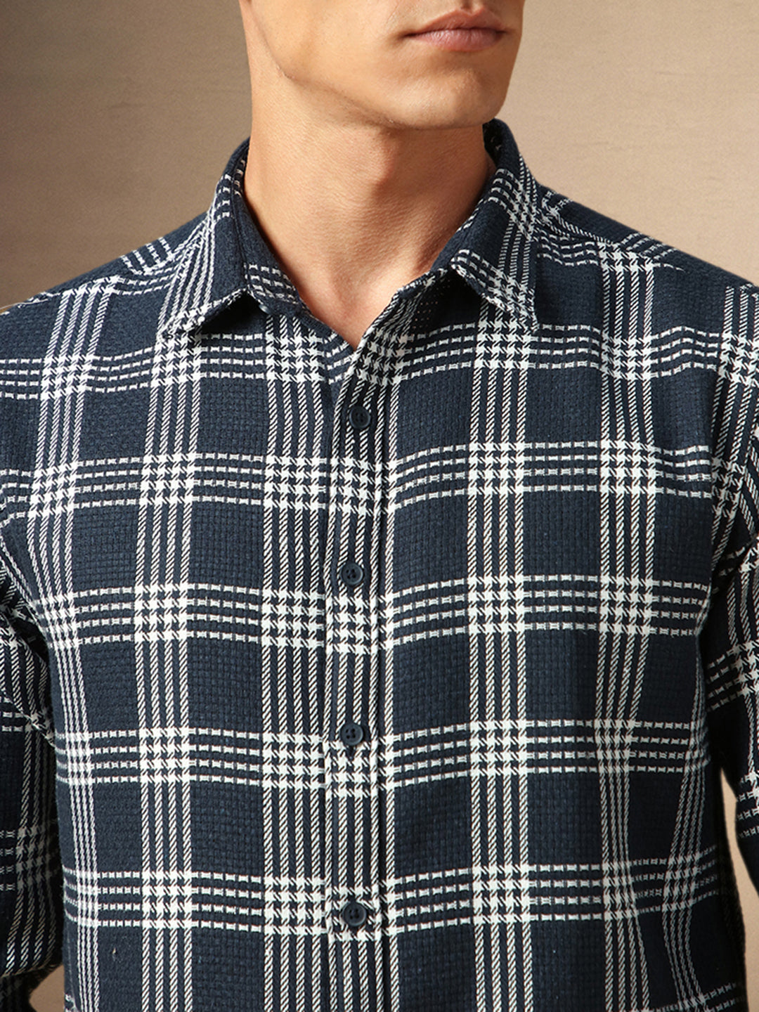 Men's Navy Blue Checks Spread Collar Full Sleeves Shirt