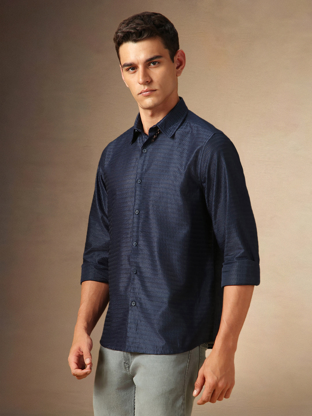 Men's Brown Textured Mandarin Collar Full Sleeves Cotton Slub Casual Shirt