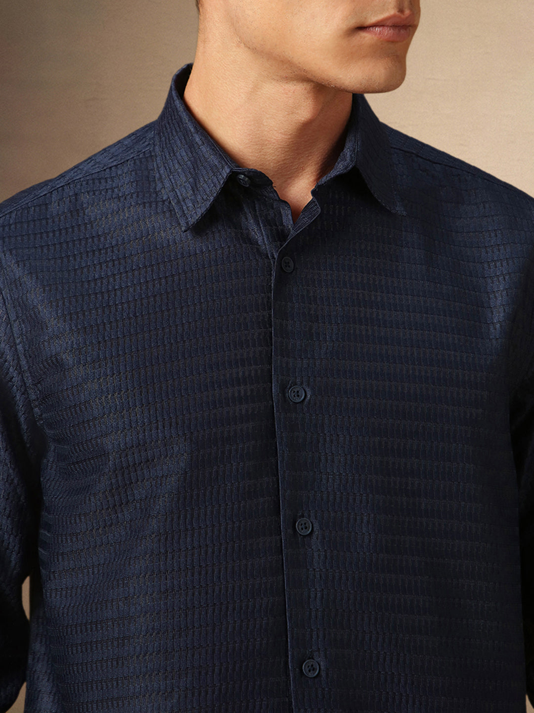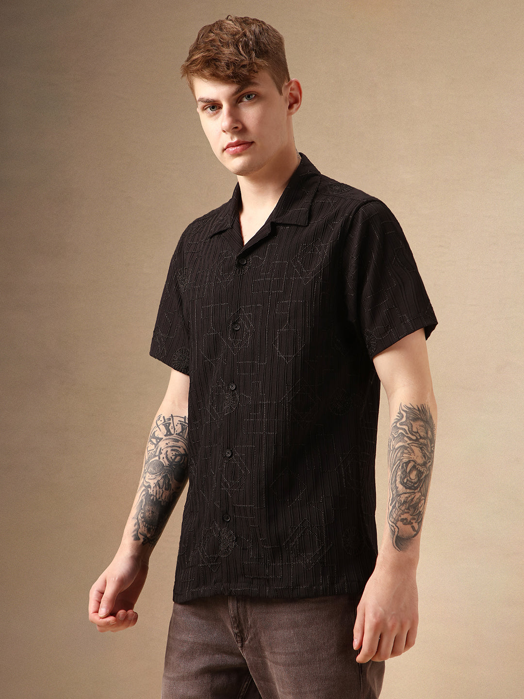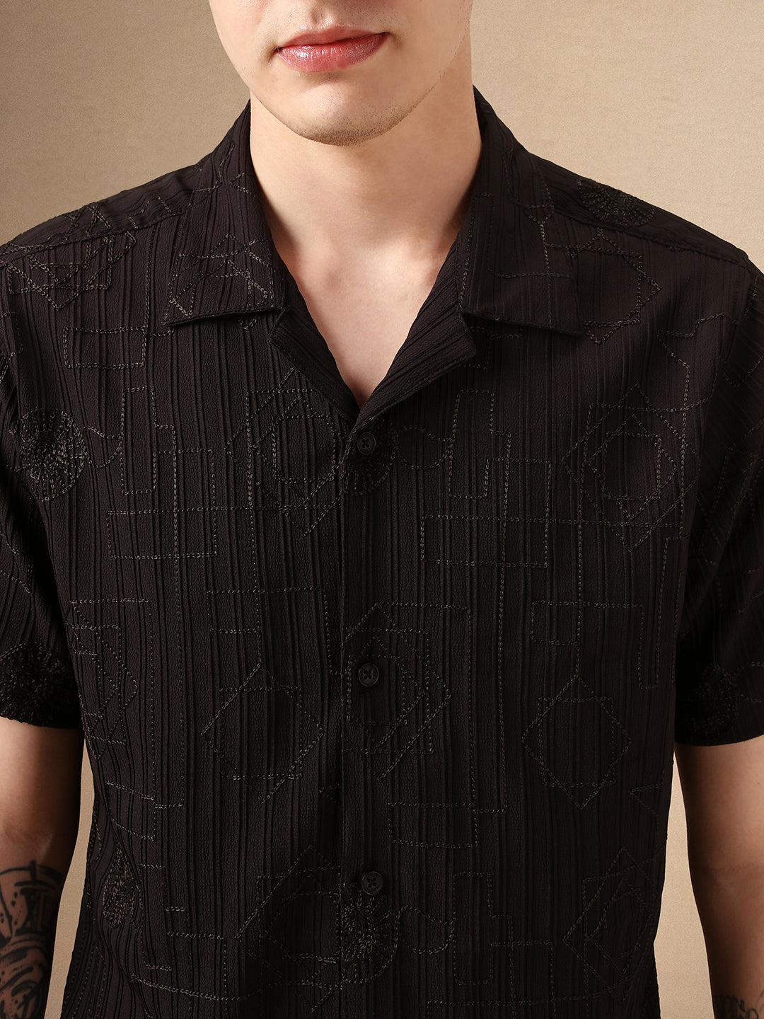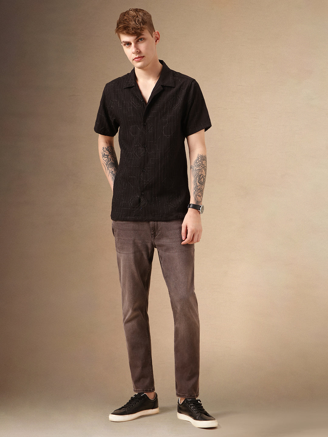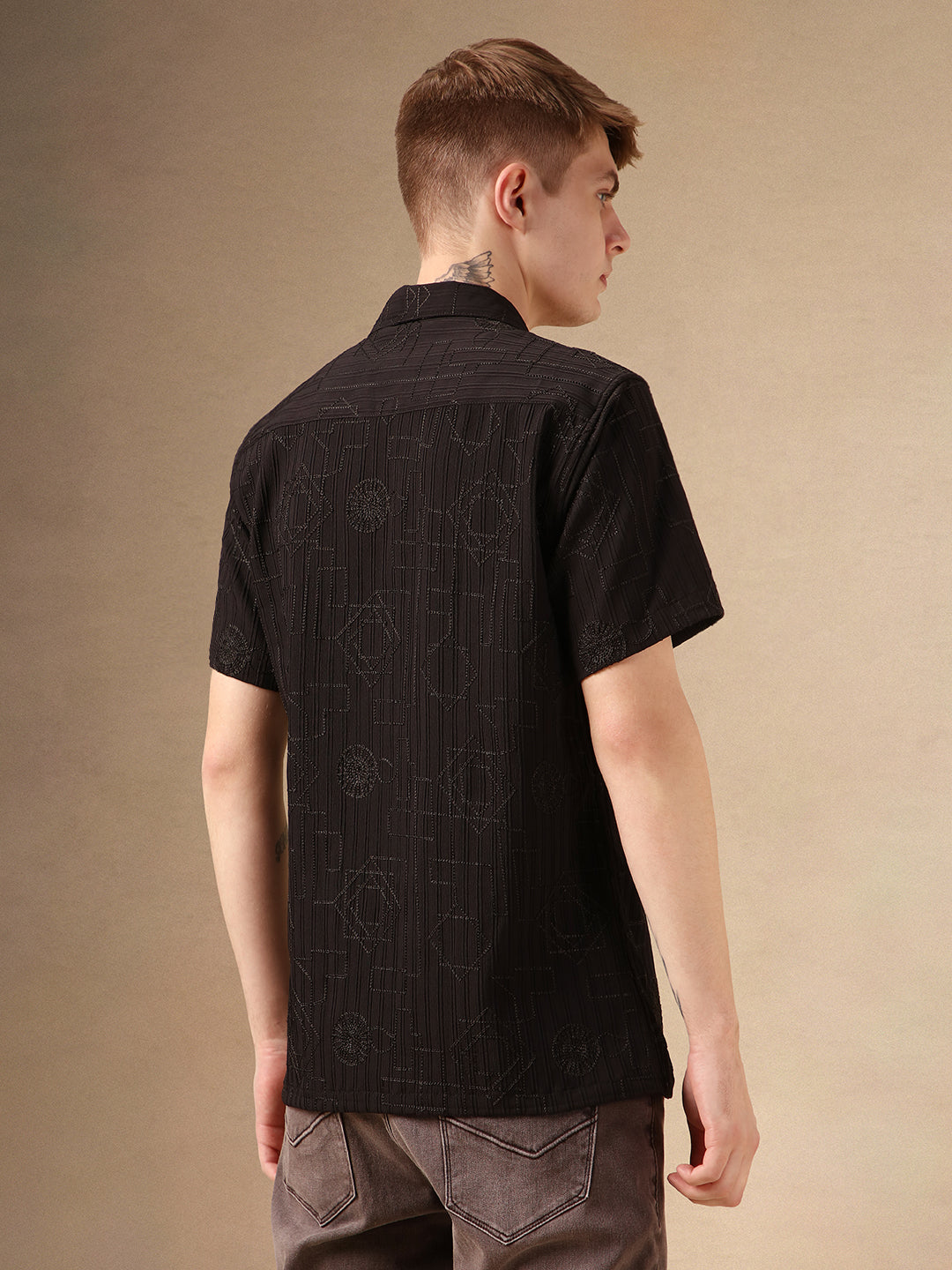 Men's Black Textured Spread Collar Full Sleeves Casual Shirt