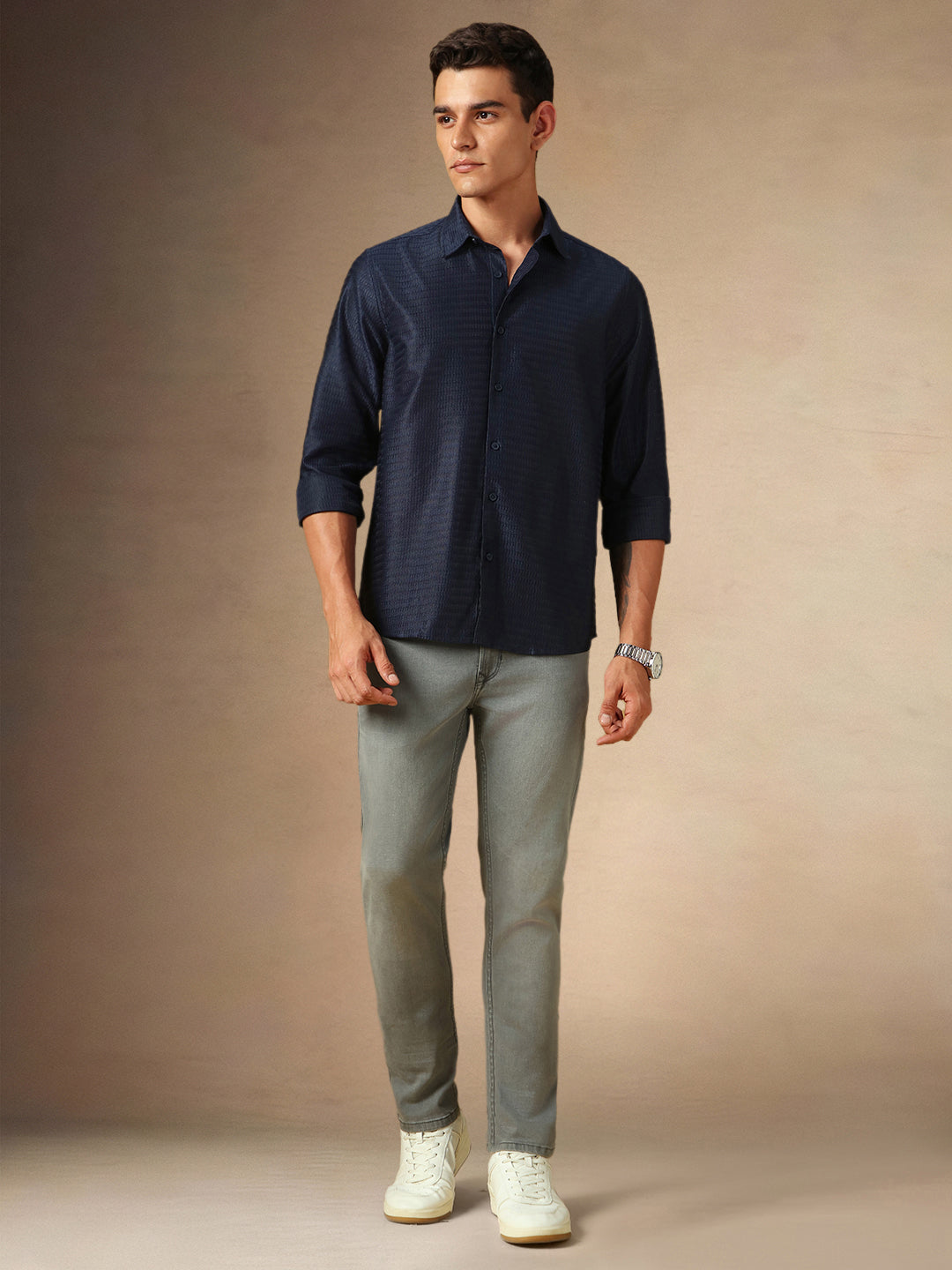 Men Light Grey Solid Spread Collar Full Sleeves Regular Fit Shirt