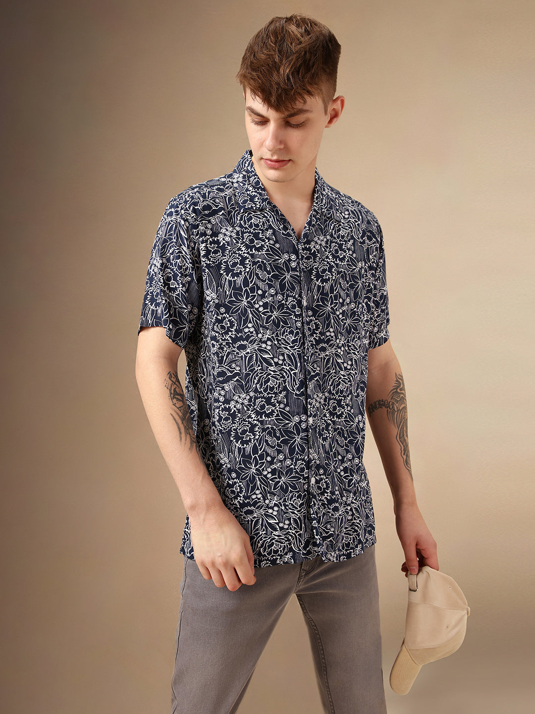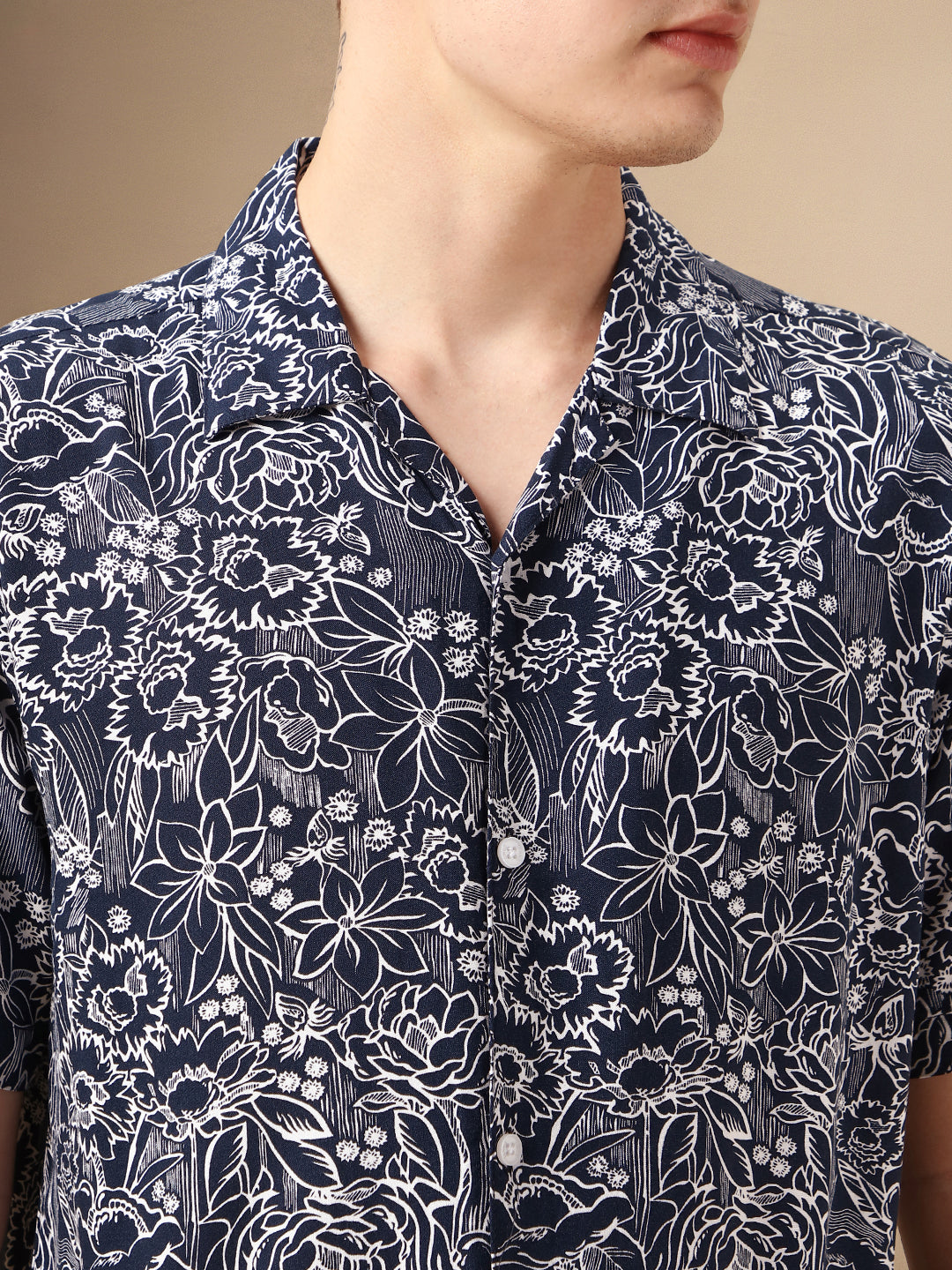 Men's Navy Printed Cuban Collar Half Sleeves Rayon Casual Shirt