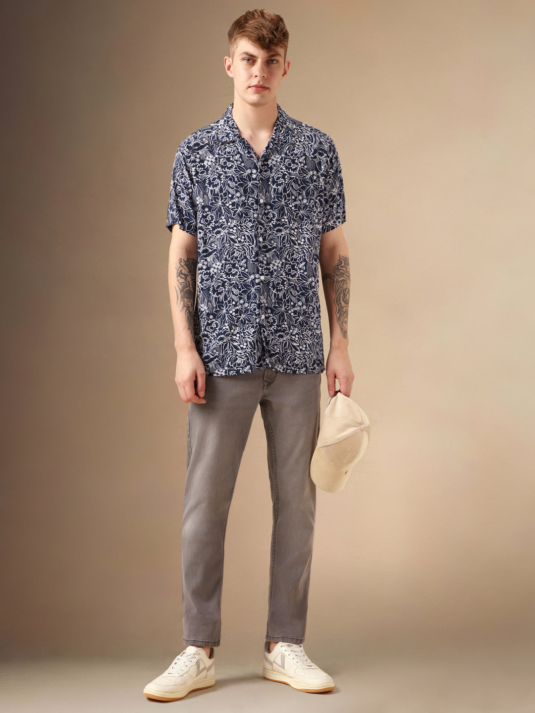 Men's Beige Solid Cuban Collar Half Sleeves Cotton Casual Shirt