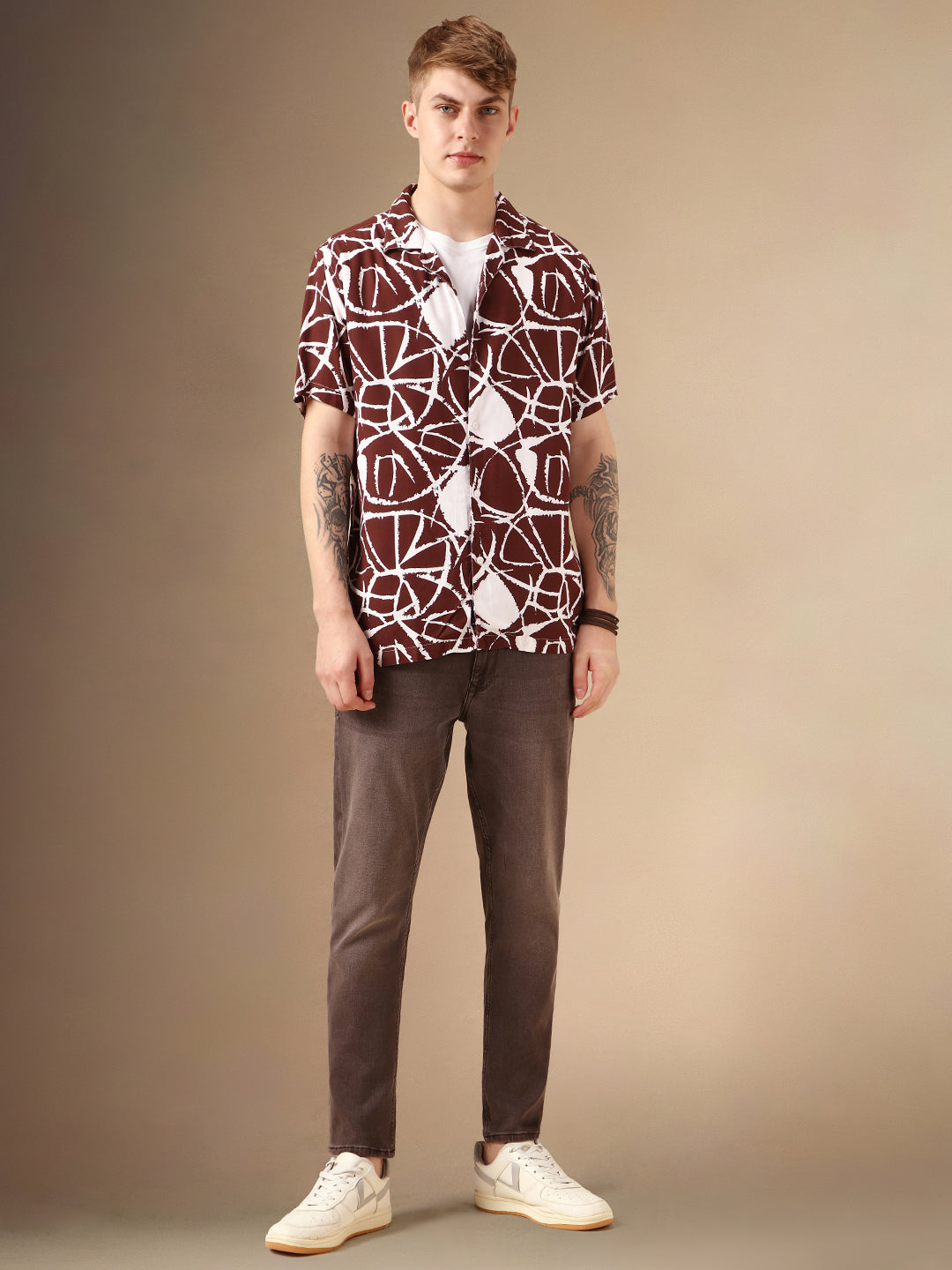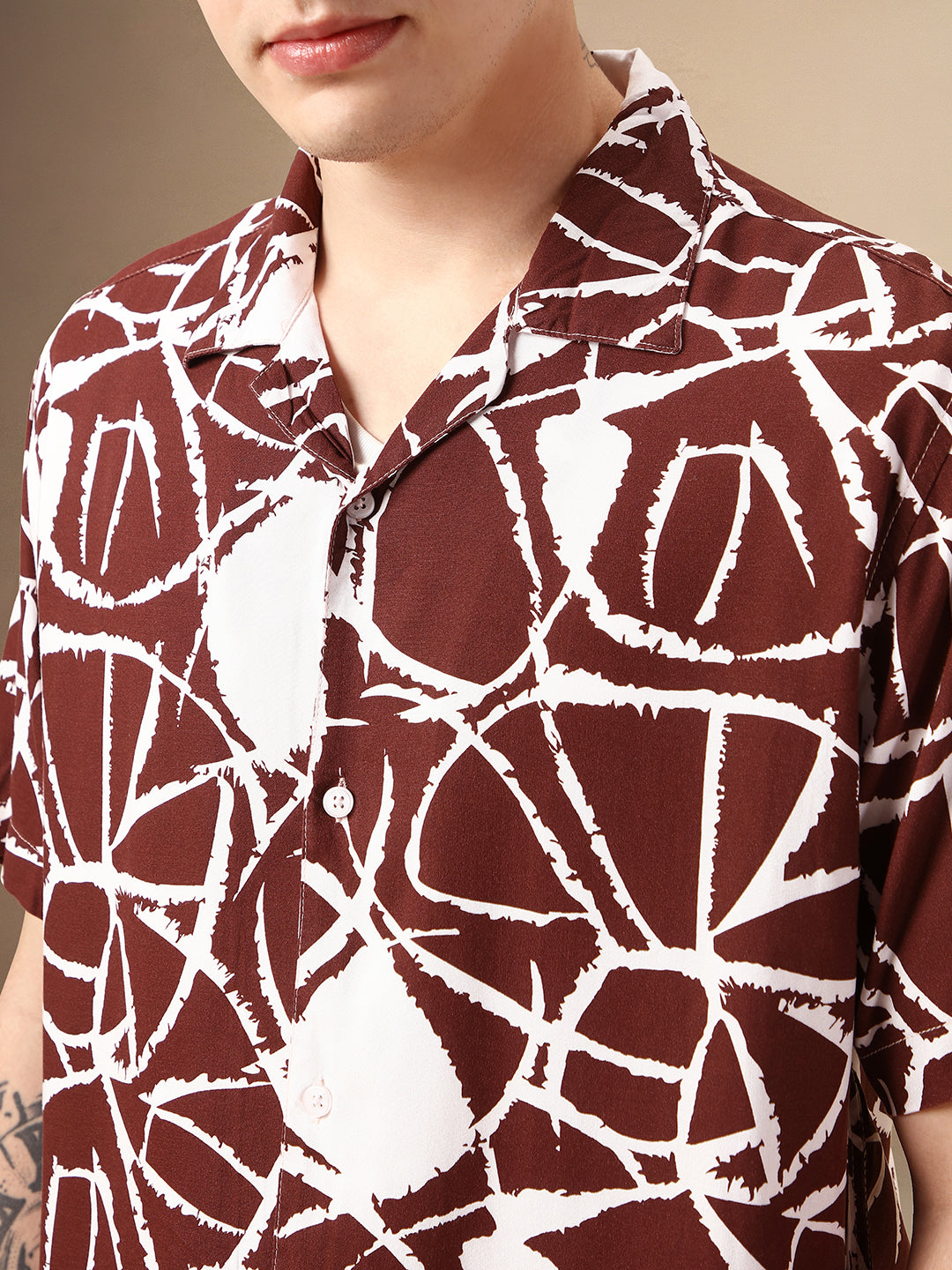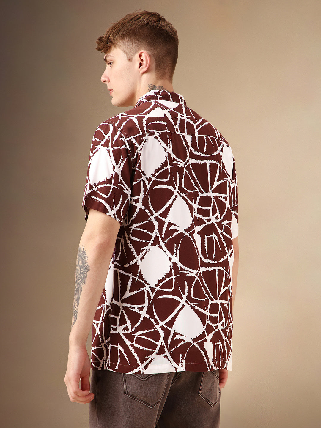 Men's Brown Printed Cuban Collar Half Sleeves Rayon Casual Shirt
