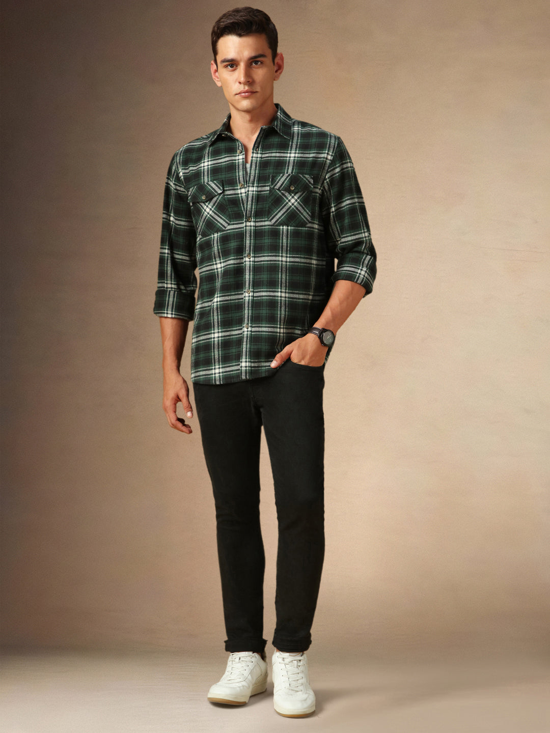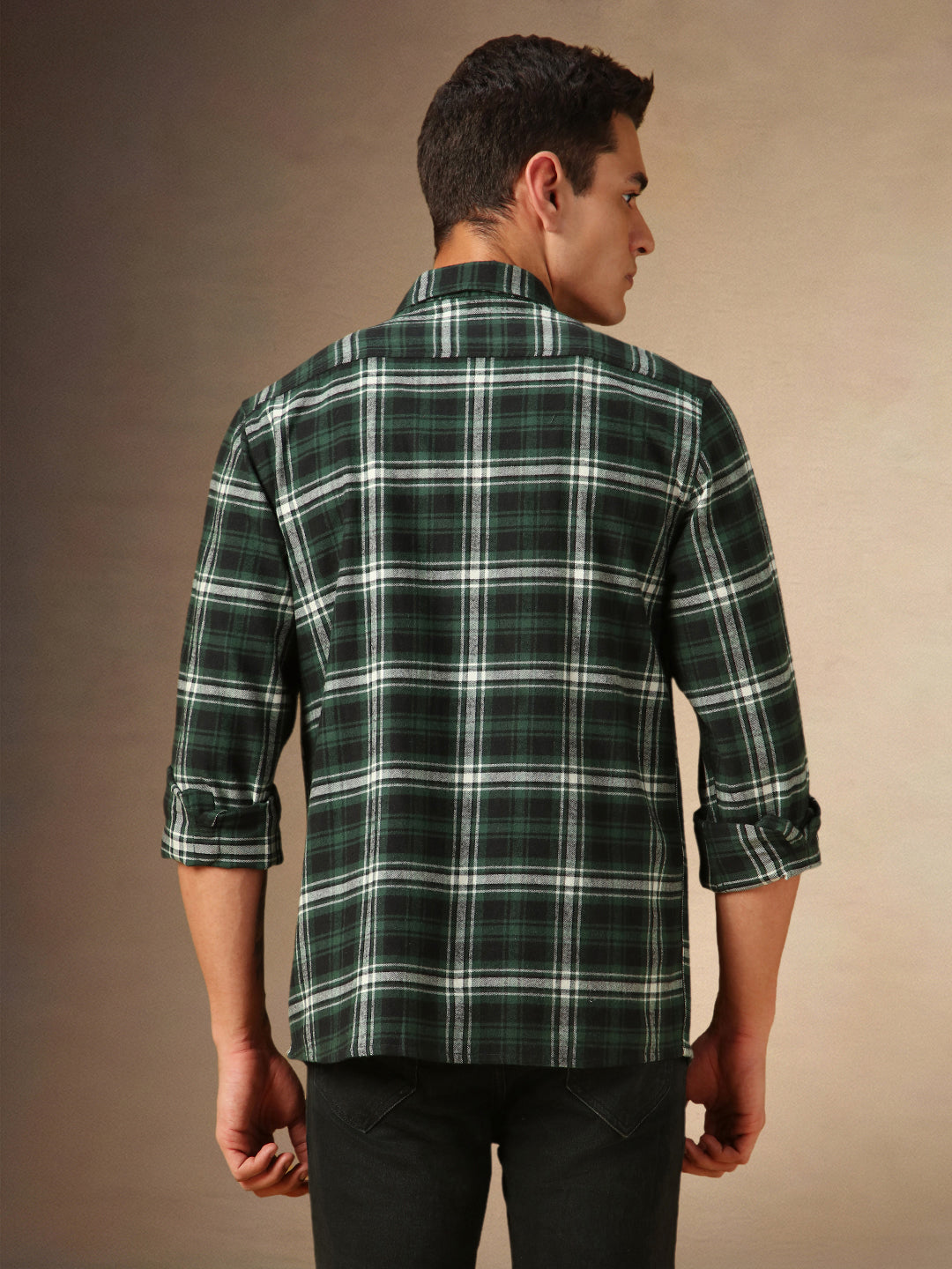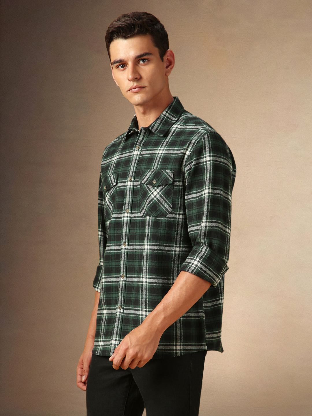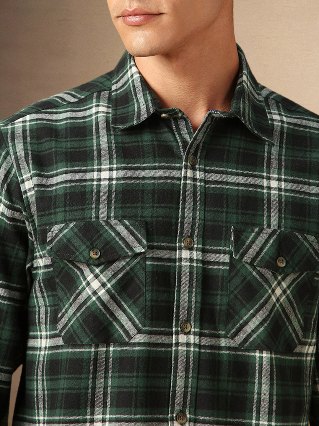 Men's Green Checks Spread Collar Full Sleeves Casual Flannel Shacket