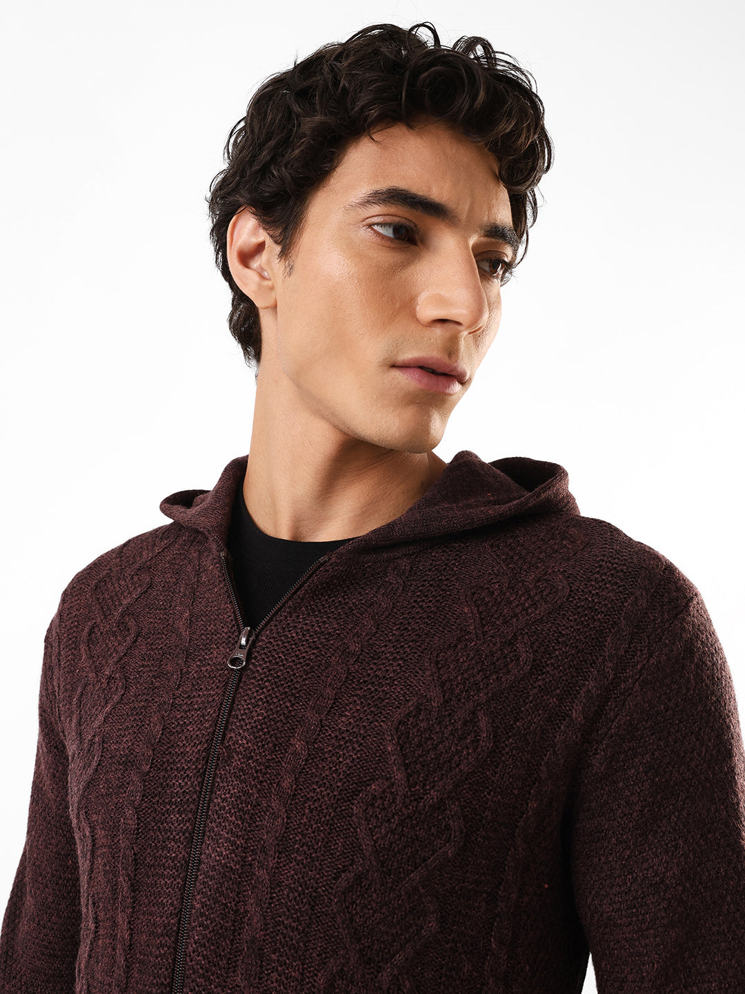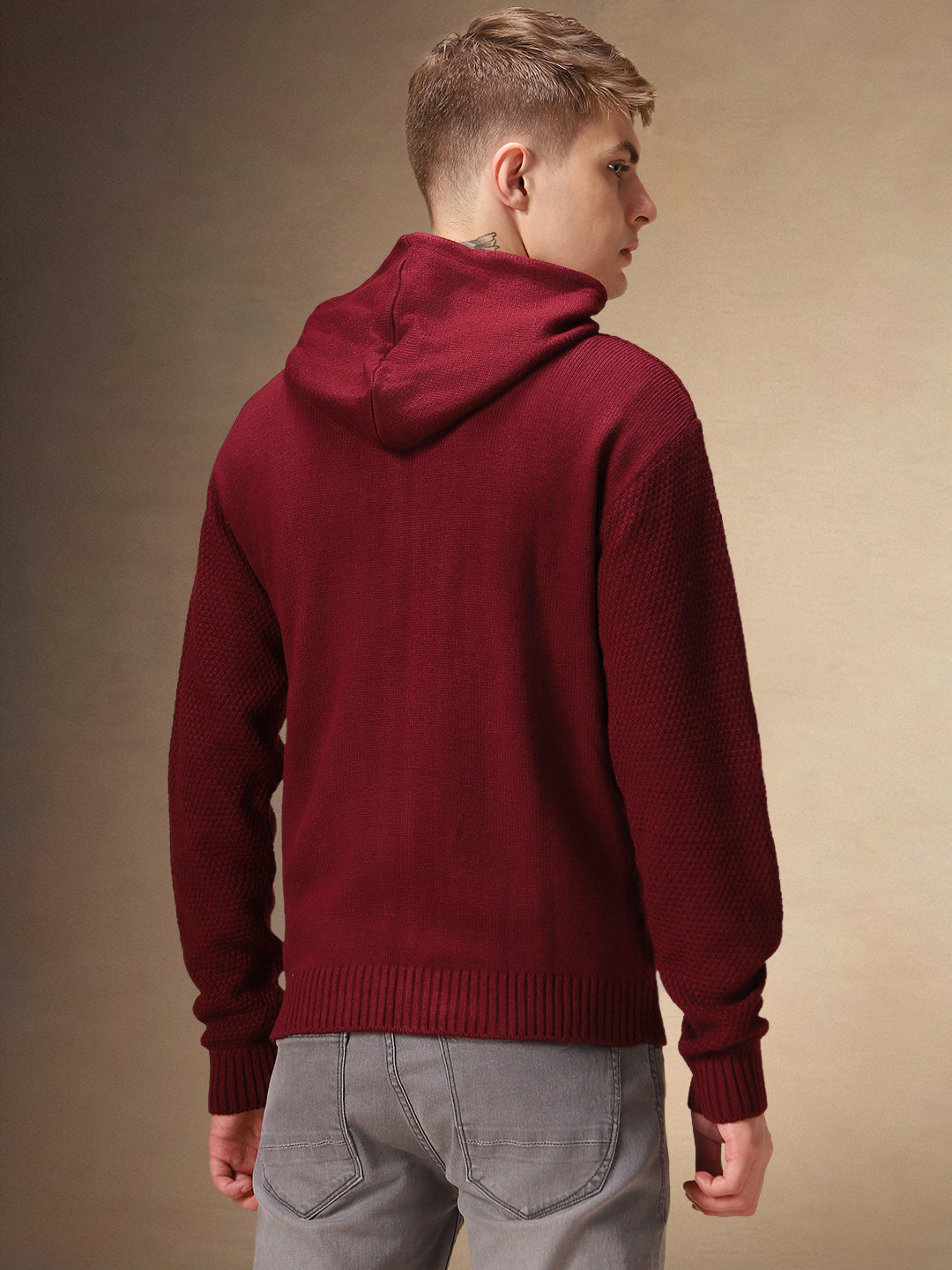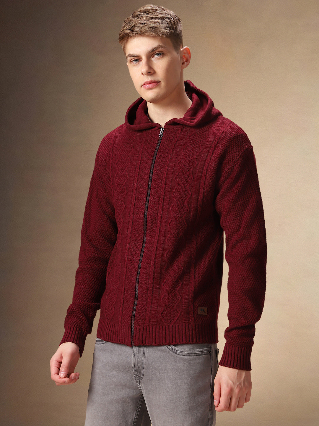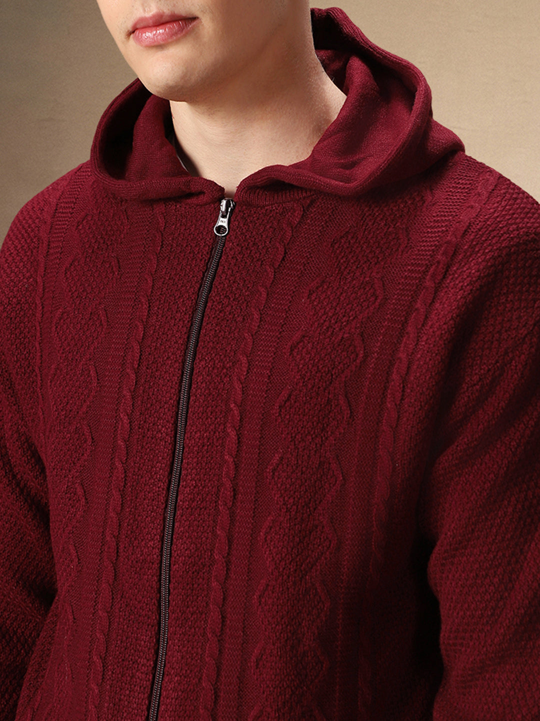 Men's Maroon Self Design Full Sleeves Hooded Cardigan Sweater