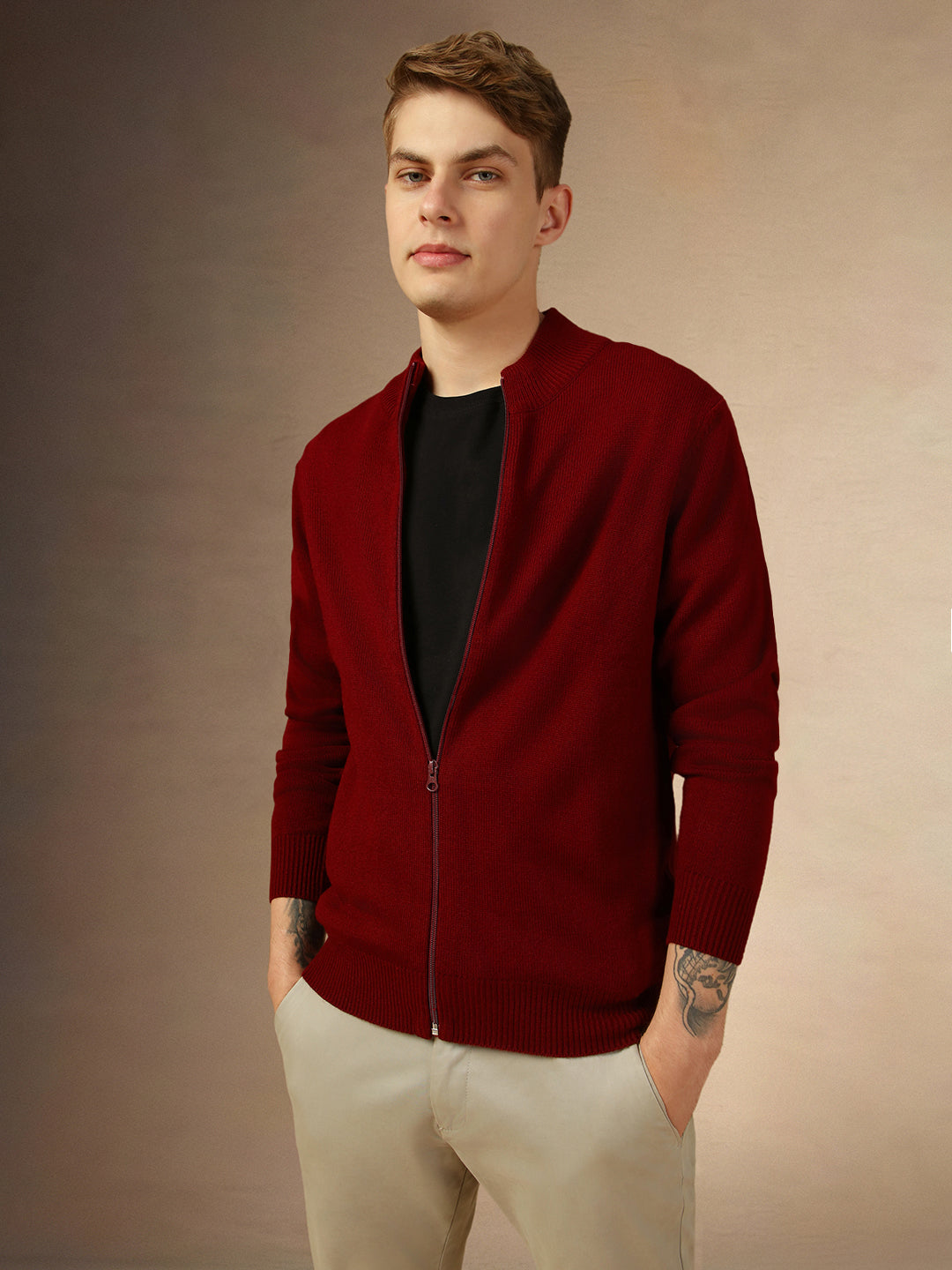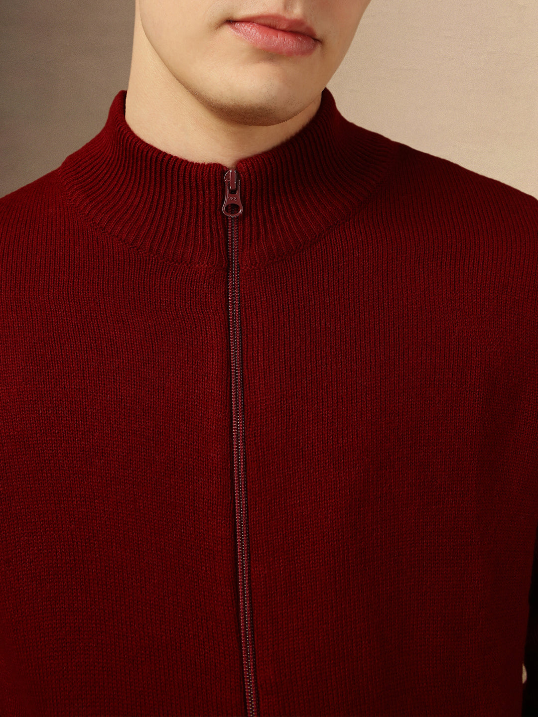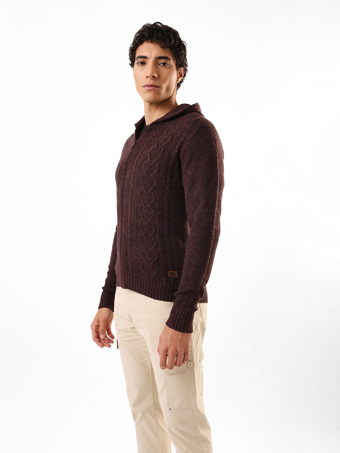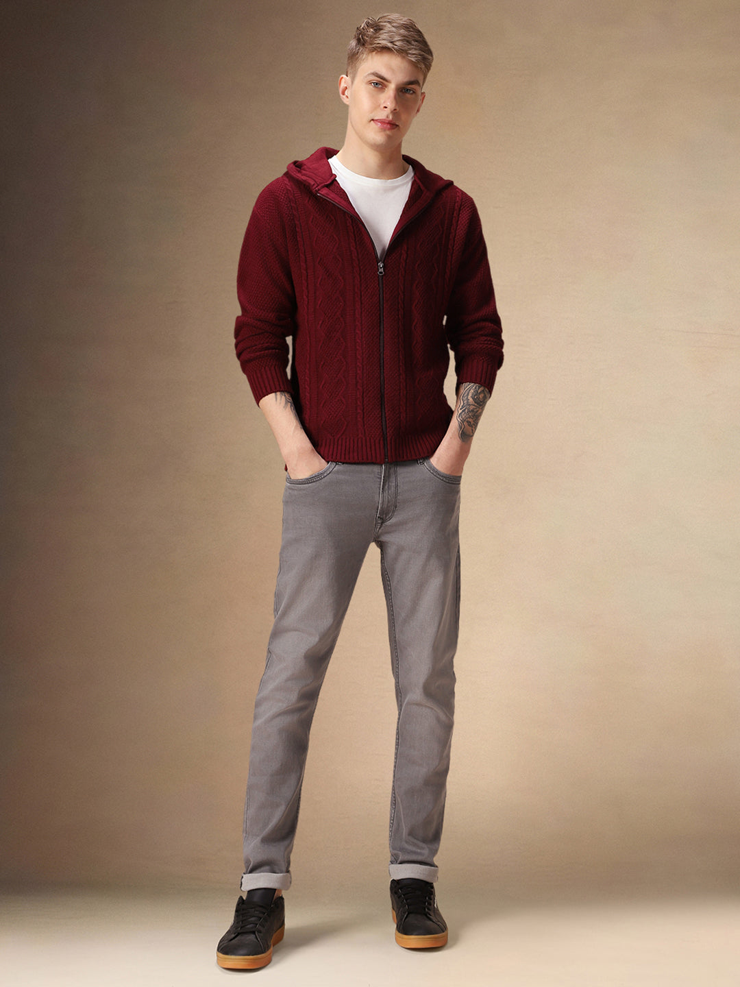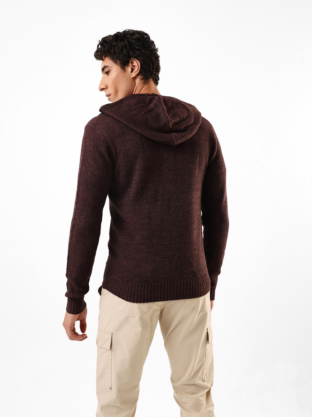 Men's Maroon Self Design Full Sleeves Hooded Cardigan Sweater