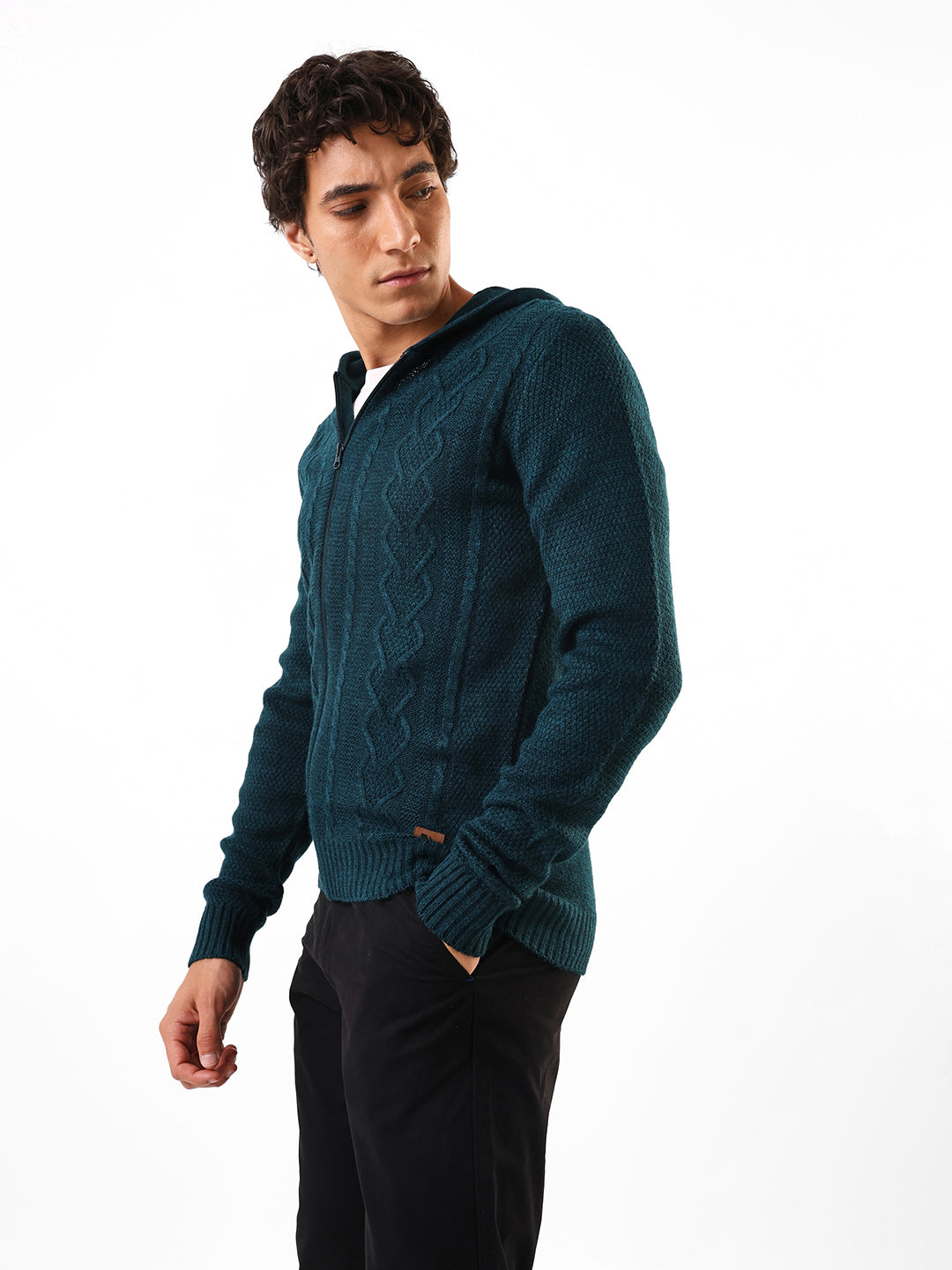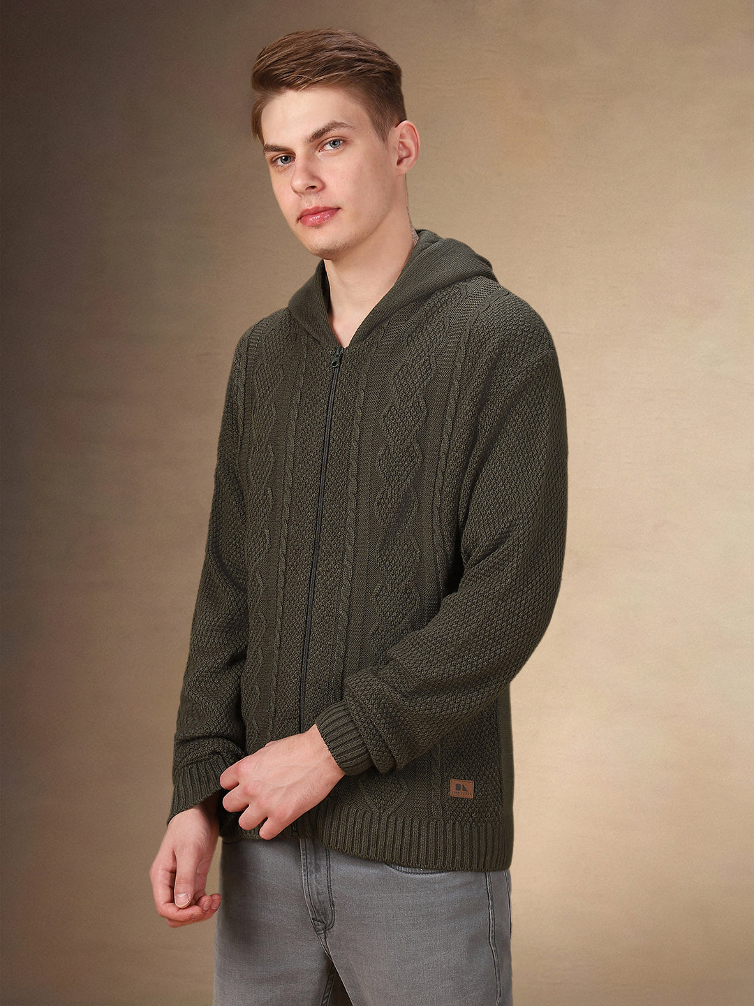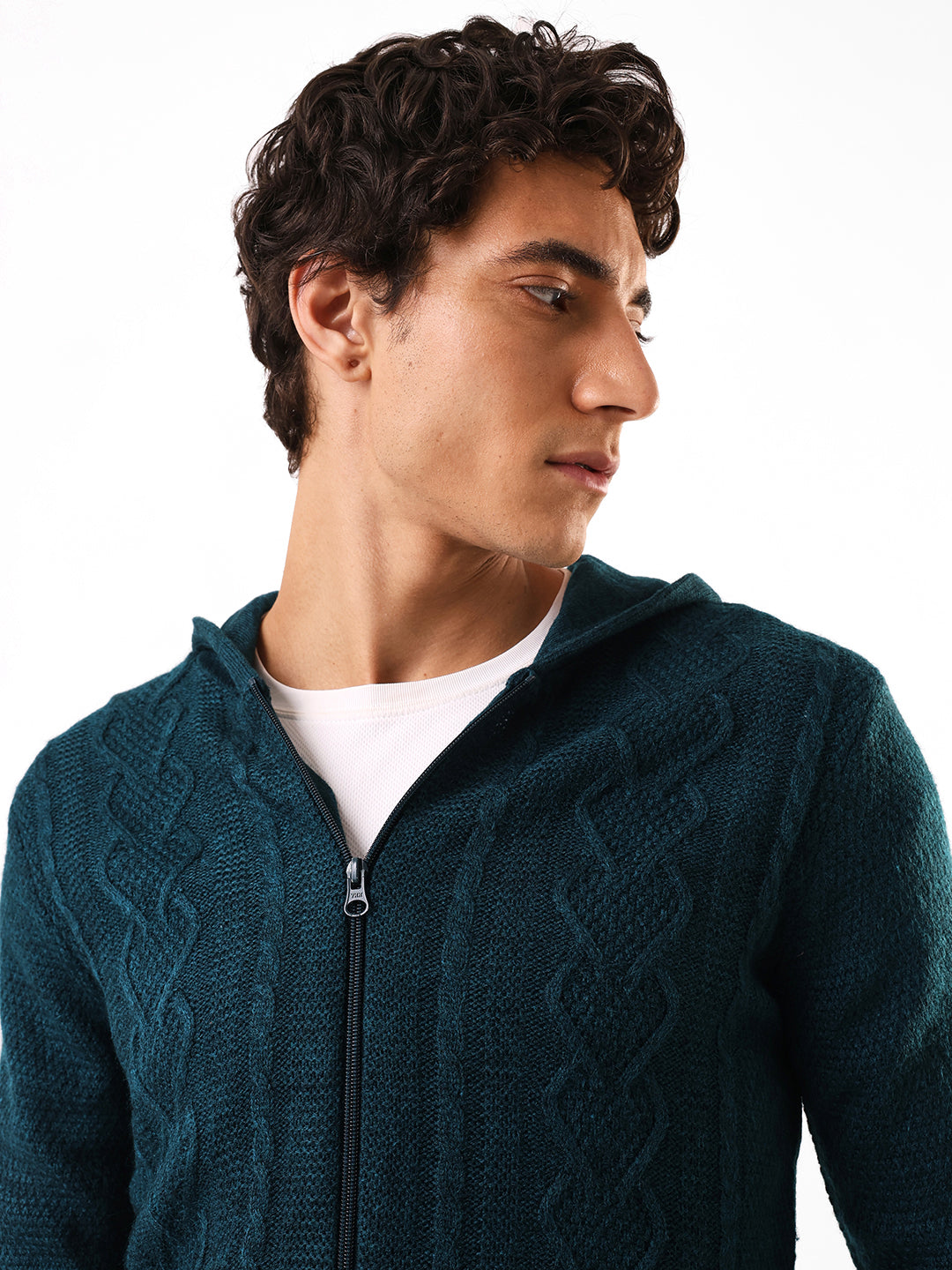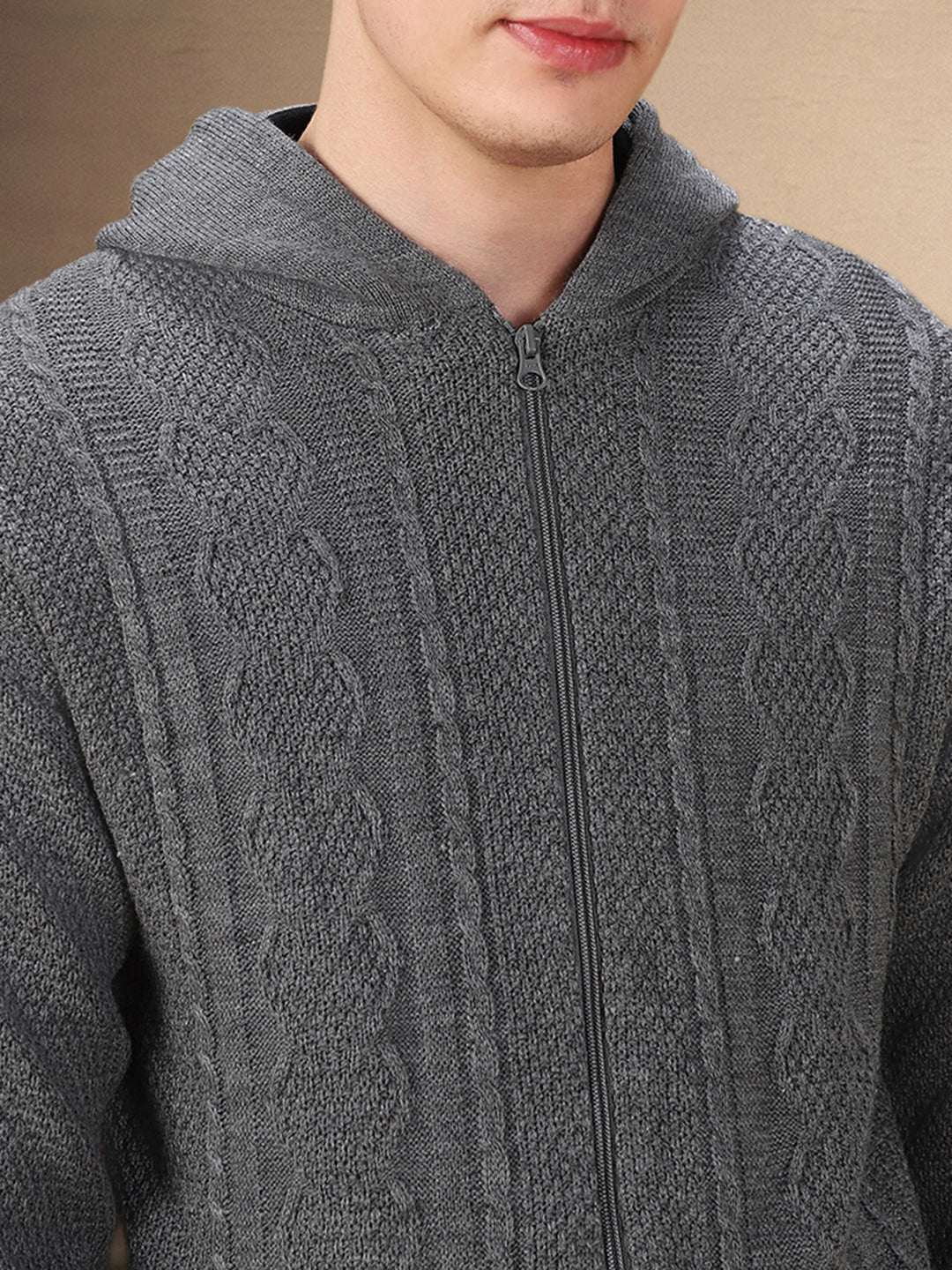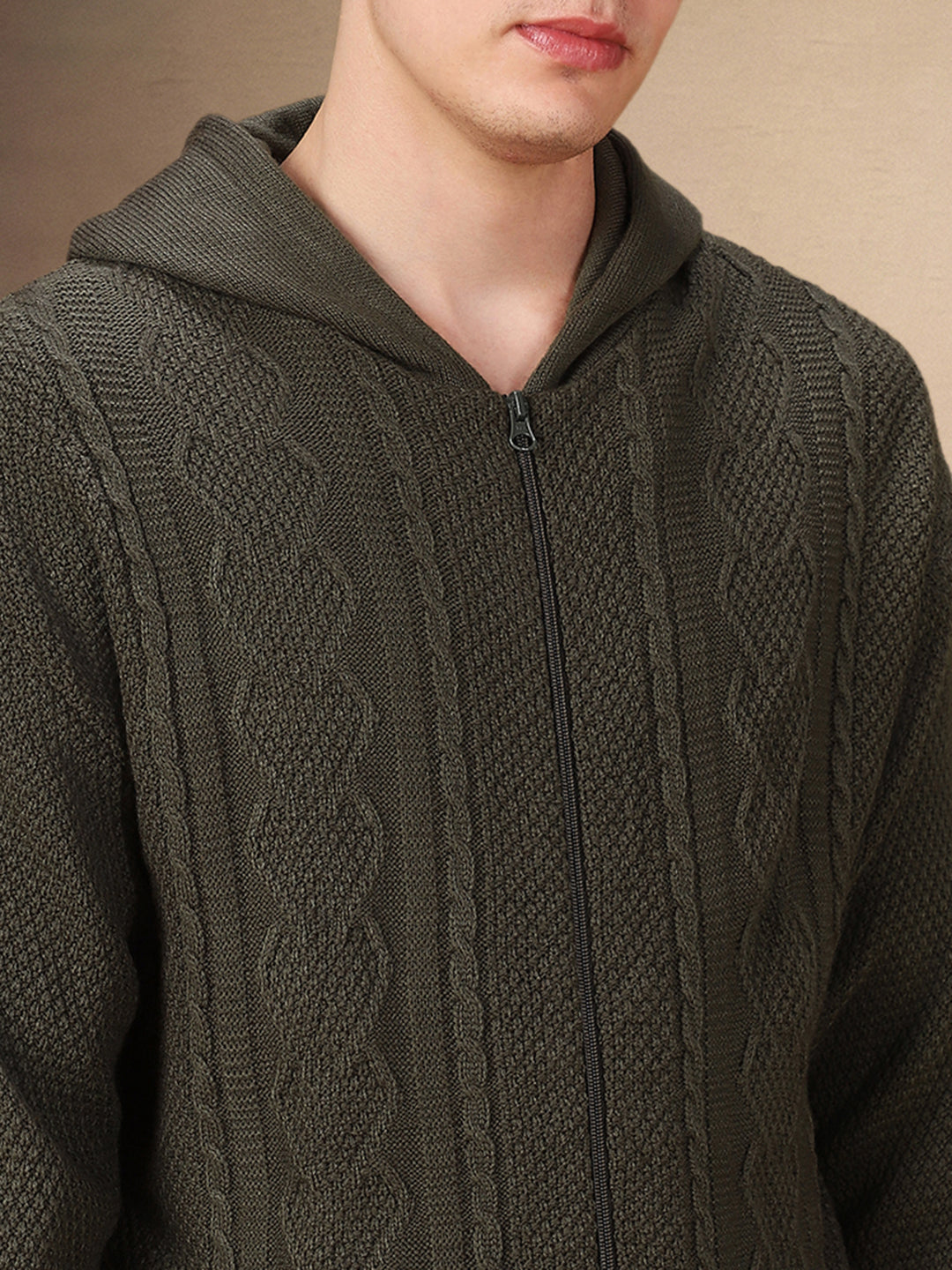 Men's Solid Cable Knit Hooded Front-Open Sweater