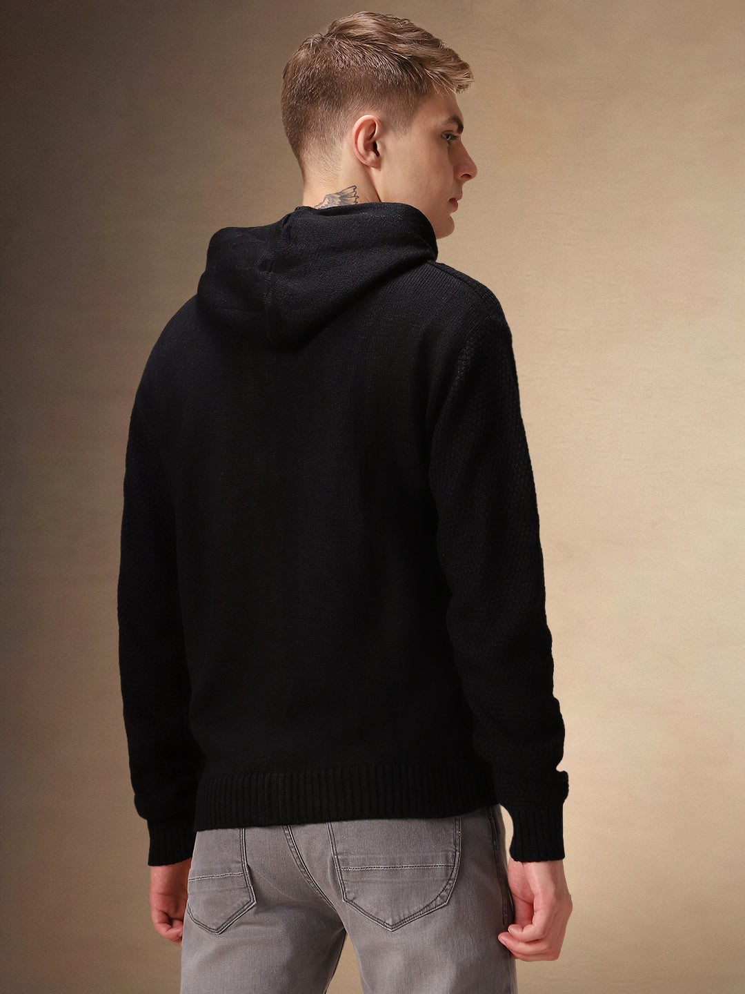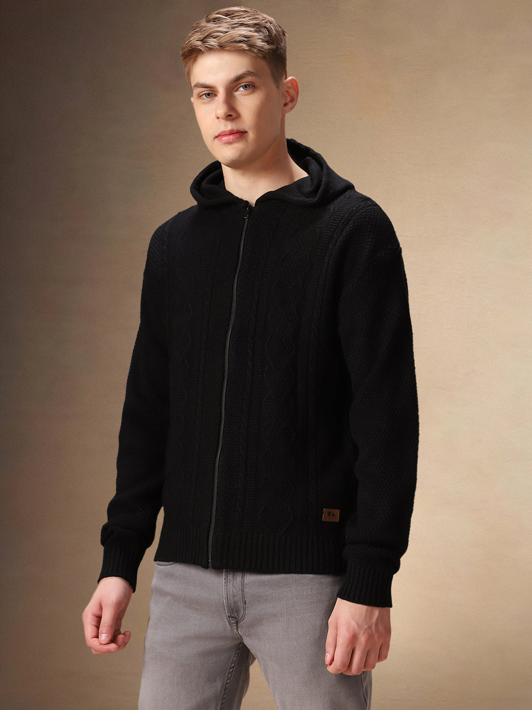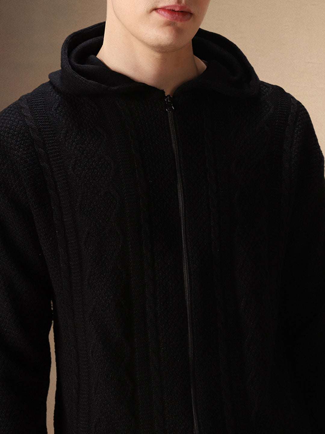 Men's Black Self Design Full Sleeves Hooded Cardigan Sweater