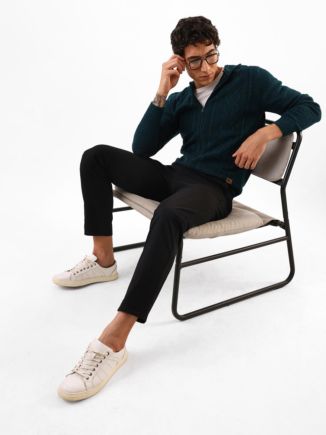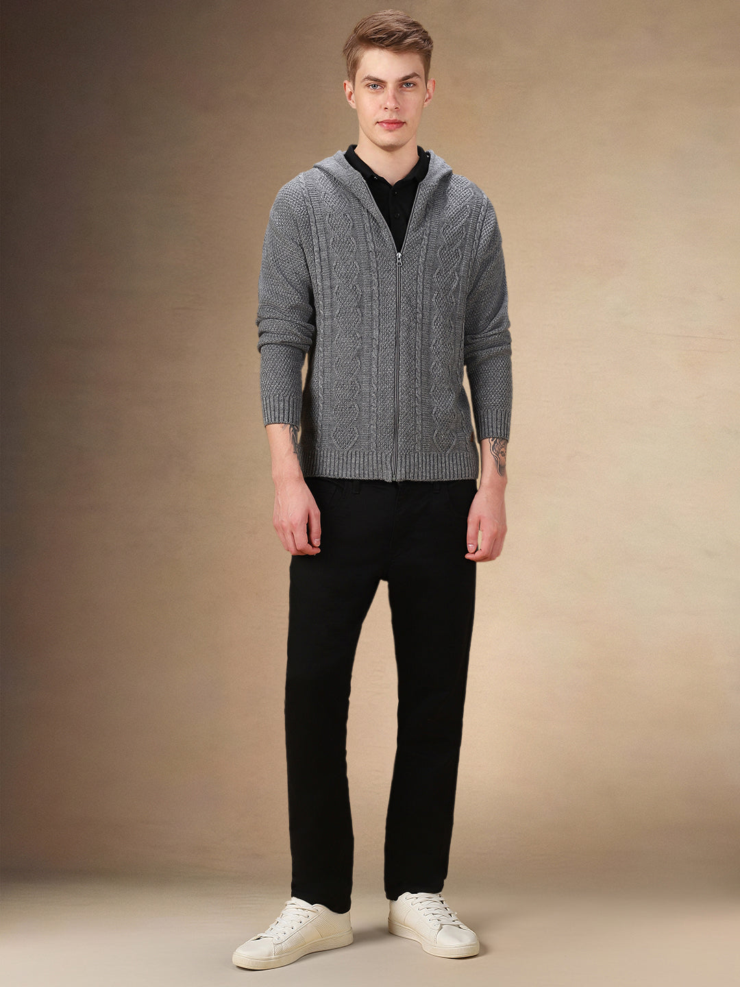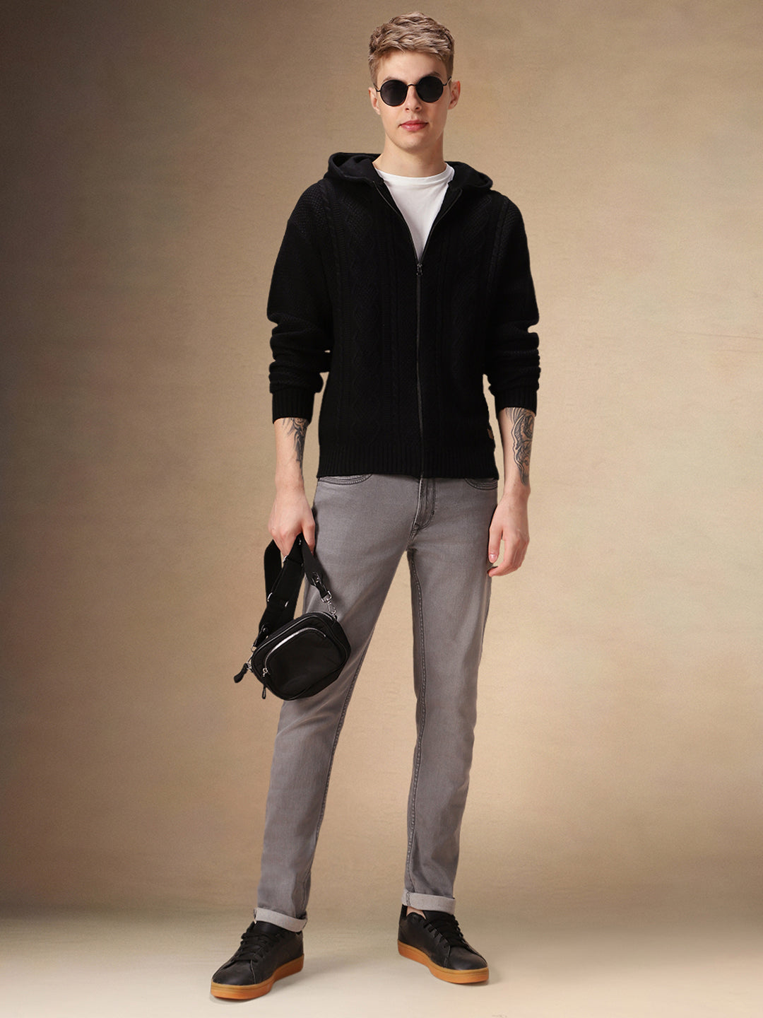 Men's Black Self Design Full Sleeves Hooded Cardigan Sweater