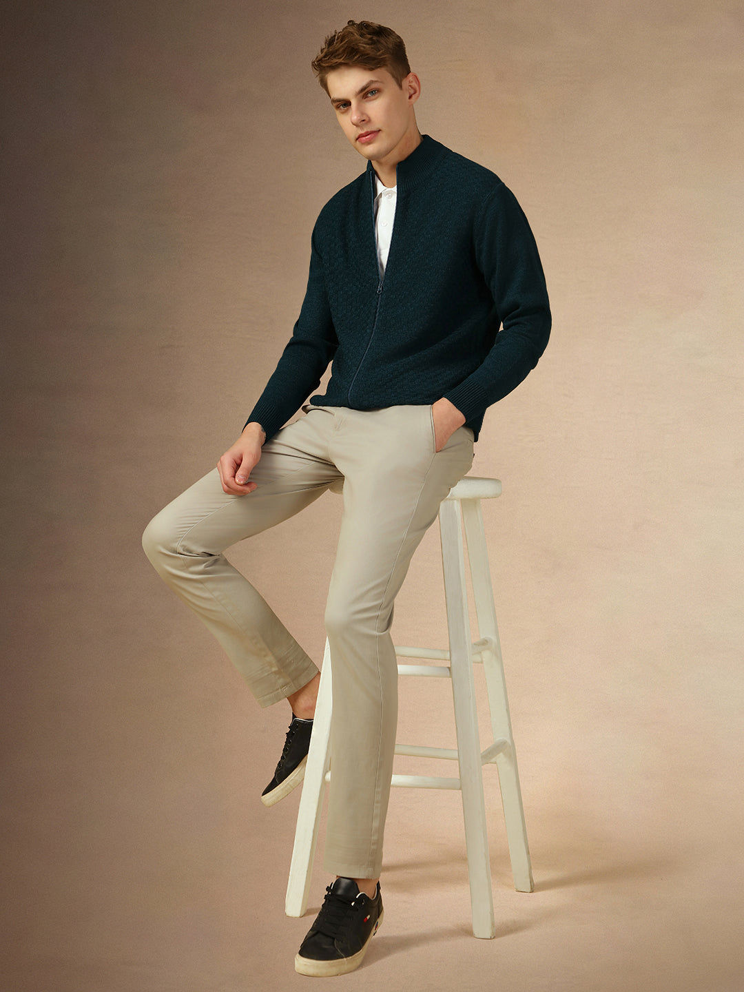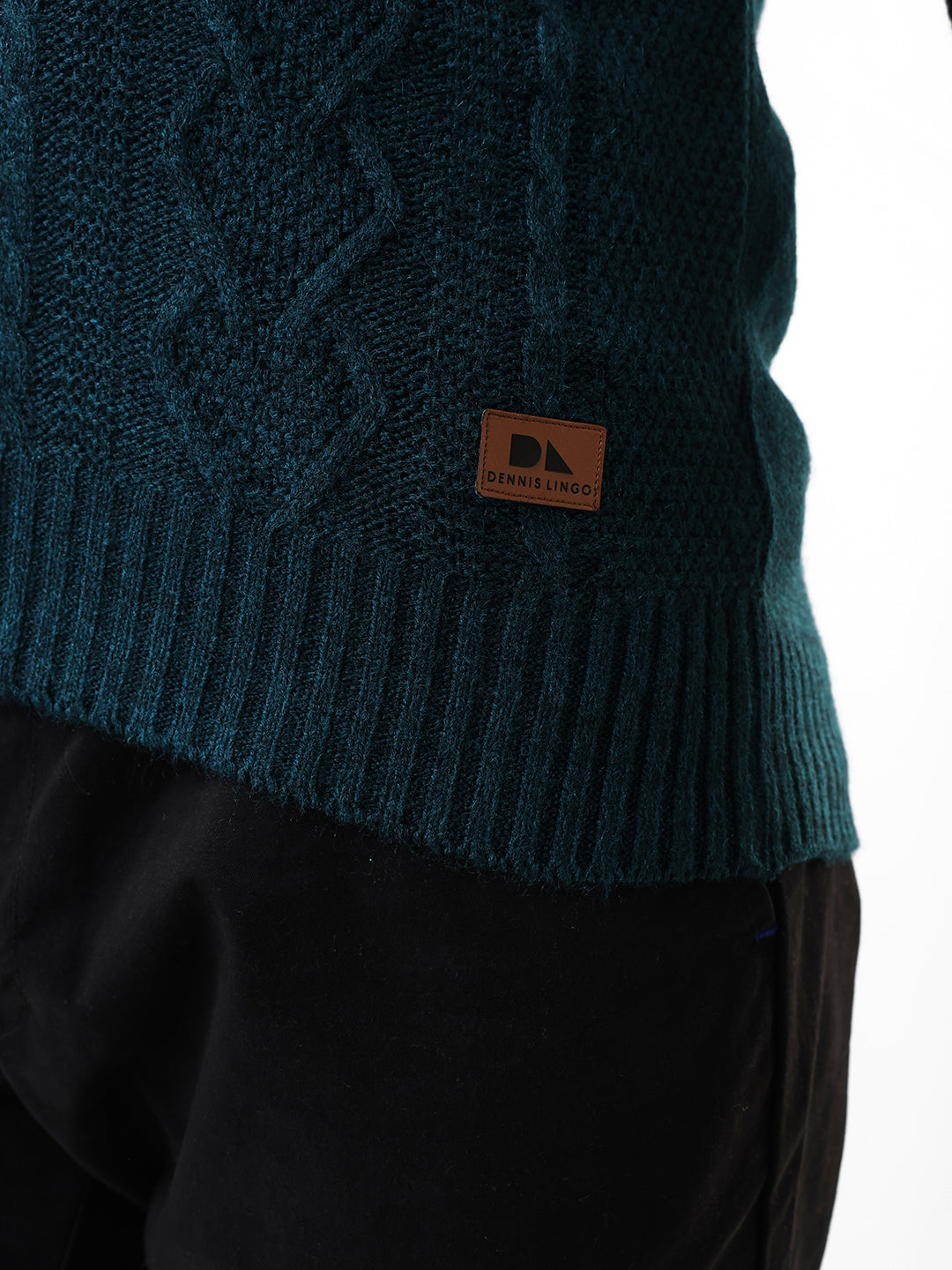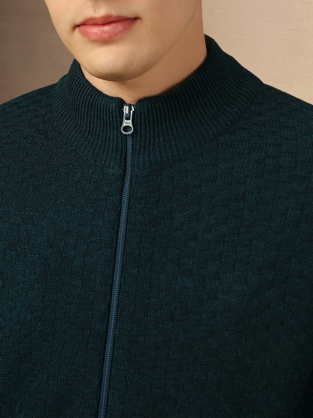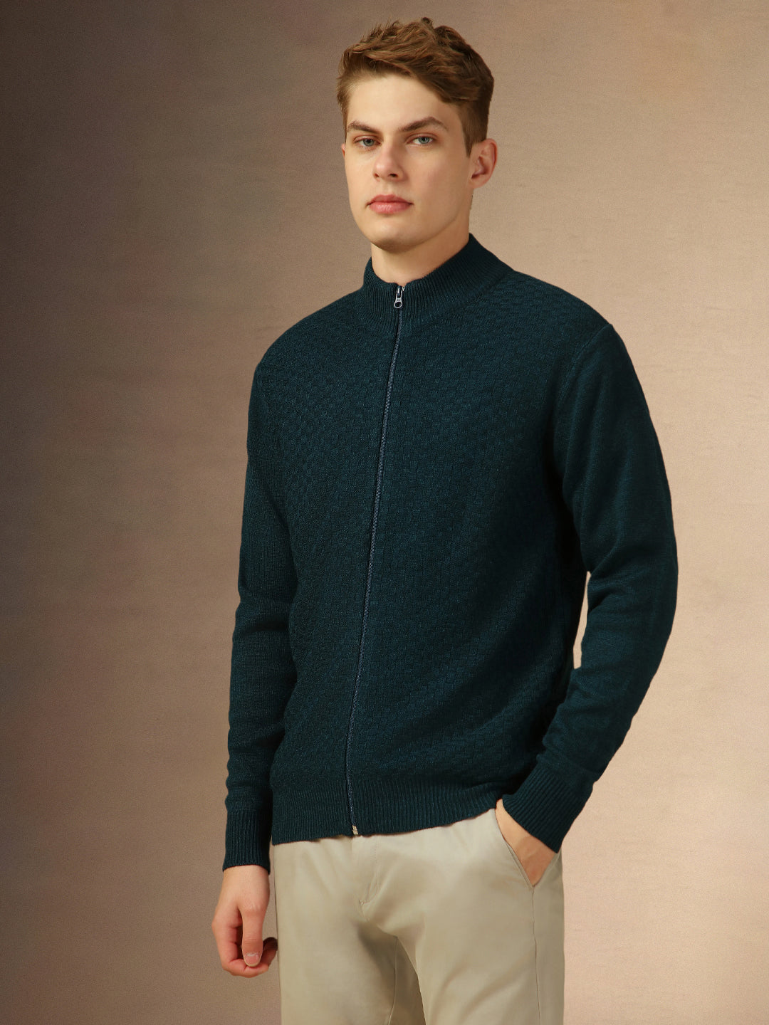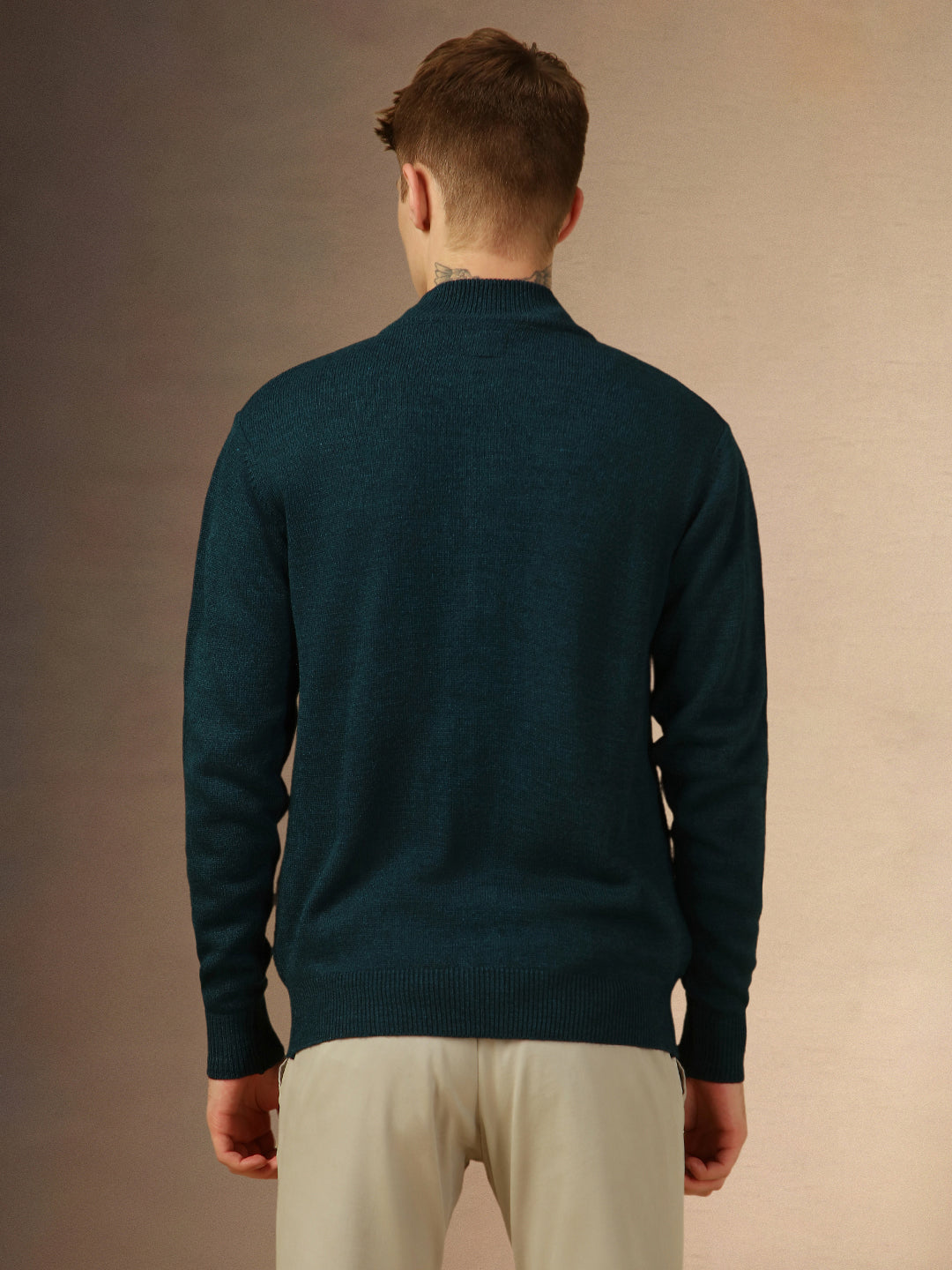 Men's Teal Mock Neck Full Sleeves Slim Fit Pullover Sweater