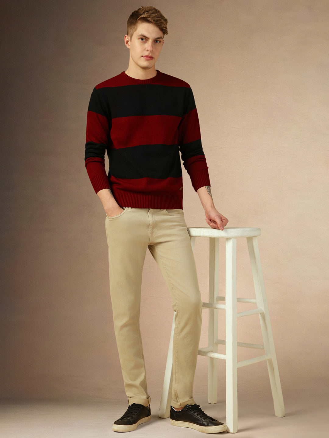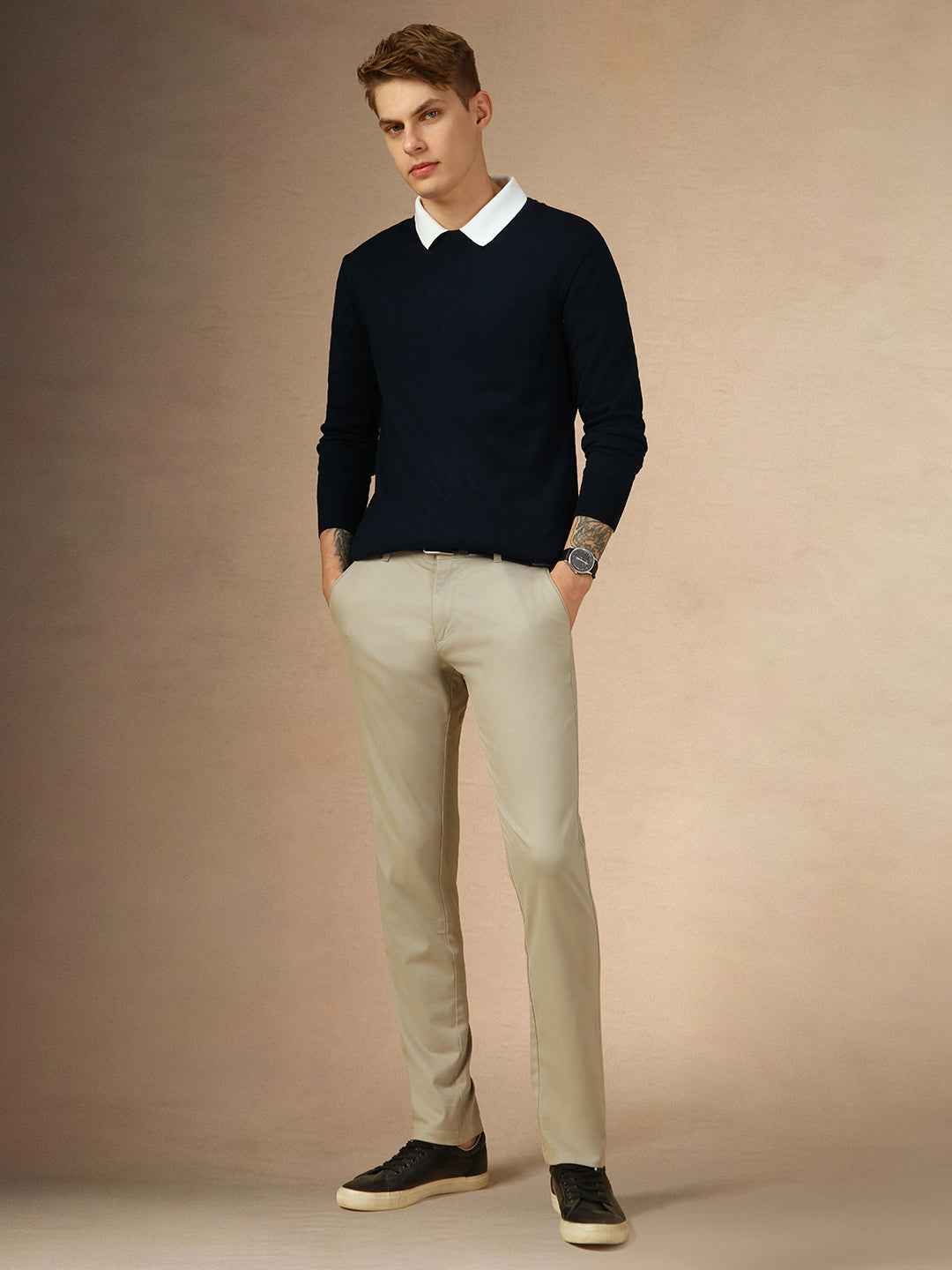 Men's Beige Crew Neck Full Sleeves Slim Fit Pullover Sweater
