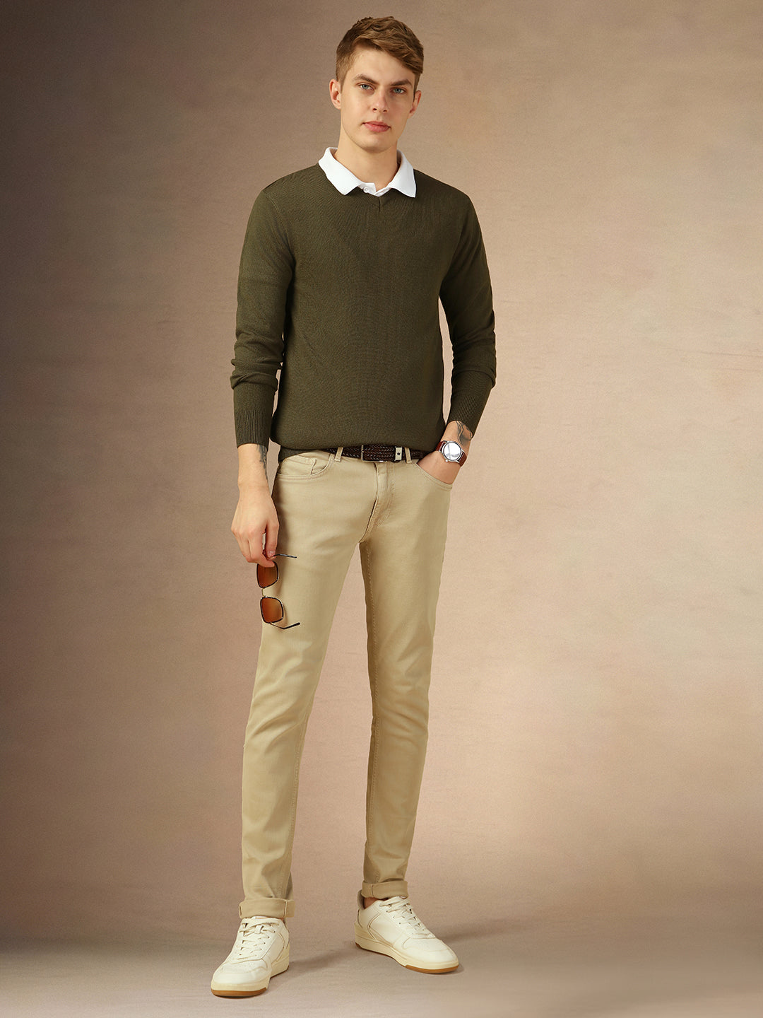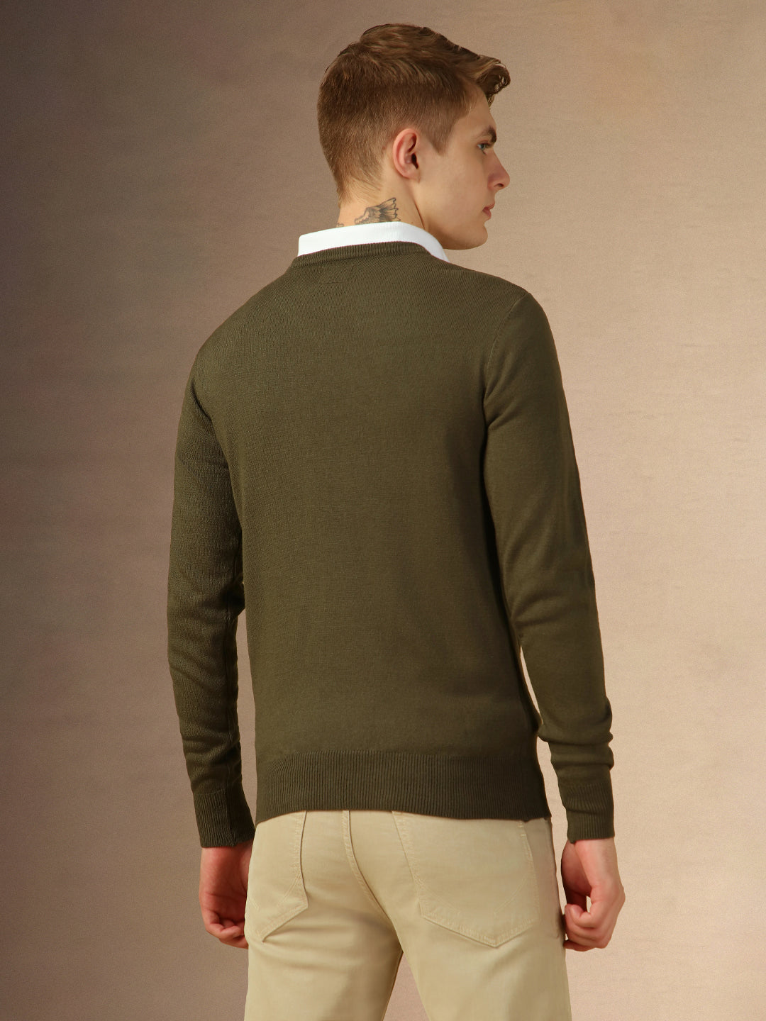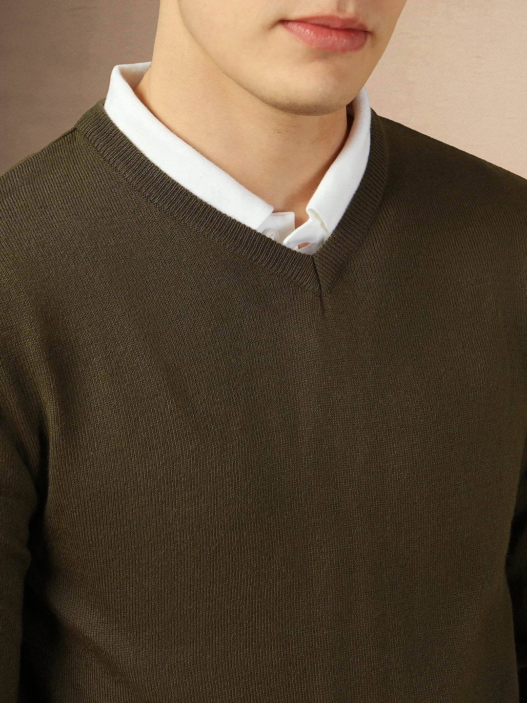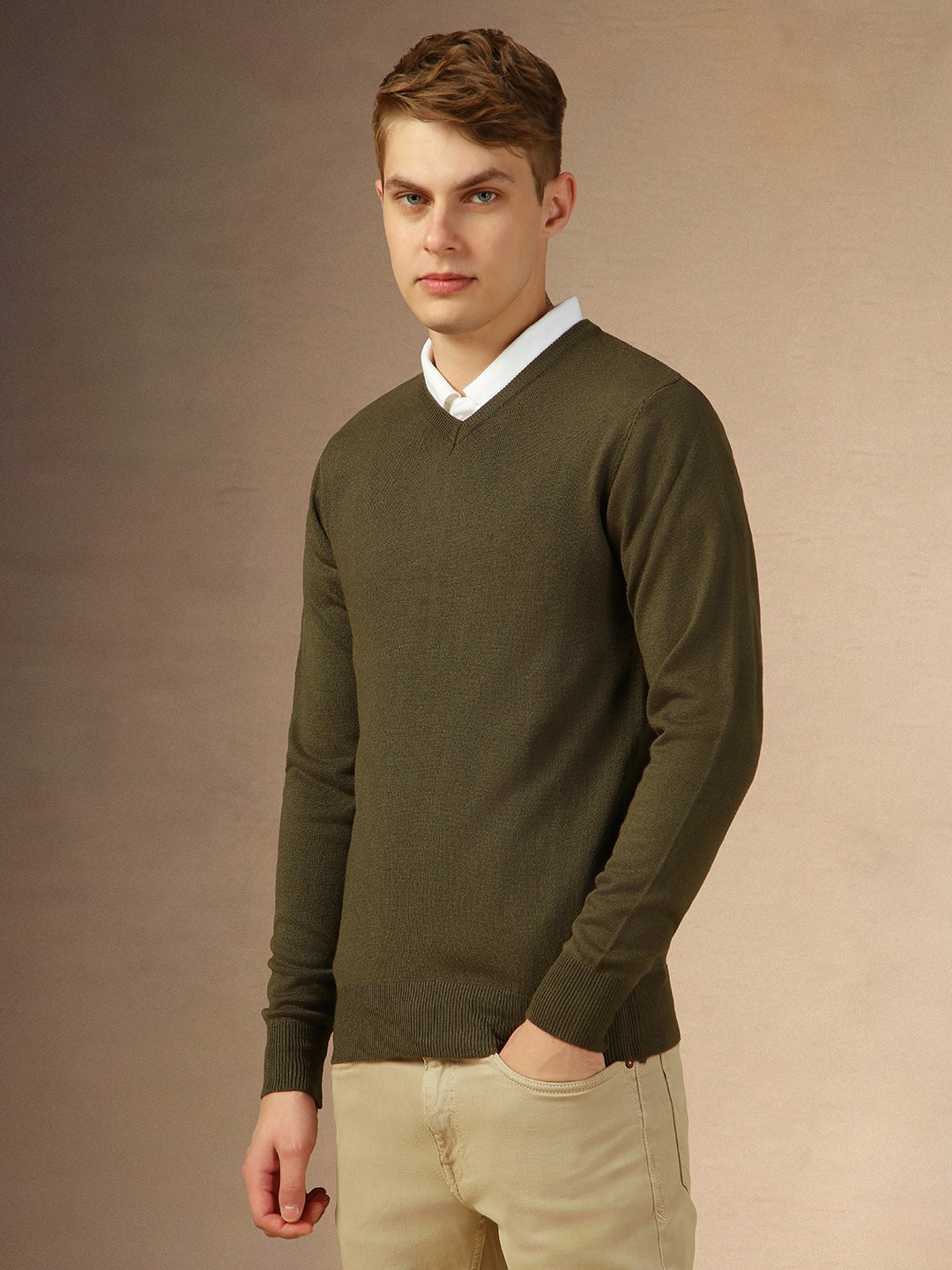 Men's Olive V-Neck Full Sleeves Slim Fit Pullover Sweater
