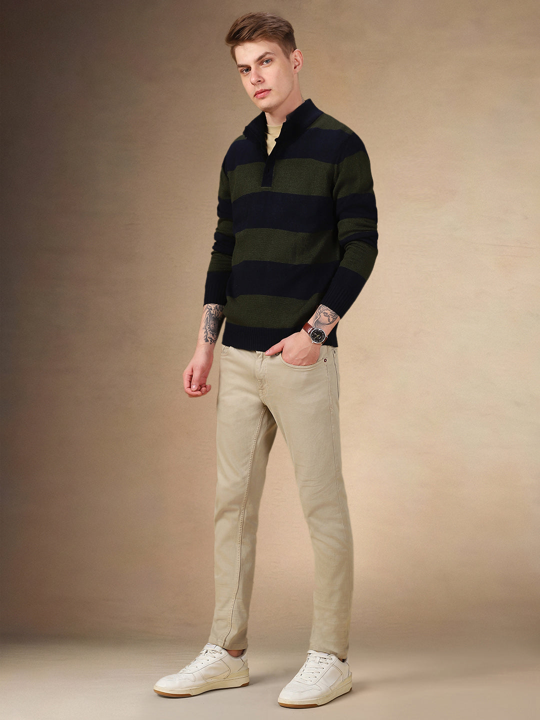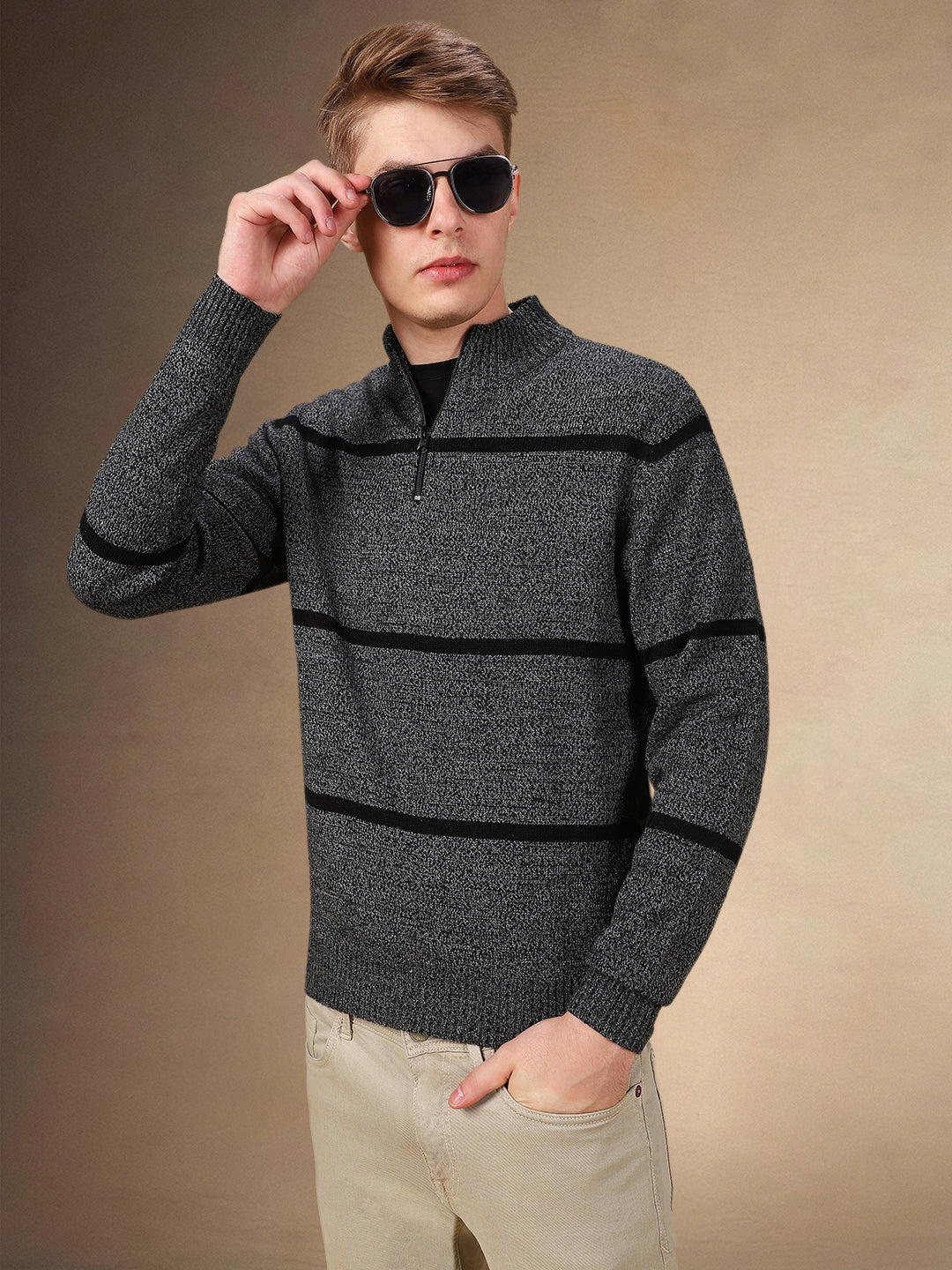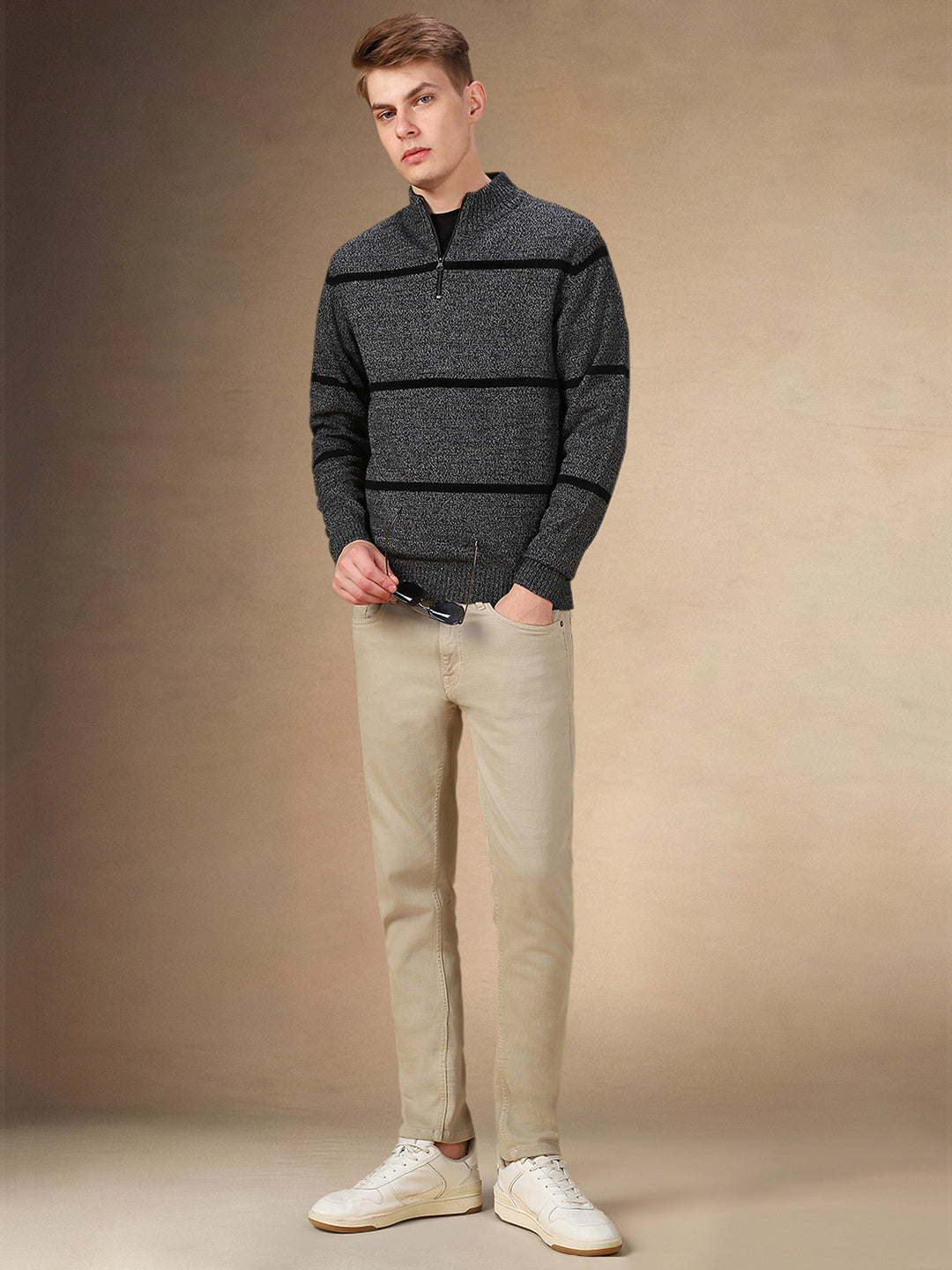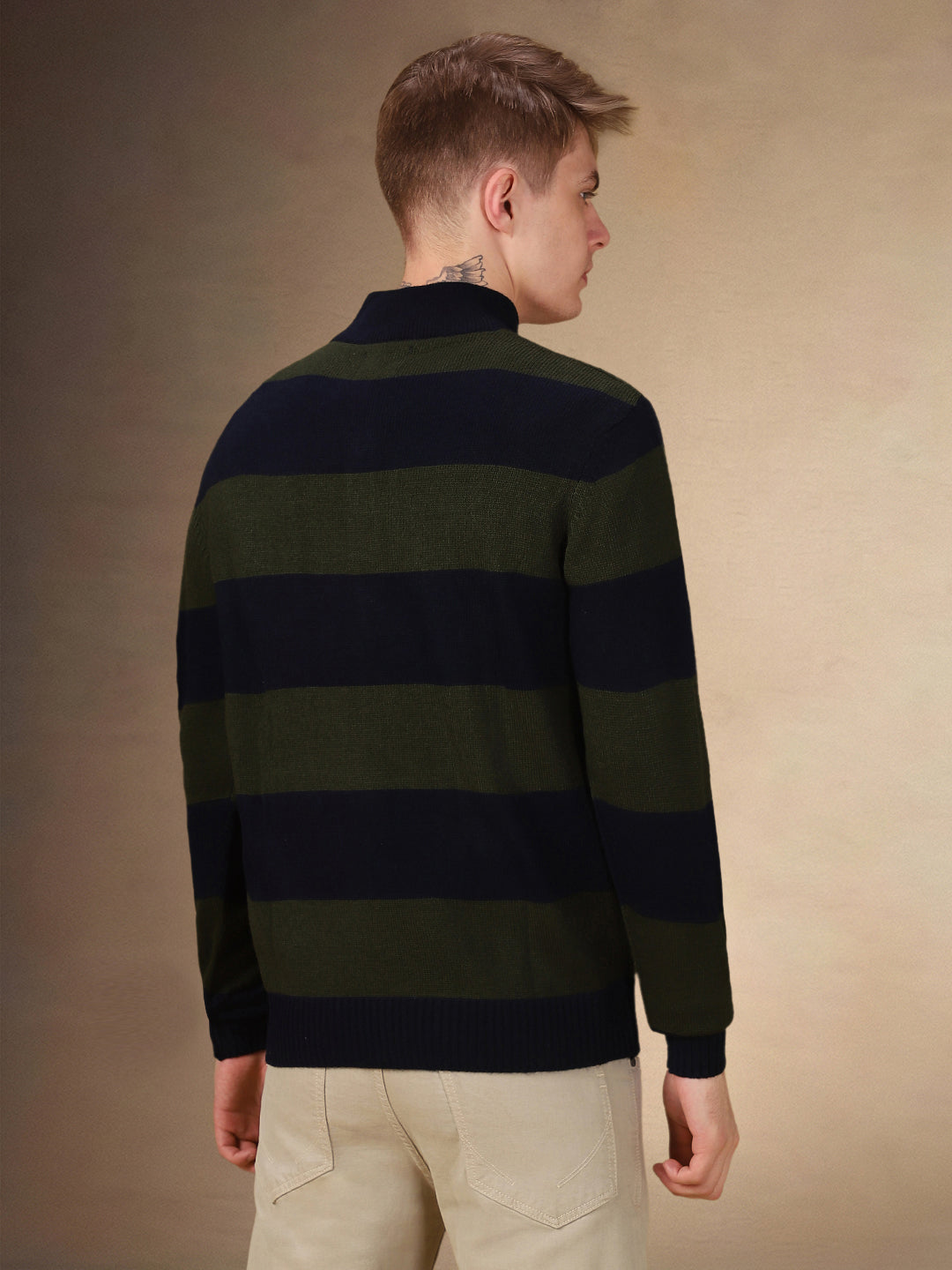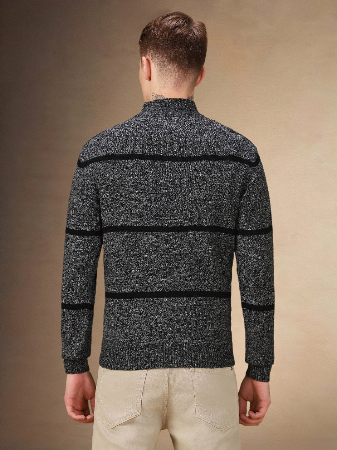 Men's Striped Mock Neck Full Sleeves Regular Fit Sweater