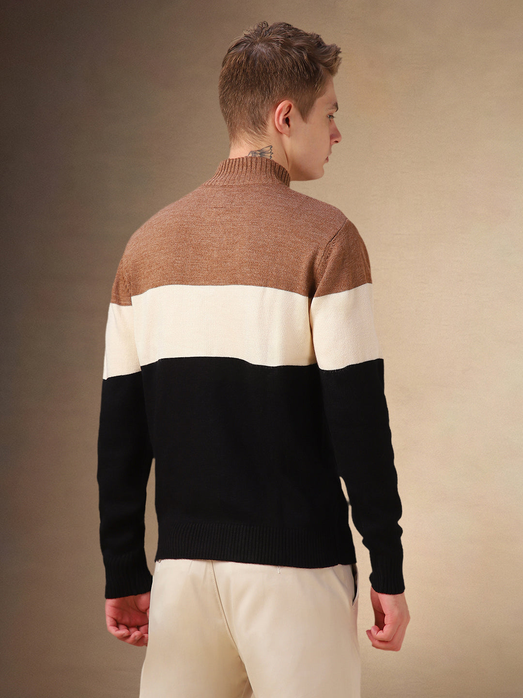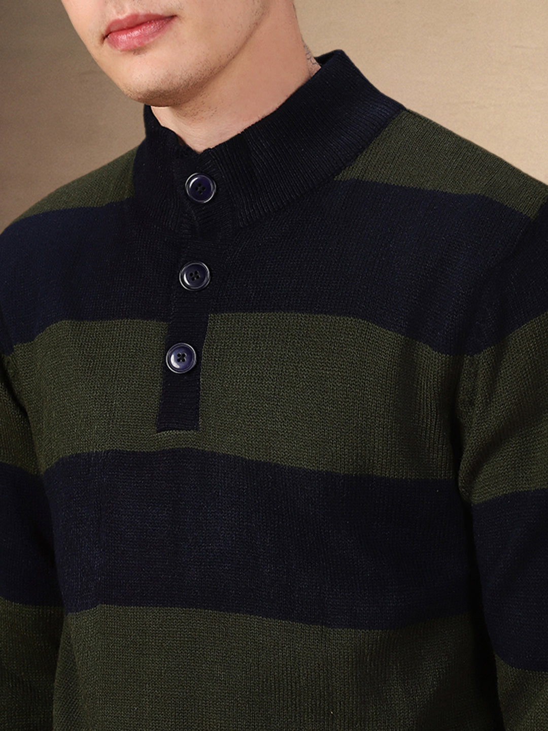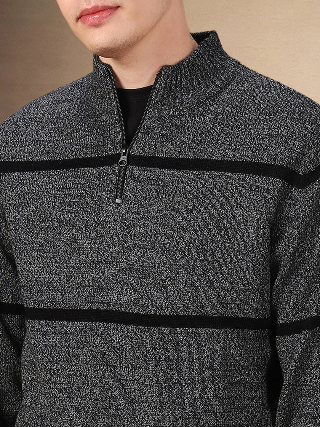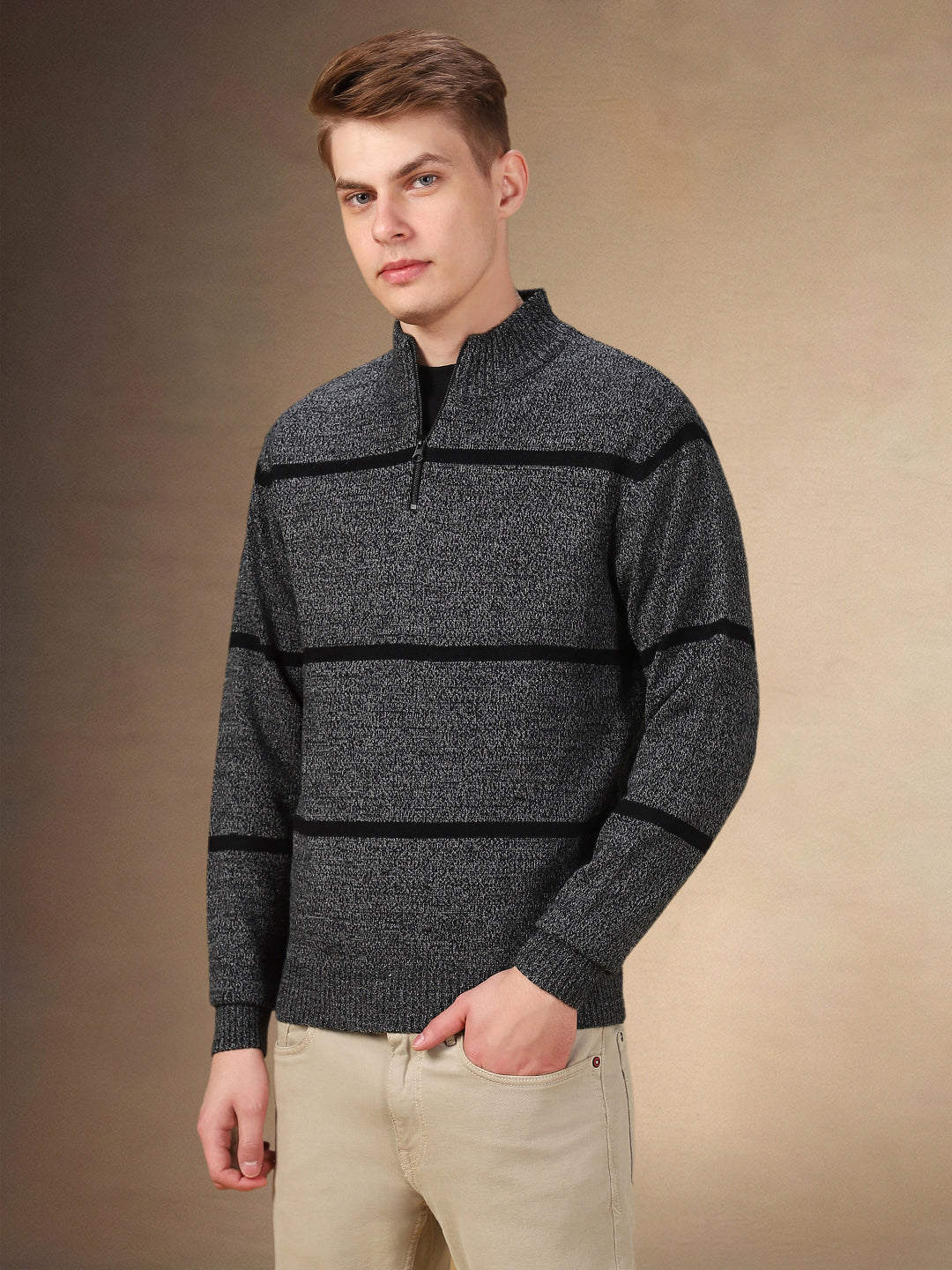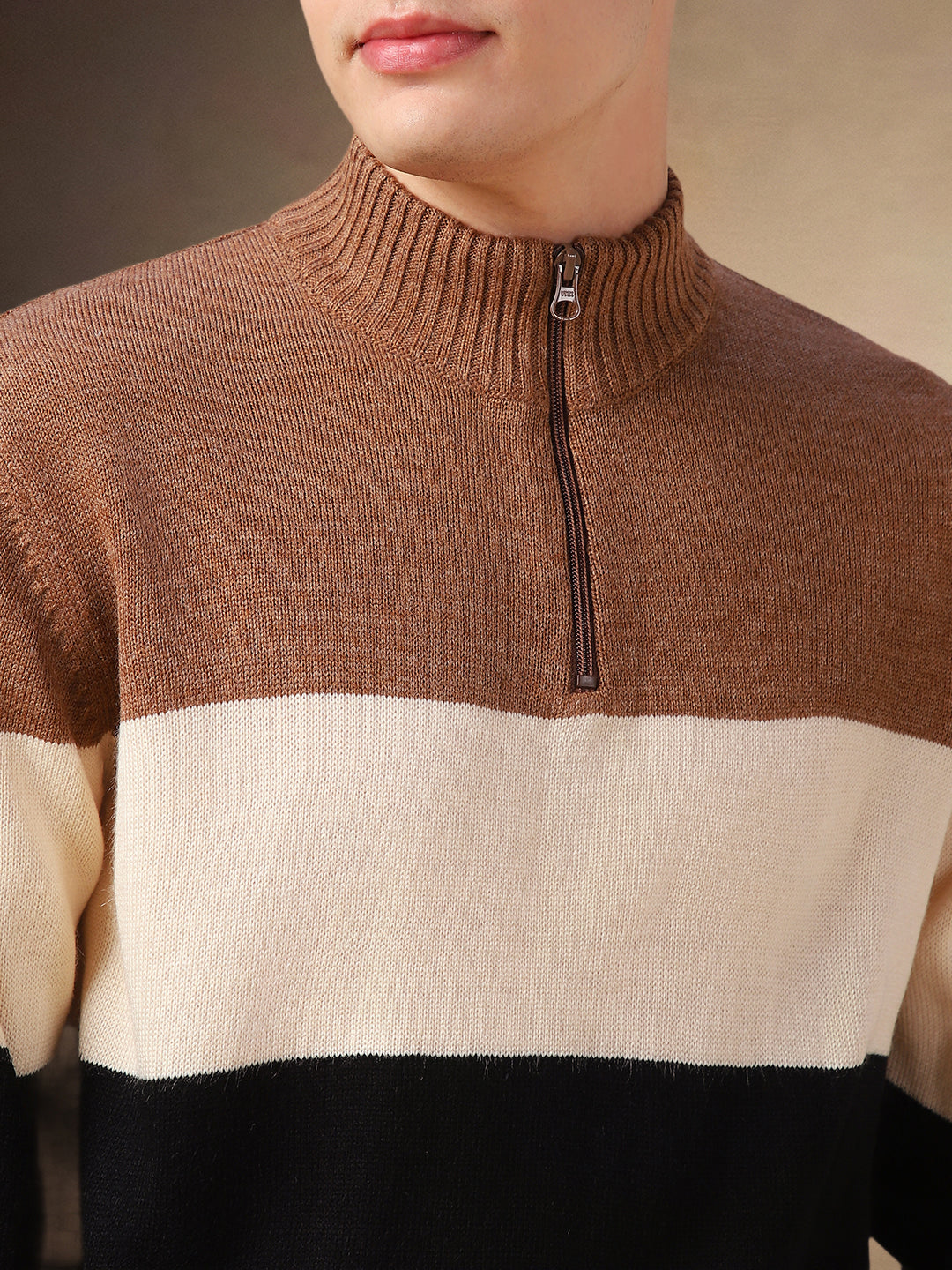 Men's Striped Mock Neck Full Sleeves Regular Fit Sweater