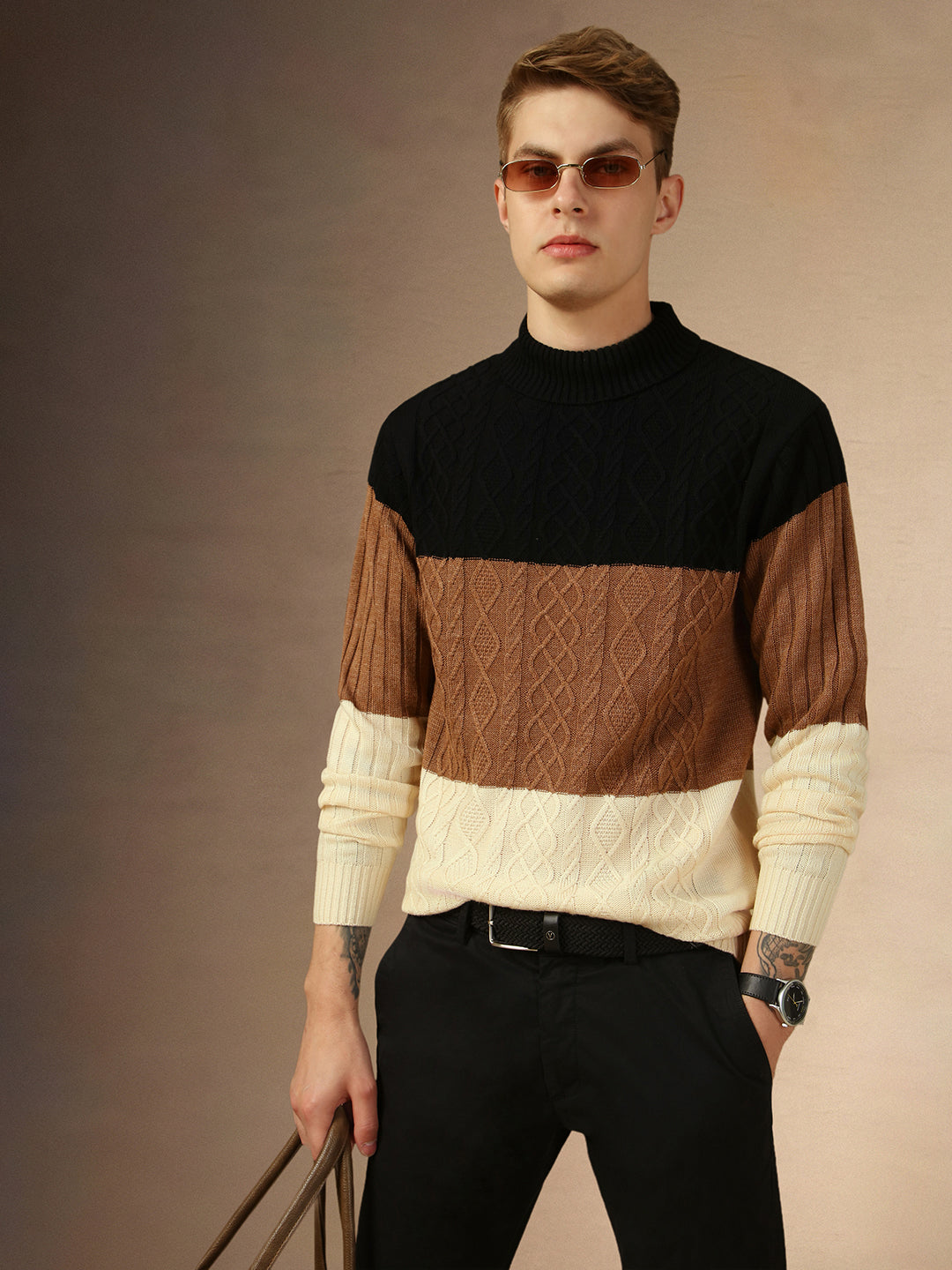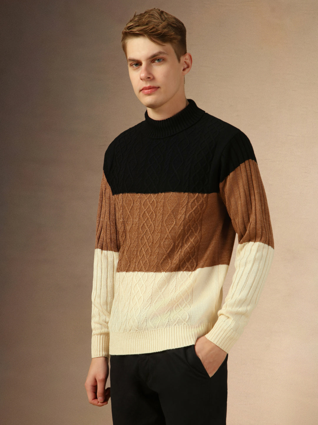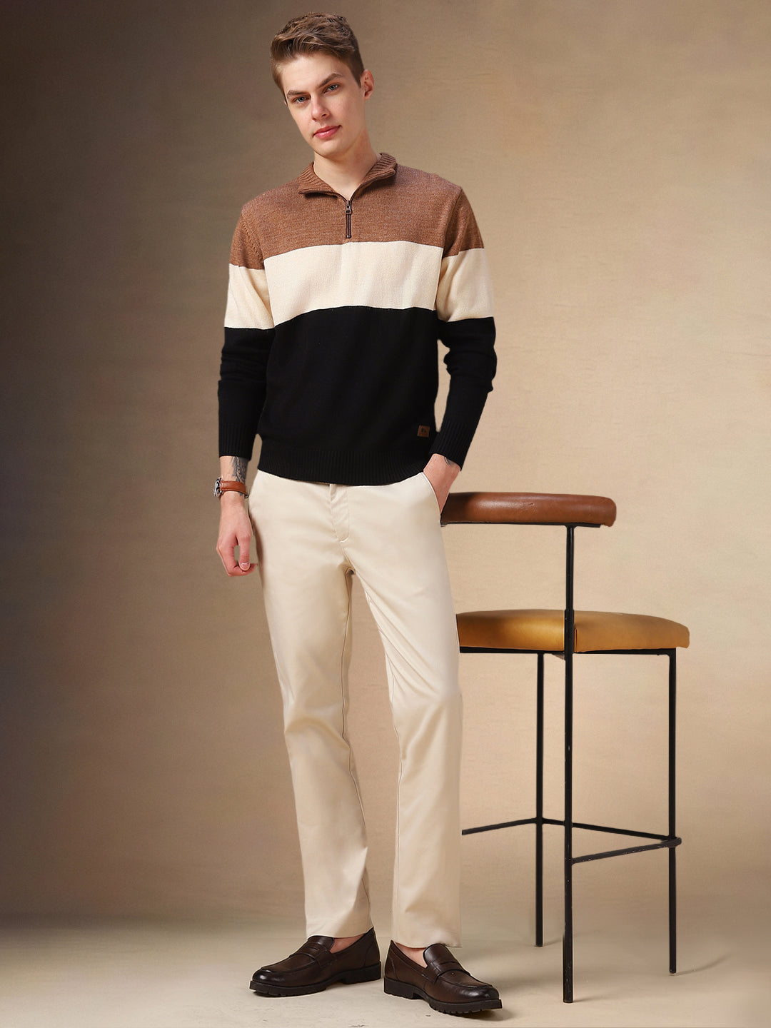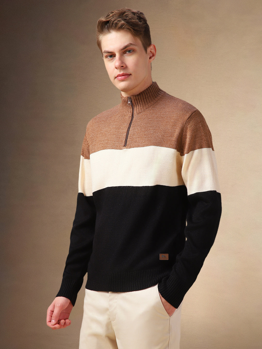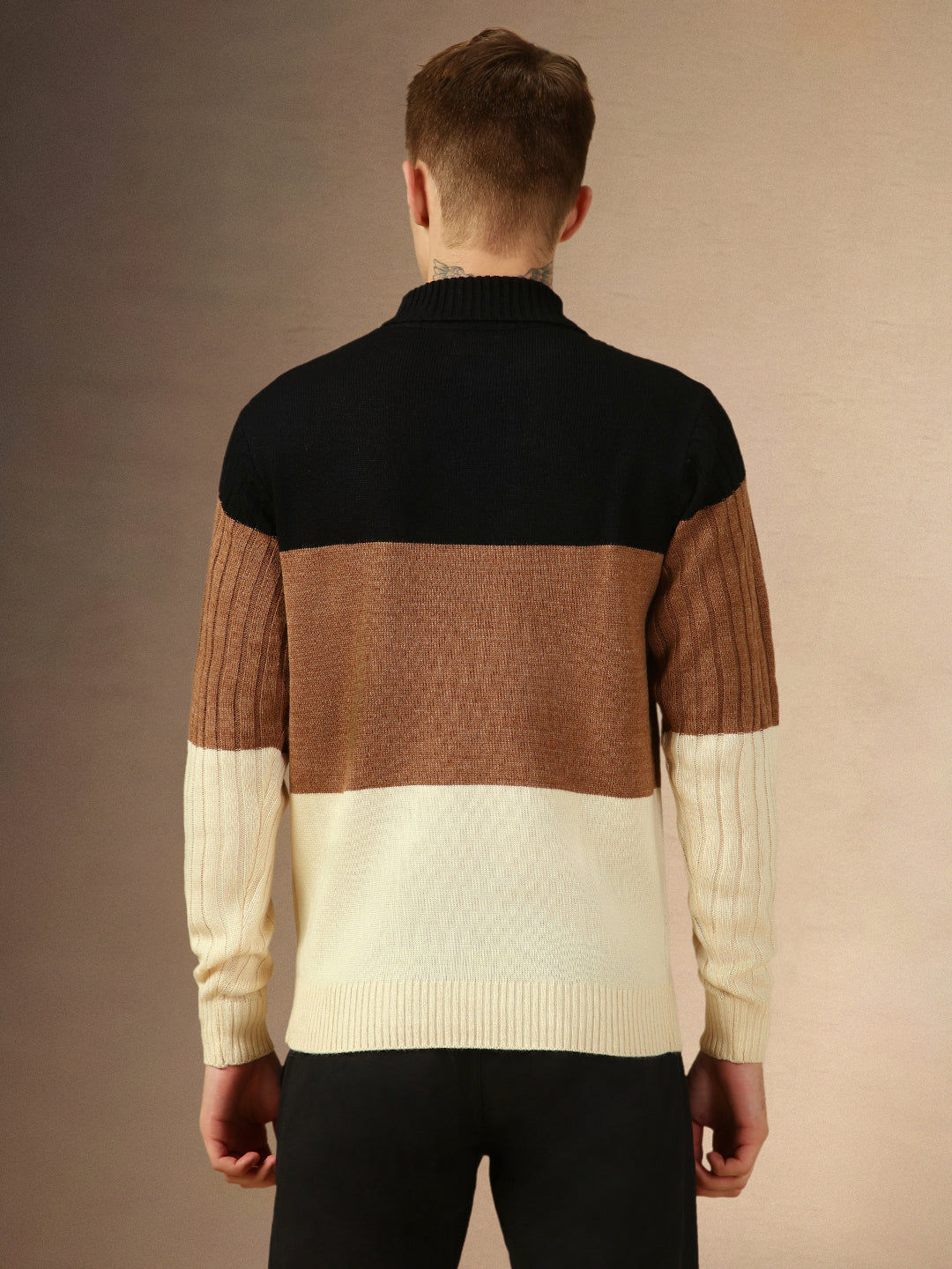 Men's Striped Mock Neck Full Sleeves Regular Fit Sweater
